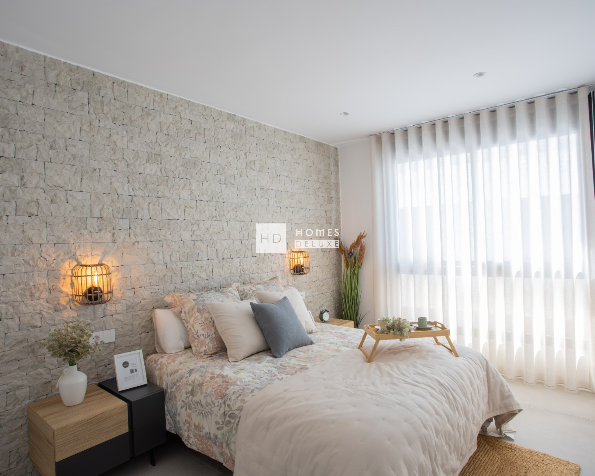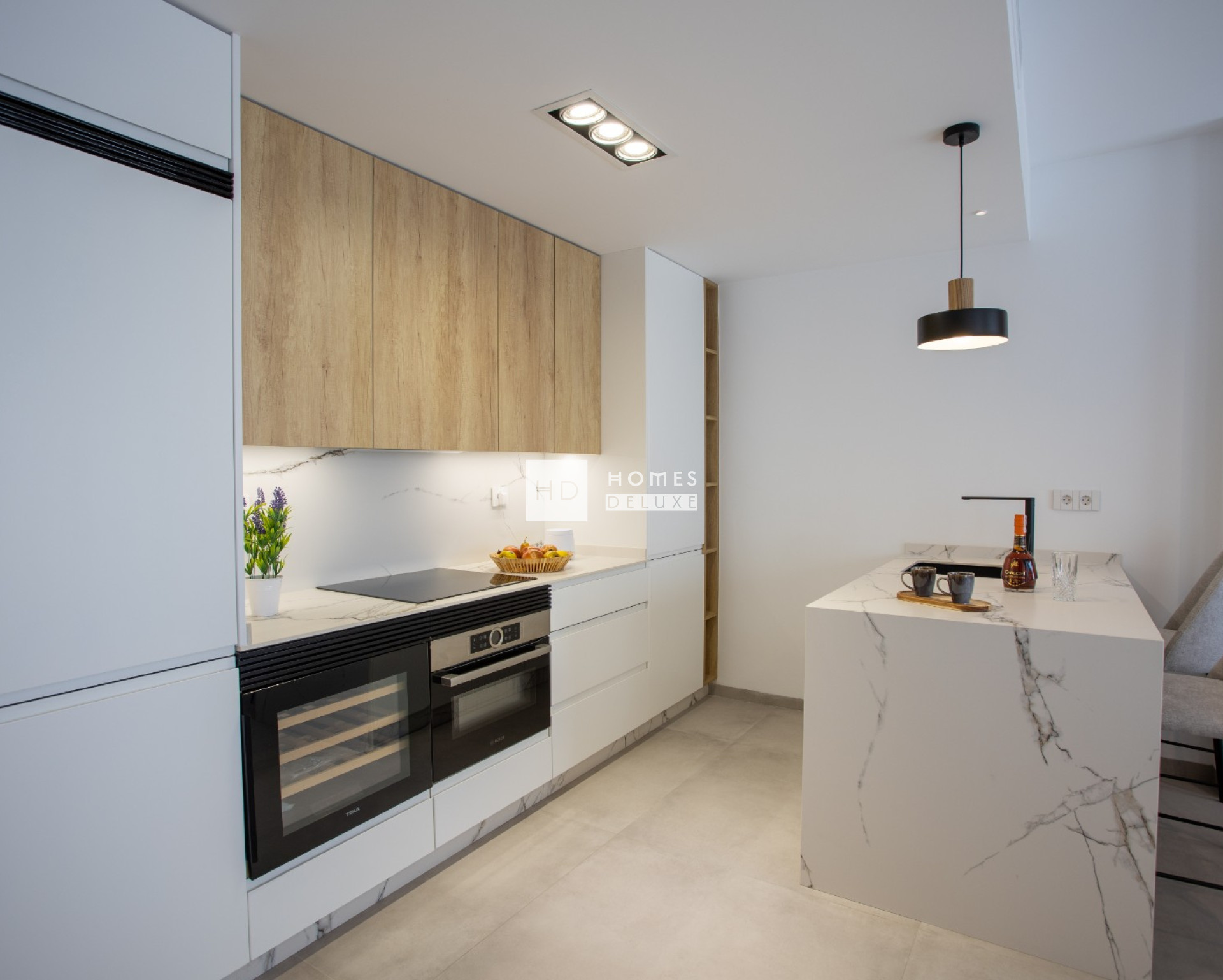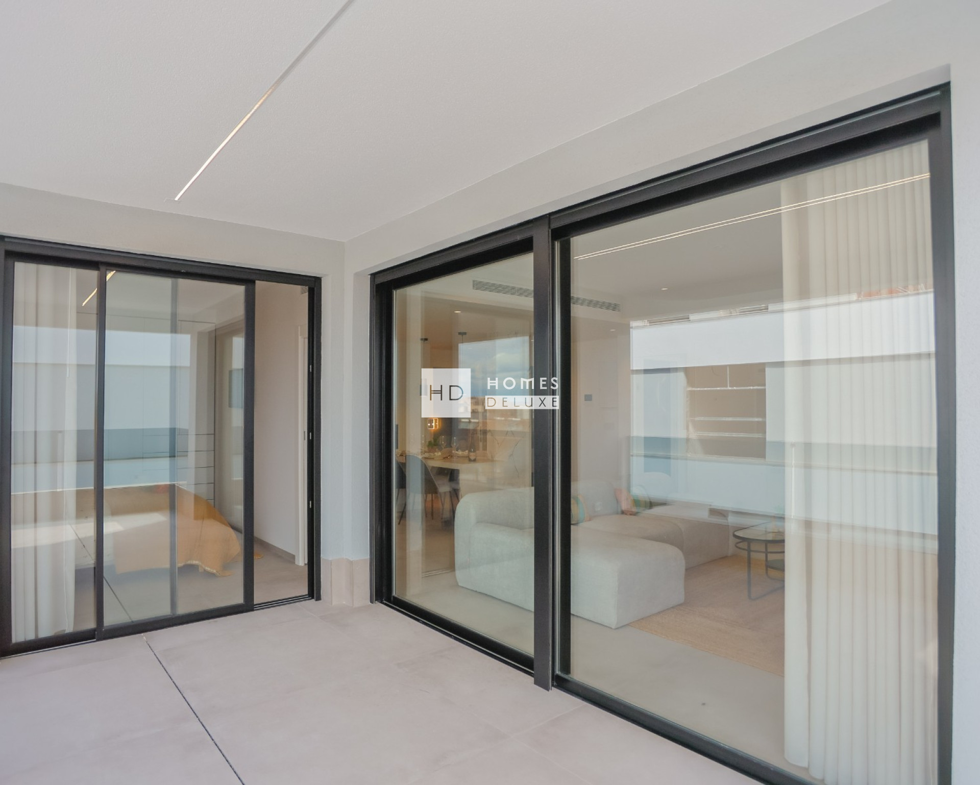 Die Innenausstattung besteht aus einem geräumigen, offenen Wohn- und Essbereich mit großen Terrassentüren, die Zugang zur Terrasse bieten, einer voll ausgestatteten amerikanischen Küche, einem Hauptschlafzimmer mit eigenem Bad, einem weiteren Doppelschlafzimmer und einem separaten Gästebad. Die Wohnungen verfügen über eine Klimaanlage, Fußbodenheizung in den Bädern, elektrische Küchengeräte von Bosch oder Siemens, LED-Beleuchtung innen und außen, elektrische Rollläden und eine private Tiefgarage mit einer Ladestation für Elektrofahrzeuge und einem Abstellraum. Die Penthouse-Wohnungen verfügen außerdem über eine private Sonnenterrasse, eine Toilette, eine Pergola, einen elektrischen Grill, eine Sommerküche, einen Kunstrasen, eine Außendusche und eine Vorinstallation für einen Jacuzzi. Optional gibt es für alle Wohnungstypen ein hochwertiges Möbelpaket.