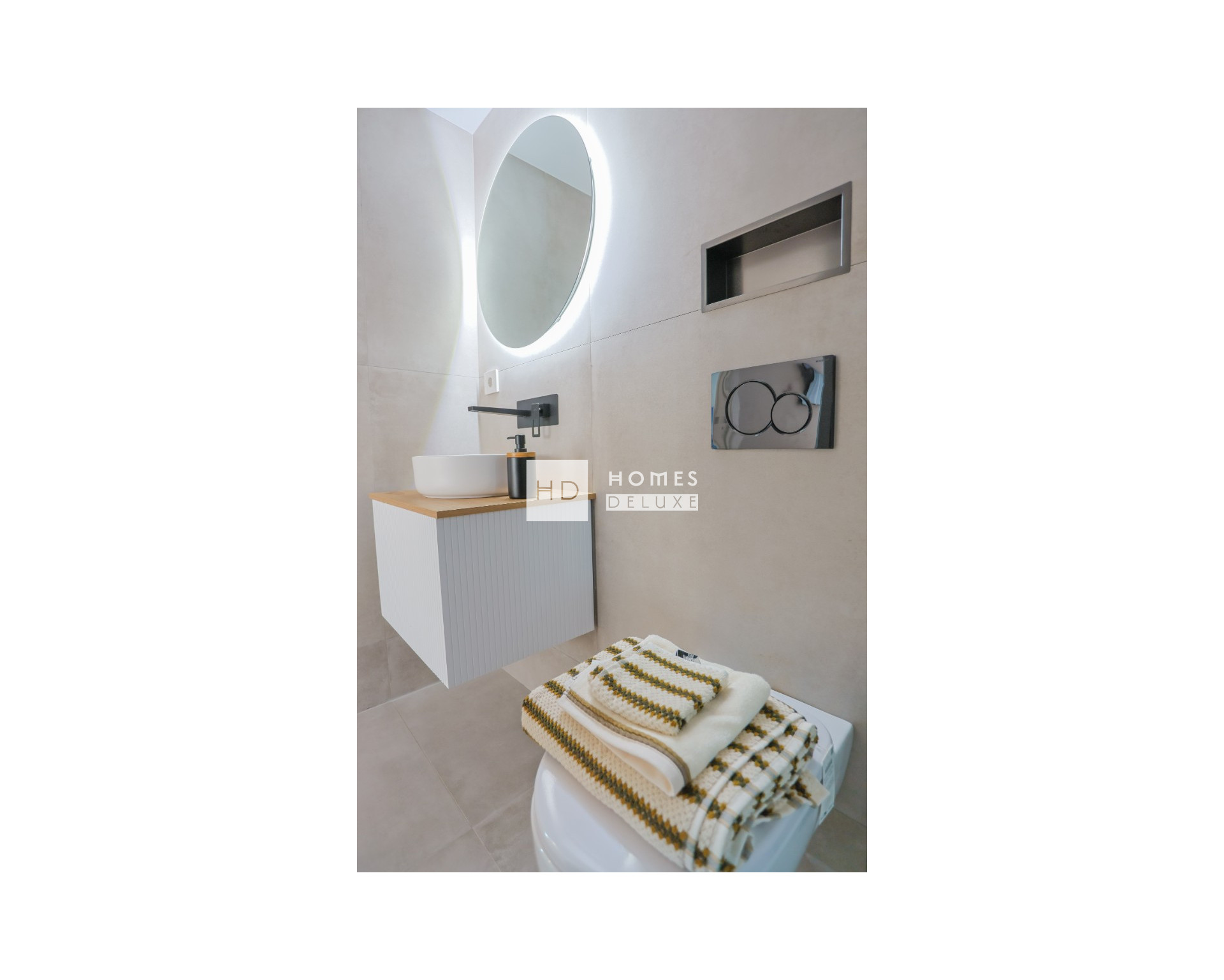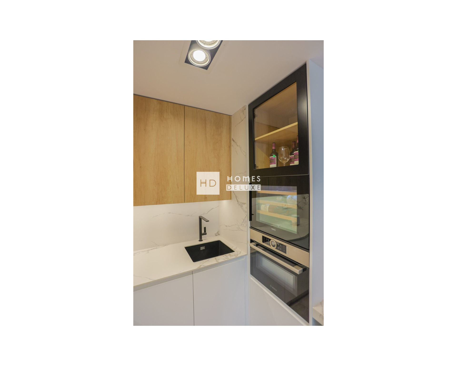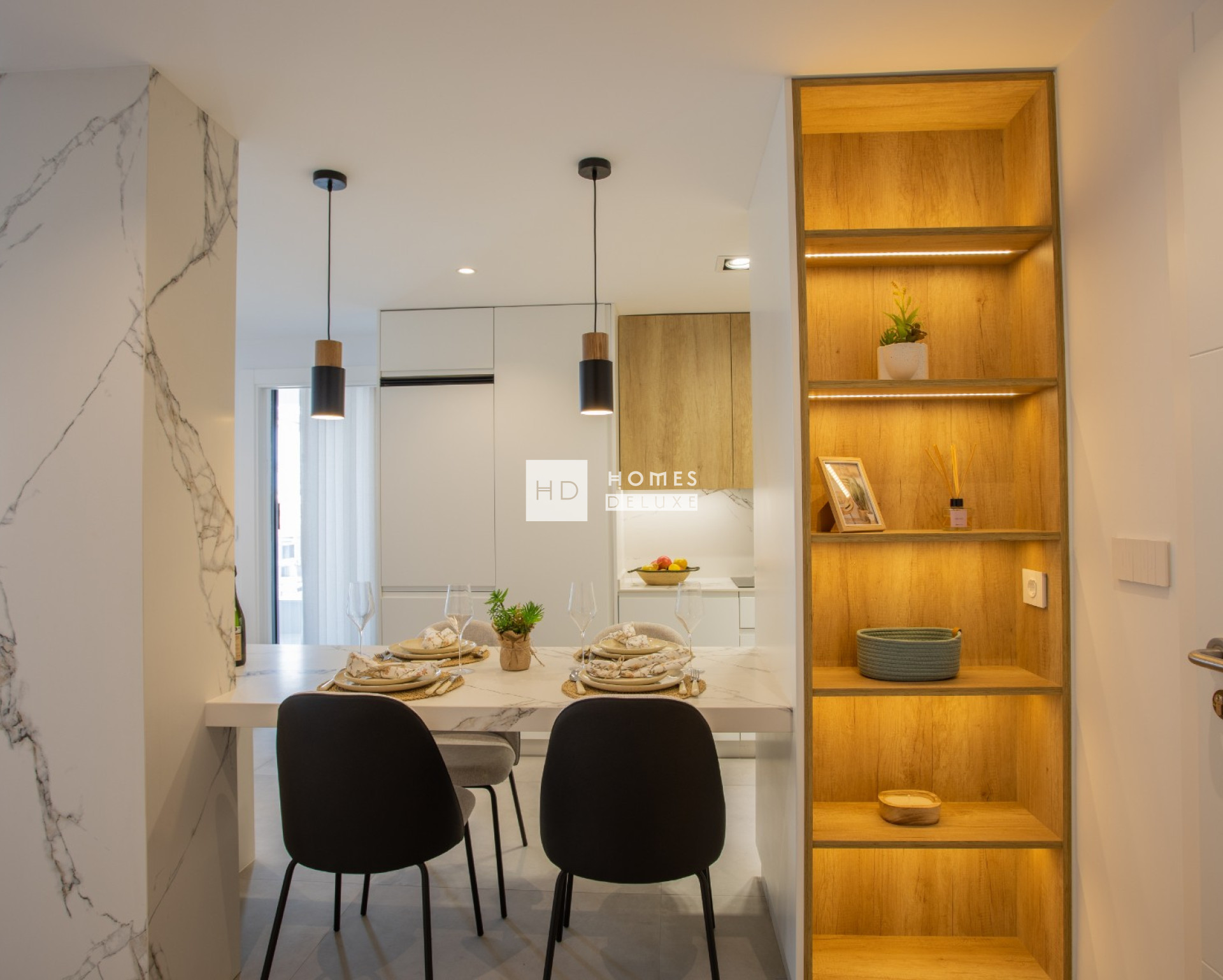 Die Innenausstattung besteht aus einem geräumigen, offenen Wohn- und Essbereich mit großen Terrassentüren, die Zugang zur Terrasse bieten, einer voll ausgestatteten amerikanischen Küche, einem Hauptschlafzimmer mit eigenem Bad, einem weiteren Doppelschlafzimmer und einem separaten Gästebad. Die Wohnungen verfügen über eine Klimaanlage, Fußbodenheizung in den Bädern, elektrische Küchengeräte von Bosch oder Siemens, LED-Beleuchtung innen und außen, elektrische Rollläden und eine private Tiefgarage mit einer Ladestation für Elektrofahrzeuge und einem Abstellraum. Die Penthouse-Wohnungen verfügen außerdem über eine private Sonnenterrasse, eine Toilette, eine Pergola, einen elektrischen Grill, eine Sommerküche, einen Kunstrasen, eine Außendusche und eine Vorinstallation für einen Jacuzzi. Optional gibt es für alle Wohnungstypen ein hochwertiges Möbelpaket.