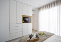 Die Innenausstattung besteht aus einem geräumigen offenen Wohn- und Essbereich mit großen Terrassentüren, die Zugang zur Terrasse bieten, einer voll ausgestatteten amerikanischen Küche, einem Hauptschlafzimmer mit eigenem Bad, zwei weiteren Doppelschlafzimmern und einem separaten Gästebad. Die Wohnungen verfügen über eine Klimaanlage, Fußbodenheizung in den Bädern, elektrische Küchengeräte von Bosch oder Siemens, LED-Beleuchtung innen und außen, elektrische Rollläden und eine private Tiefgarage mit einer Ladestation für Elektrofahrzeuge und einem Abstellraum. Die Penthouse-Wohnungen verfügen außerdem über eine private Sonnenterrasse, eine Toilette, eine Pergola, einen elektrischen Grill, eine Sommerküche, einen Kunstrasen, eine Außendusche und eine Vorinstallation für einen Jacuzzi. Optional gibt es für alle Wohnungstypen ein hochwertiges Möbelpaket.