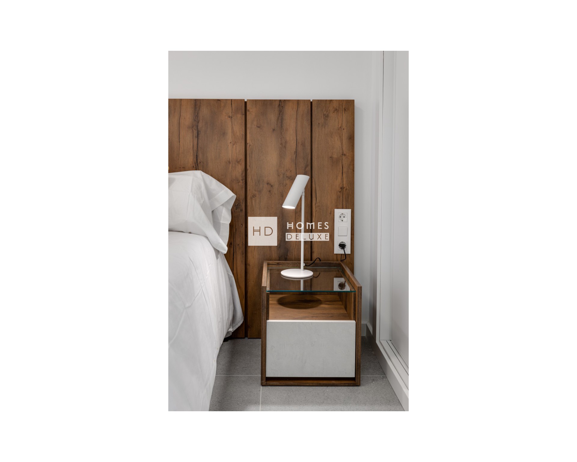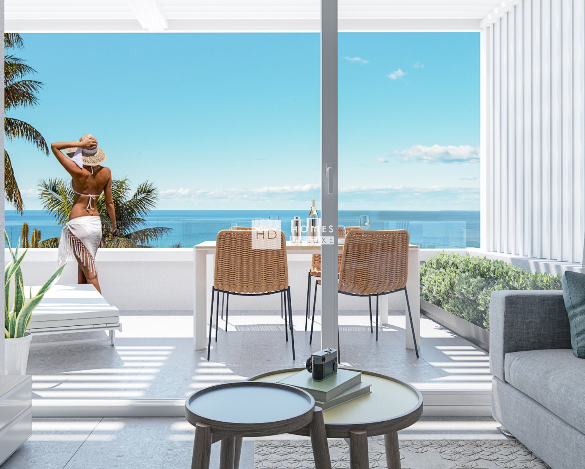 Eines der ursprünglichen Ziele des Projekts war es, den Wohnungen einen großen und privaten Außenbereich zu geben. Deshalb wurde eine große Terrasse mit Meerblick entworfen. Alle wichtigen Innenräume des Hauses sind direkt mit der Terrasse verbunden, so dass durch die großen Glasfenster viel natürliches Licht einfällt und der Außenbereich mit dem Innenbereich verschmilzt. Eine Pergola im Außenbereich filtert und schützt das Haus tagsüber vor Sonneneinstrahlung und ermöglicht eine flexible Nutzung des Außenbereichs das ganze Jahr über. Ein nachhaltiges Schutzsystem, das an den heißesten Sommertagen Schatten spendet und im Winter das Sonnenlicht in das Haus lässt. Auf diese Weise lässt sich die Temperatur auf natürliche Weise regulieren, was für die Immobilie deutliche energetische Vorteile mit sich bringt.