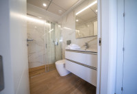 Die Innenaufteilung besteht aus einem geräumigen, offenen Wohn- und Essbereich mit mehreren großen Terrassenfenstern, die viel natürliches Licht in den Raum lassen und Zugang zur Terrasse und zum Garten bieten, einer voll ausgestatteten modernen amerikanischen Küche und einem separaten Gäste-WC. Die Innentreppe führt Sie in den ersten Stock mit zwei Doppelschlafzimmern, die beide Zugang zur privaten Sonnenterrasse haben, und einem separaten Gästebad. Bei dem Villenmodell mit 3 Schlafzimmern befinden sich ebenfalls alle Schlafzimmer auf der ersten Etage, darunter ein Hauptschlafzimmer mit eigenem Bad und Ankleidebereich, zwei weitere Doppelschlafzimmer und ein separates Gästebad. Alle Villenmodelle verfügen über eine Wendeltreppe, die auf die große Dachterrasse führt, auf der man den ganzen Tag die Sonne genießen kann.