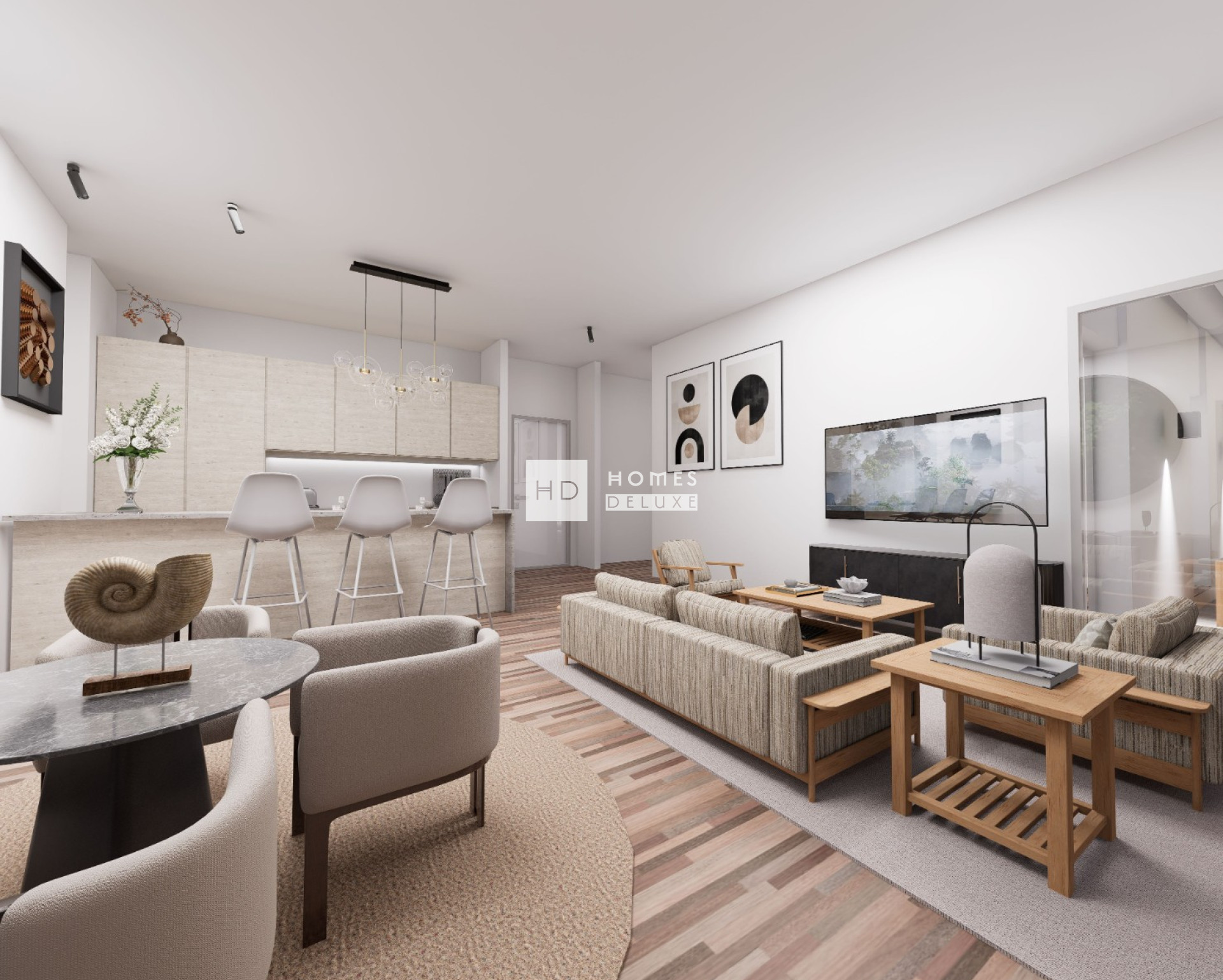 Die Inneneinrichtung besteht aus einem hellen und geräumigen offenen Wohn- und Essbereich mit großen Fenstern, die sich zur Terrasse und zum Garten hin öffnen. Im Hauptwohnbereich befindet sich eine voll ausgestattete moderne Küche im amerikanischen Stil mit Mittelinsel, die in weißem Glanz lackiert ist. Im Erdgeschoss befinden sich außerdem vier große Doppelschlafzimmer und zwei separate Gästebäder. Über die Innentreppe gelangt man in den ersten Stock mit zwei beeindruckenden Schlafsuiten, die über große Schlafzimmer, eigene Bäder und jeweils eine eigene Sonnenterrasse verfügen. Zwischen den beiden Schlafzimmern befindet sich eine 56 m2 große Sonnenterrasse mit einer Pergola, die ein schönes Designmerkmal darstellt.