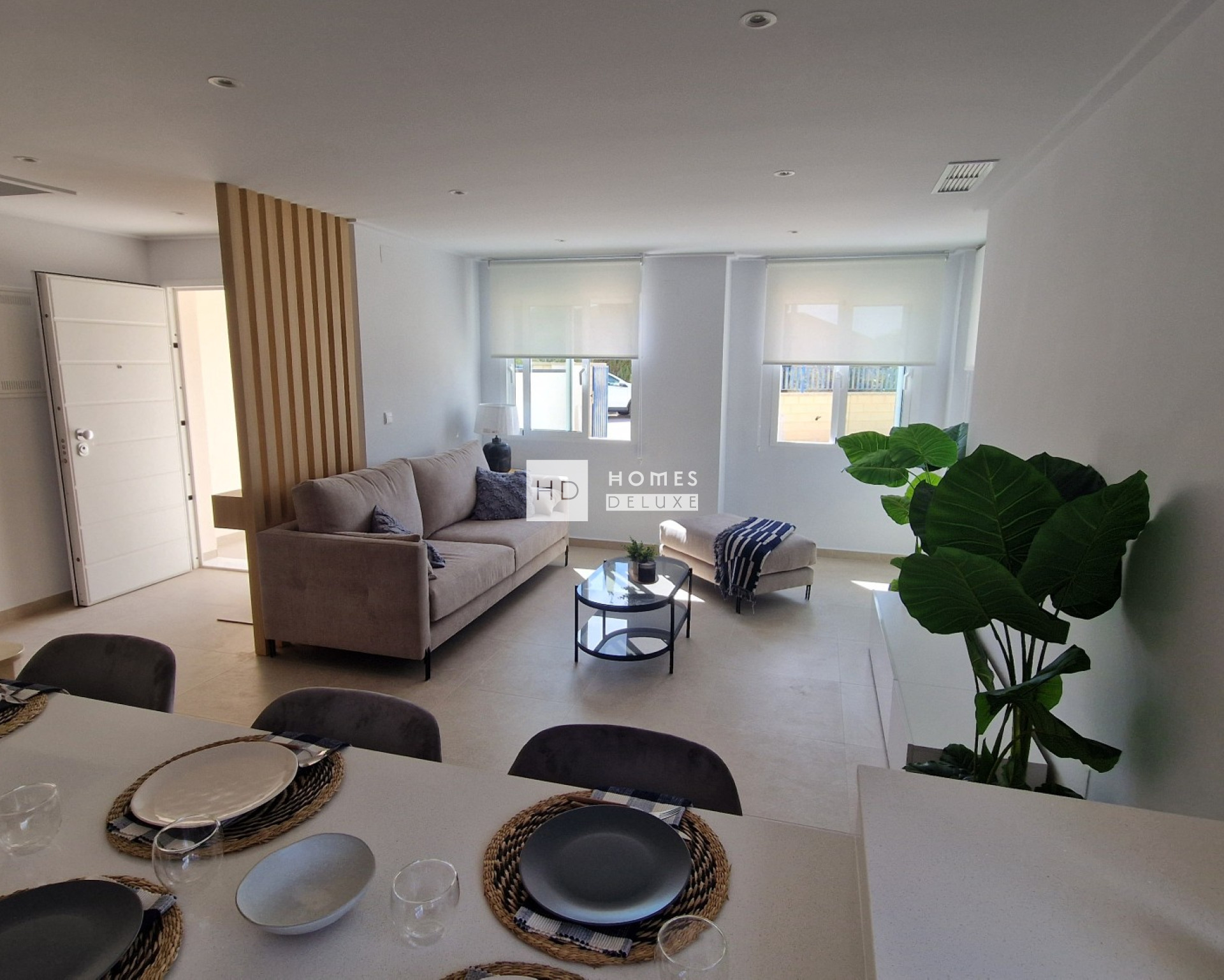 Die Innenausstattung besteht aus einem hellen und geräumigen offenen Wohn- und Essbereich mit mehreren Fenstern im gesamten Wohnbereich. Im Hauptwohnbereich befindet sich eine moderne, voll ausgestattete Küche im amerikanischen Stil mit Backofen, Cerankochfeld, Dunstabzugshaube, Mikrowelle, Kühl- und Gefrierschrank und Geschirrspüler. Im Erdgeschoss befinden sich außerdem ein Schlafzimmer mit Doppelbett und ein separates Gästebad. Die Innentreppe führt Sie in den ersten Stock mit dem großen Hauptschlafzimmer mit eigenem Bad. Auf der ersten Etage befinden sich zwei weitere große Schlafzimmer und ein zweites separates Gästebad. Alle Schlafzimmer sind mit Einbauschränken ausgestattet. Im Erdgeschoss befindet sich eine nützliche separate Waschküche mit Waschmaschine. Die Dachterrasse und der Privatparkplatz im Untergeschoss sind ebenfalls über die Innentreppe der Immobilie erreichbar.