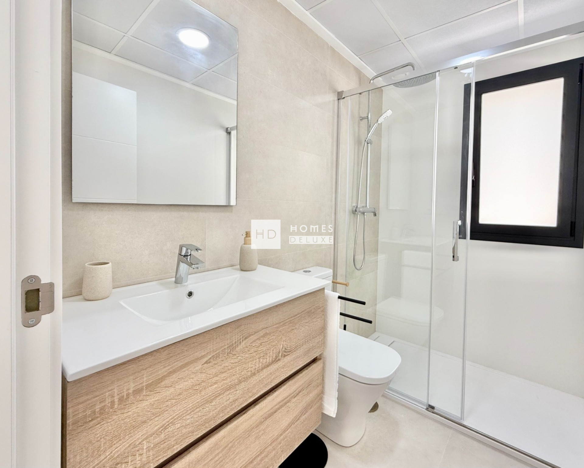 Die Immobilie erstreckt sich über zwei Etagen mit einem Solarium auf dem Dach. Die Innenausstattung besteht aus einem geräumigen, offenen Wohn- und Essbereich mit großen Fenstern, die sich zur vorderen Terrasse hin öffnen. Im Hauptwohnbereich befindet sich eine voll ausgestattete Küche im amerikanischen Stil mit Mittelinsel und Silestone-Arbeitsplatte sowie ein Gästebad. Die Küche hat auch eine Zugangstür zur hinteren Terrasse von 19 m2. Die Innentreppe führt Sie in den ersten Stock mit dem großen Hauptschlafzimmer, das Zugang zur Terrasse im ersten Stock hat. Es gibt ein weiteres großes Schlafzimmer mit Doppelbett und ein zweites separates Gästebad. Die Terrasse im ersten Stock hat eine Außentreppe, die auf die umfangreiche Dachterrasse von 32m2 einschließlich einer Sommerküche führt, perfekt, um den ganzen Tag über im Freien in der Sonne zu essen.