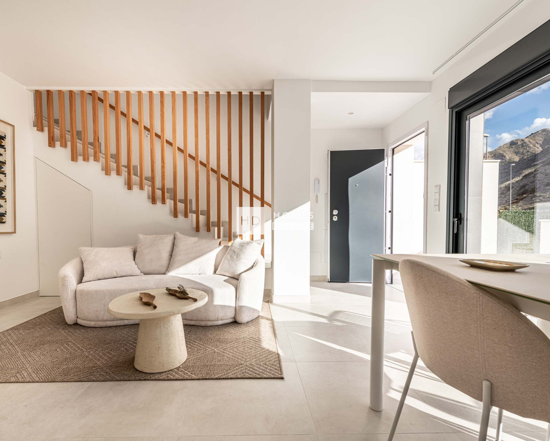 Das Anwesen erstreckt sich über zwei Ebenen mit einer Dachterrasse Solarium. Die Innenaufteilung besteht aus einem geräumigen offenen Wohn- und Essbereich mit großen Fenstern, die sich zur vorderen Terrasse hin öffnen. Innerhalb des Hauptwohnraums ist eine voll ausgestattete amerikanische Küche mit Silestone-Arbeitsplatte, die Küche hat eine Zugangstür zum hinteren Patio von 19m2. Im Erdgeschoss befinden sich außerdem ein Schlafzimmer mit Doppelbett und ein separates Gästebad. Die Innentreppe führt Sie in den ersten Stock mit dem großen Hauptschlafzimmer, das Zugang zur Terrasse im ersten Stock hat. Es gibt ein weiteres großes Schlafzimmer mit Doppelbett und ein zweites separates Gästebad. Die Terrasse im ersten Stock verfügt über eine Außentreppe, die zu einer 32 m2 großen Dachterrasse mit einer Sommerküche führt, auf der man den ganzen Tag über im Freien essen kann.