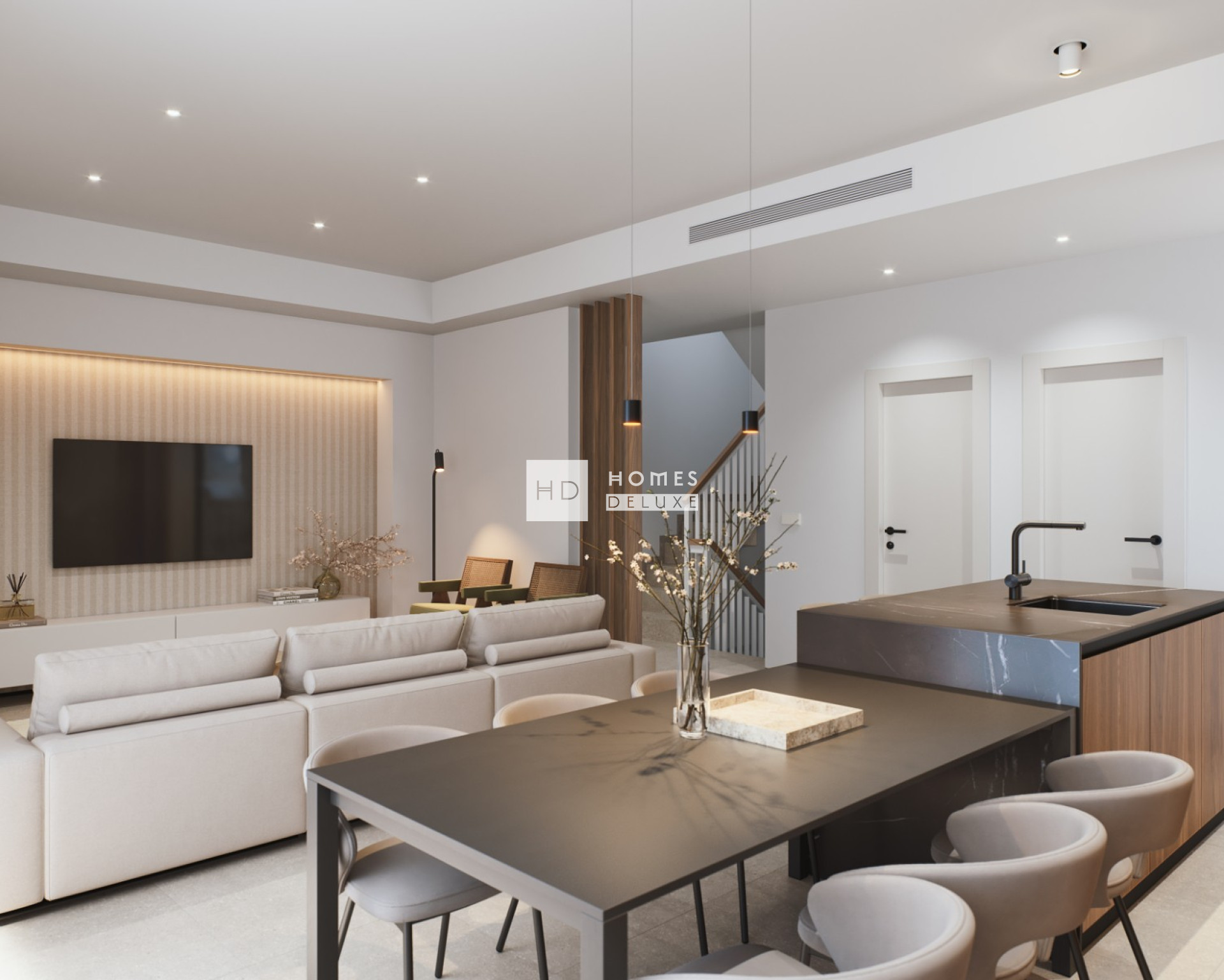 Die Innenaufteilung besteht aus einer Eingangshalle, die zum hellen und geräumigen offenen Wohn- und Essbereich mit einer viereinhalb Meter langen Terrassentür führt, die vollständig geöffnet und in der Wand versteckt werden kann, was den Raum öffnet und eine Verbindung zur Terrasse schafft. Ein schönes Designmerkmal ist das dekorative Holzlattengitter, das die Räume in der Wohnhalle und im Hauptschlafzimmer voneinander trennt. Im Hauptwohnbereich befindet sich eine moderne Küche im amerikanischen Stil mit einer Mittelinsel, die Küchenplatte und die Insel sind aus Silestone, Porzellan oder einem ähnlichen Material, und es gibt ein nützliches Gäste-WC. Im Erdgeschoss befindet sich auch ein großes Schlafzimmer mit Doppelbett und eigenem Bad. Die Innentreppe führt Sie in den ersten Stock, wo sich die beeindruckende Hauptsuite mit einem großen Schlafzimmer, einem eigenen Bad und einem Ankleidebereich befindet. Auf der ersten Etage befindet sich ein weiteres Doppelschlafzimmer mit eigenem Bad und Ankleidebereich, das Zugang zur vorderen Terrasse hat. Der Flur im ersten Stock hat Zugang zur Außentreppe, die auf die große Dachterrasse von 46m2 führt, um den ganzen Tag die Sonne zu genießen und hat Vorinstallationen für eine Sommerküche, Jacuzzi und Solarpanel.