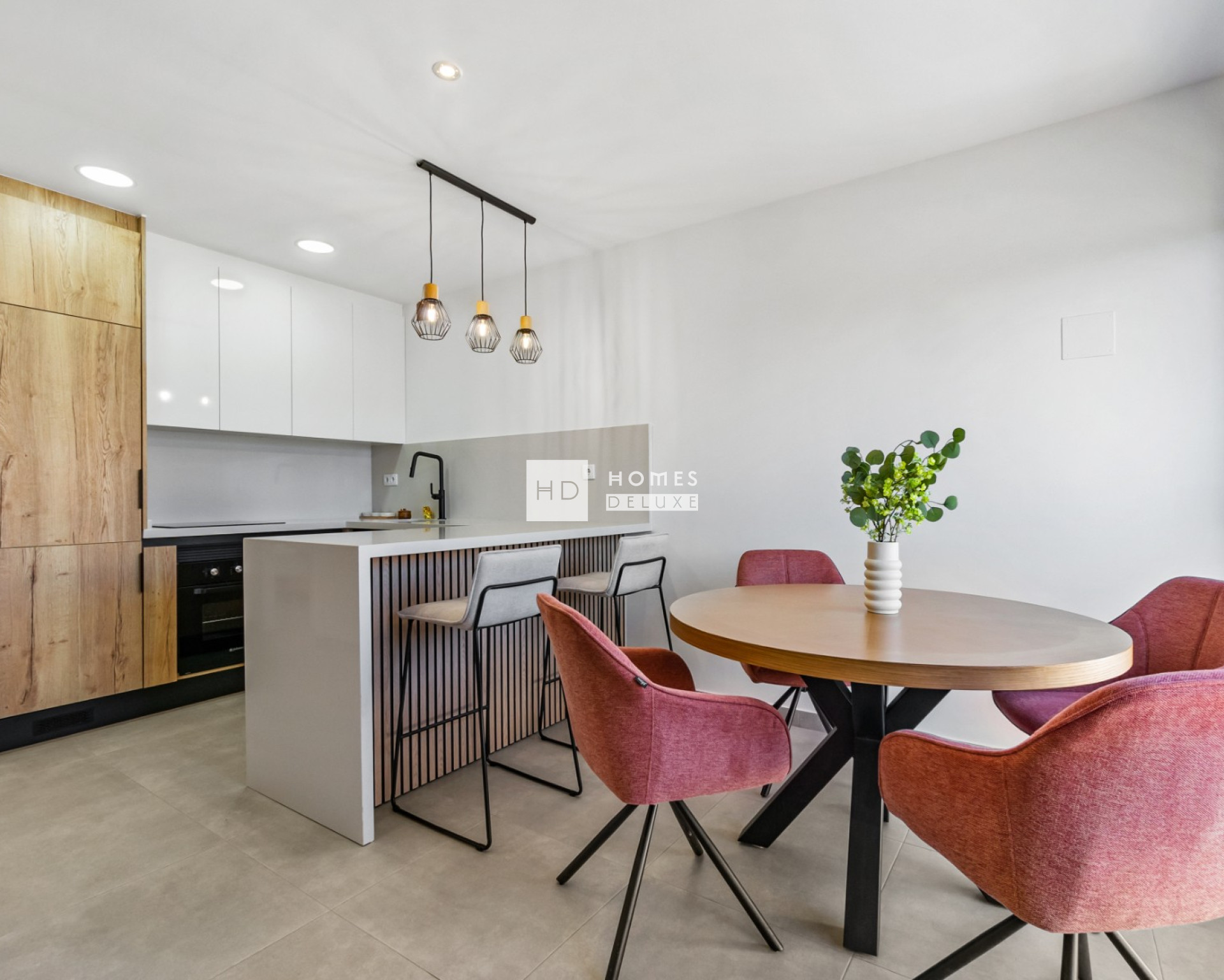 Es stehen Apartments im Erdgeschoss mit privaten Gärten und direktem Zugang zum Gemeinschaftsbereich, Apartments in den mittleren Etagen mit großzügigen Terrassen und Penthäuser mit großen Dachterrassen zur Auswahl. Die Innenausstattung umfasst einen Eingangsbereich, der zu einem hellen und geräumigen offenen Wohn- und Essbereich mit großen Fenstern führt, die sich zur Terrasse hin öffnen. Im Hauptwohnbereich befindet sich eine stilvolle, voll ausgestattete moderne Küche im amerikanischen Stil mit allen Geräten. Das große Hauptschlafzimmer verfügt über ein eigenes Bad, es gibt zwei weitere geräumige Doppelschlafzimmer und ein separates Gästebad. Die Penthouse-Wohnungen verfügen über eine Außentreppe auf der Terrasse, die zum 72 m² großen Dachsolarium führt, auf dem man den ganzen Tag die Sonne genießen kann. Die Immobilien sind mit Vorinstallationen für Klimaanlagen, Küchengeräten, Einbauschränken in allen Schlafzimmern, Innen- und Außenbeleuchtung, privater Tiefgarage und Abstellraum ausgestattet.