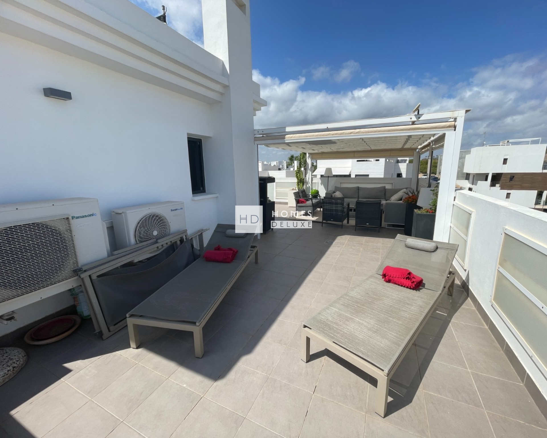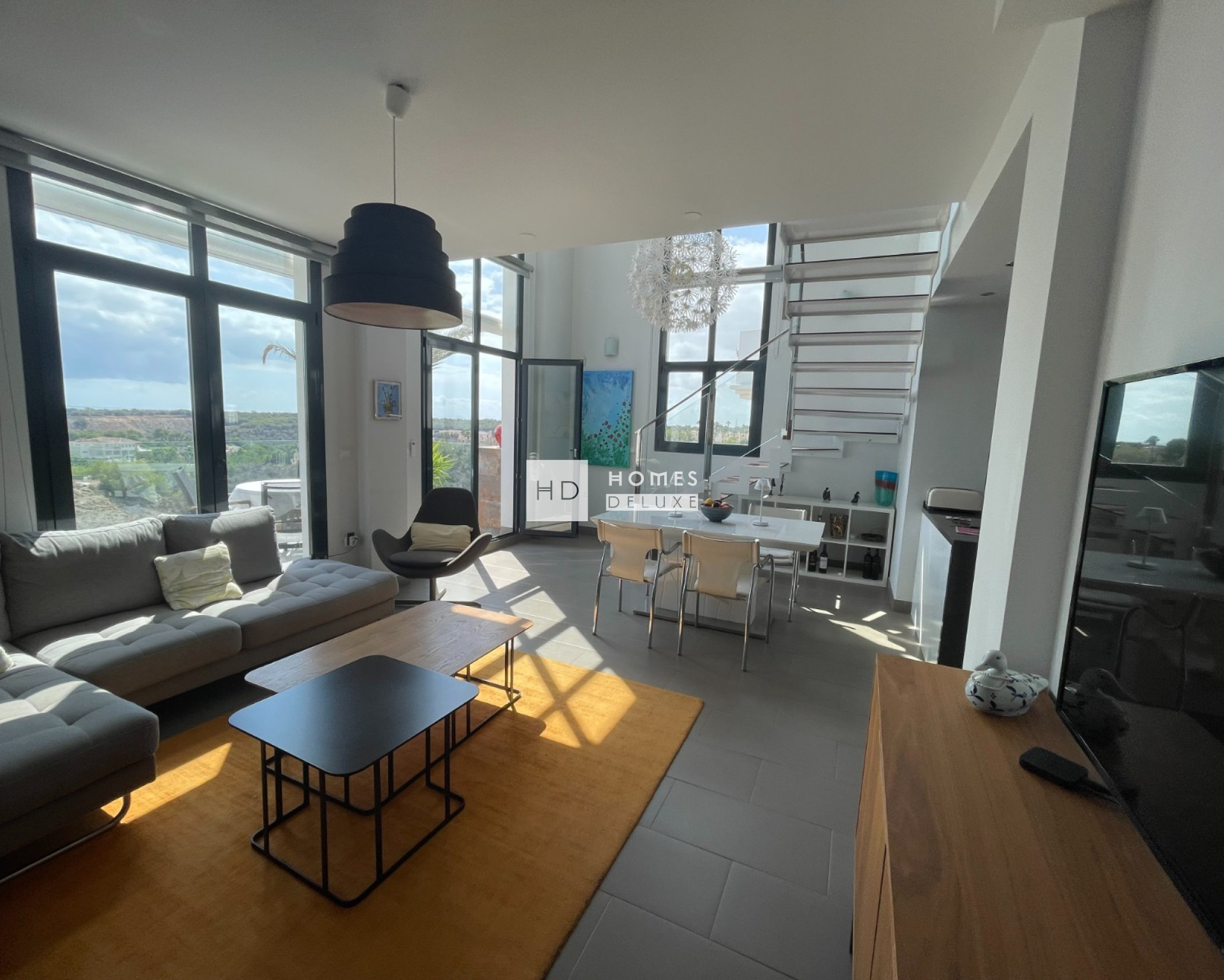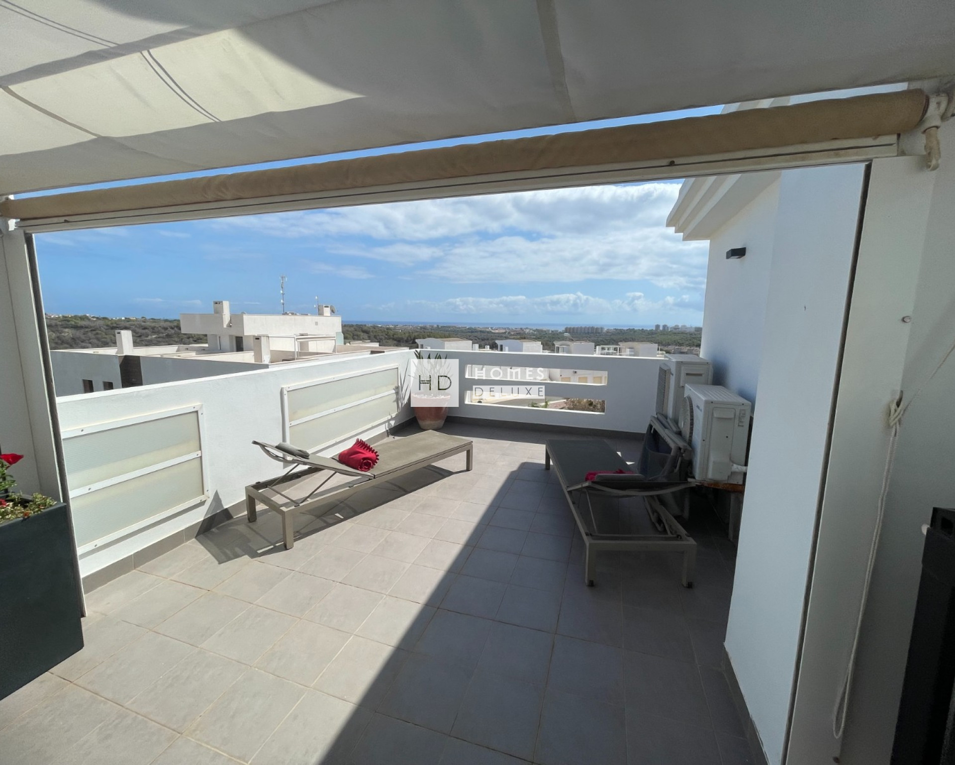 Die Immobilie hat eine großzügige Wohnfläche von 97 m² und die Innenausstattung umfasst einen Eingangsbereich, der zum hellen Wohn- und Essbereich mit hohen Decken und Fenstern führt, die das natürliche Licht optimal in den Raum strömen lassen. Die Fenster öffnen sich zu einer 12 m² großen Terrasse mit Glaswänden, von der aus Sie die schöne Aussicht genießen können. Im Hauptwohnbereich befindet sich eine voll ausgestattete Küche im amerikanischen Stil, die in eleganten Weiß- und Grautönen gehalten ist. Im Erdgeschoss befinden sich außerdem zwei geräumige Doppelschlafzimmer und ein separates Gästebad. Die Innentreppe führt Sie in den ersten Stock mit dem Hauptschlafzimmer und dem zweiten Badezimmer. Das Penthouse verfügt außerdem über ein 79 m² großes Solarium mit Pergola, das den Außenbereich ergänzt und Ihnen die Möglichkeit bietet, den ganzen Tag über zu entspannen, die Sonne zu genießen und die spektakuläre Aussicht auf die umliegenden Grünflächen und das Meer zu bewundern. Die Immobilie befindet sich in ausgezeichnetem Zustand und wird komplett möbliert verkauft, einschließlich Klimaanlage für maximalen Komfort.