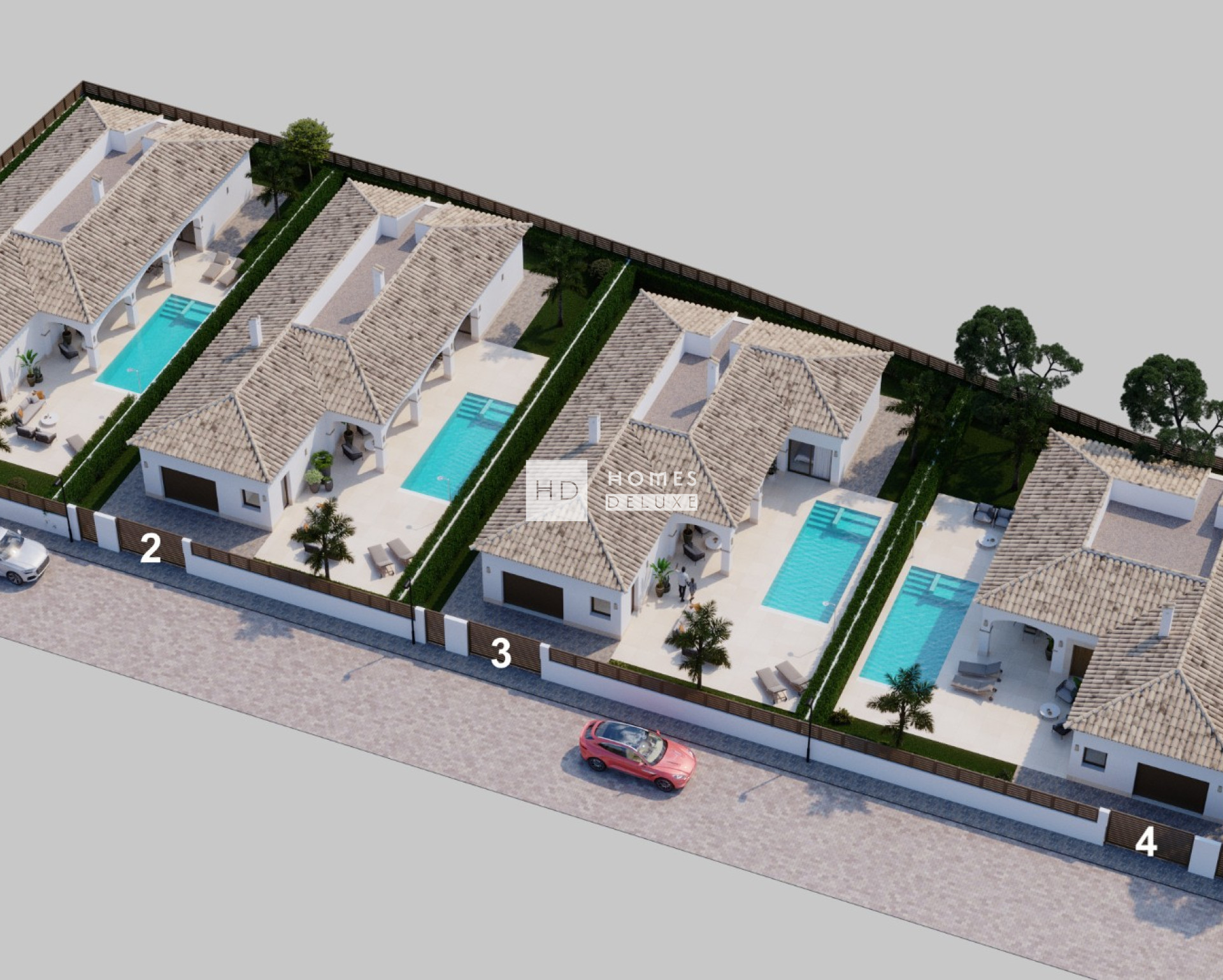 Die Immobilien verfügen über eine Vorinstallation für Klimaanlagen, Küchengeräte (Kochfeld, Backofen, Dunstabzugshaube, Mikrowelle, Geschirrspüler und Waschmaschine), Einbauschränke in allen Schlafzimmern, LED-Beleuchtung im Innen- und Außenbereich, elektrische Rollläden, einen privaten Swimmingpool, einen Abstellraum und eine private Garage.