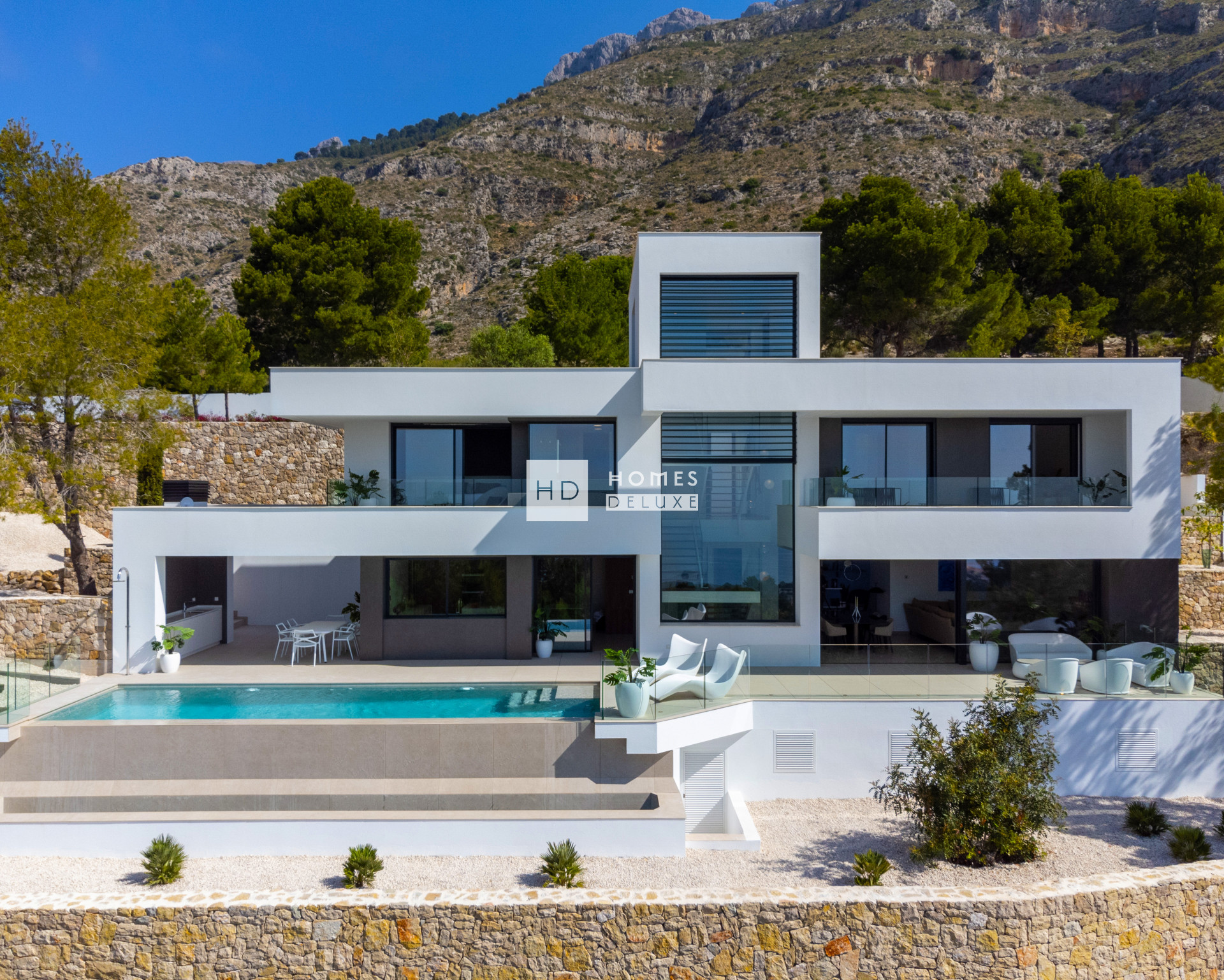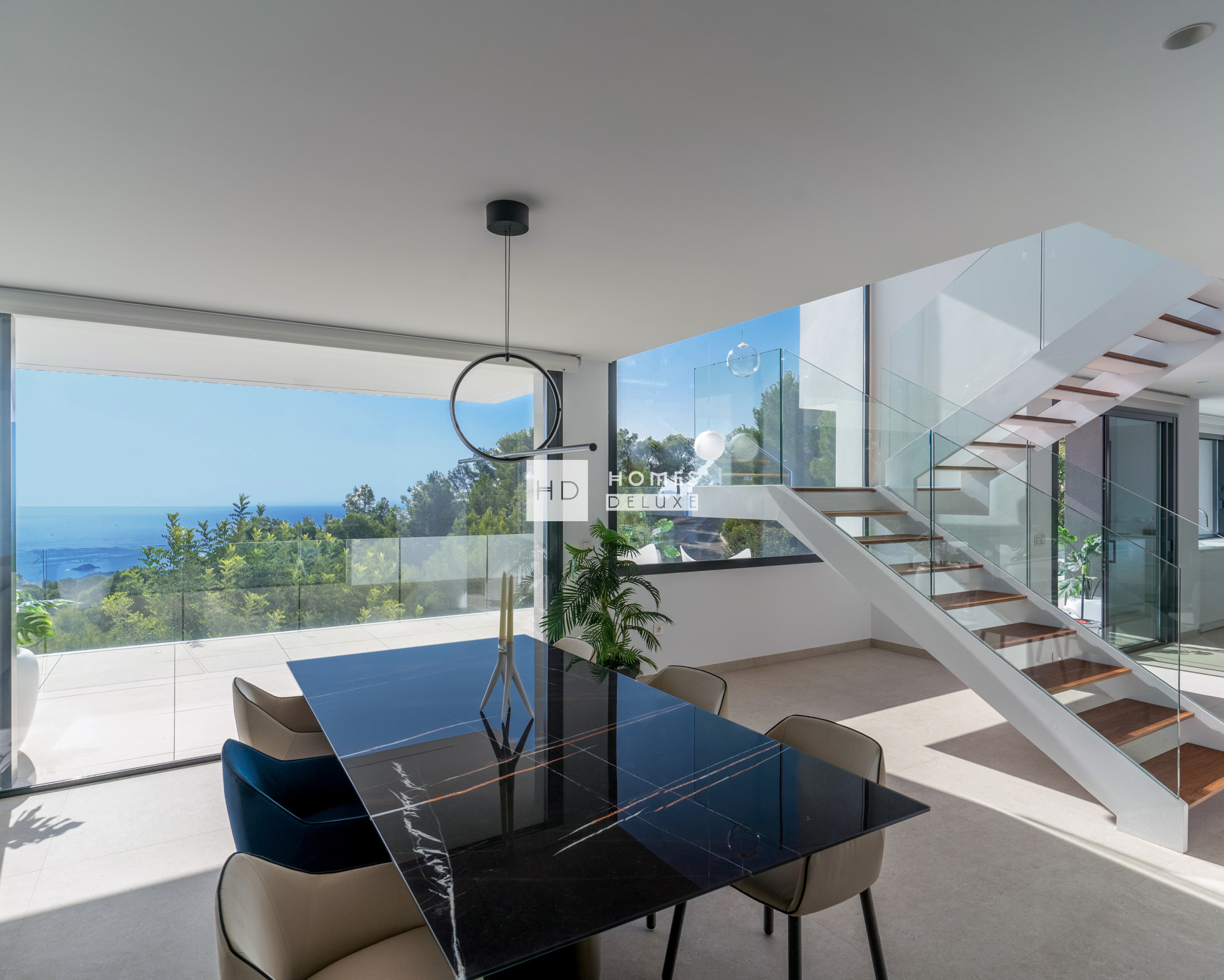 Das Erdgeschoss ist als offener, eleganter Wohnbereich gestaltet. Küche, Esszimmer und Wohnzimmer gehen fließend ineinander über und verschmelzen durch große Glasfronten mit dem Außenbereich – einer Panorama-Terrasse mit einem endlos langen Pool und einer Küche für den Sommer. Jeder Winkel des Hauses ist darauf ausgerichtet, den Ausblick zu genießen und das Leben im Freien zu zelebrieren.