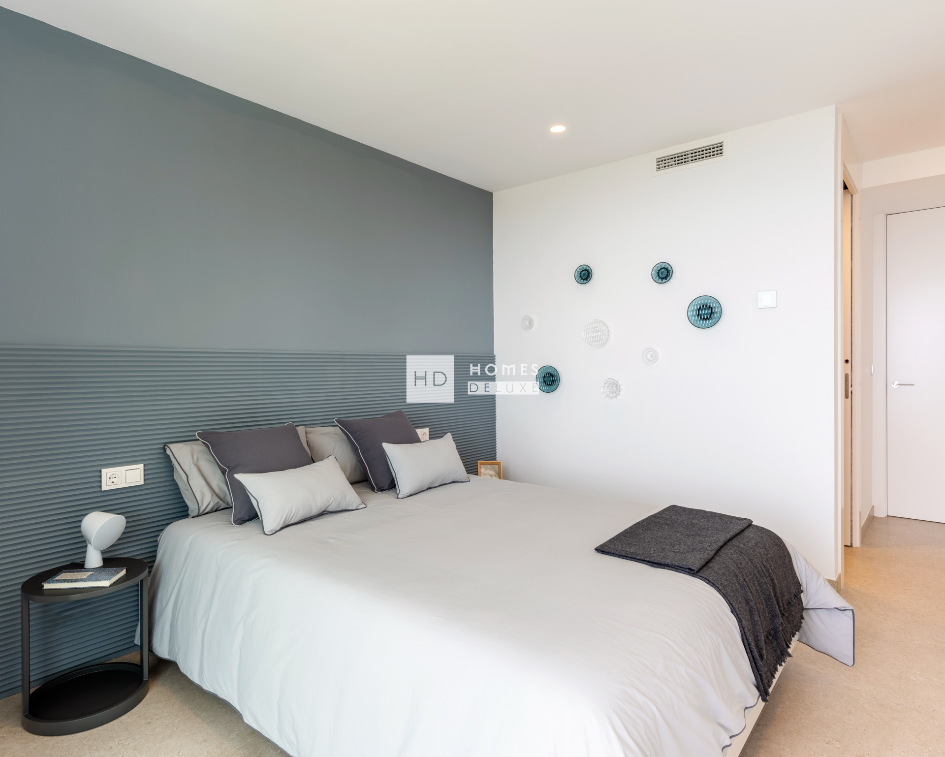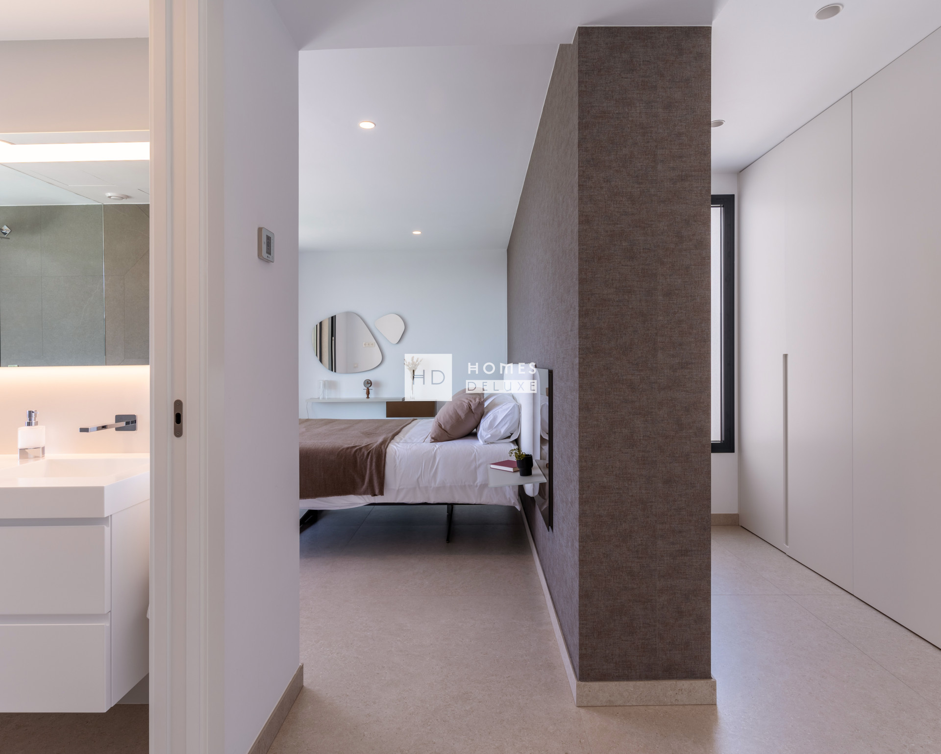 Die Raumaufteilung erstreckt sich über drei Ebenen, verbunden durch Treppe und Aufzug, mit direktem Zugang von einem überdachten Parkplatz für zwei Fahrzeuge. Im mittleren Stockwerk befinden sich drei außergewöhnliche Schlafzimmer. Zwei der Zimmer verfügen über ein eigenes Bad, Einbauschränke und Zugang zu einer gemeinsamen Terrasse mit Meerblick. Das Hauptschlafzimmer ist als Rückzugsort konzipiert: Es ist mit einem begehbaren Ankleidezimmer, einem großzügigen Bad mit Badewanne sowie einer privaten Terrasse ausgestattet, die zur ganzheitlichen Entspannung einlädt.