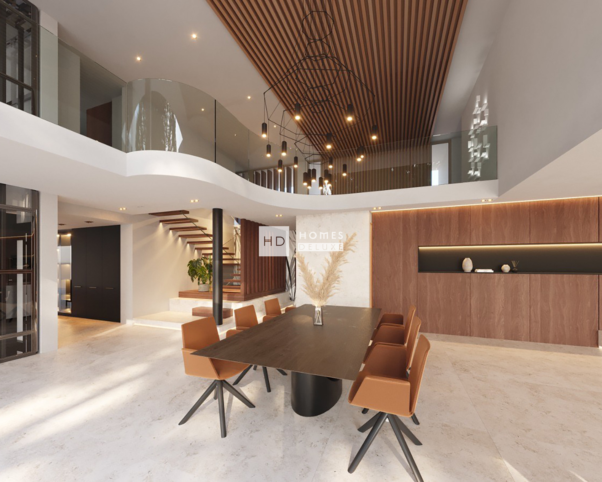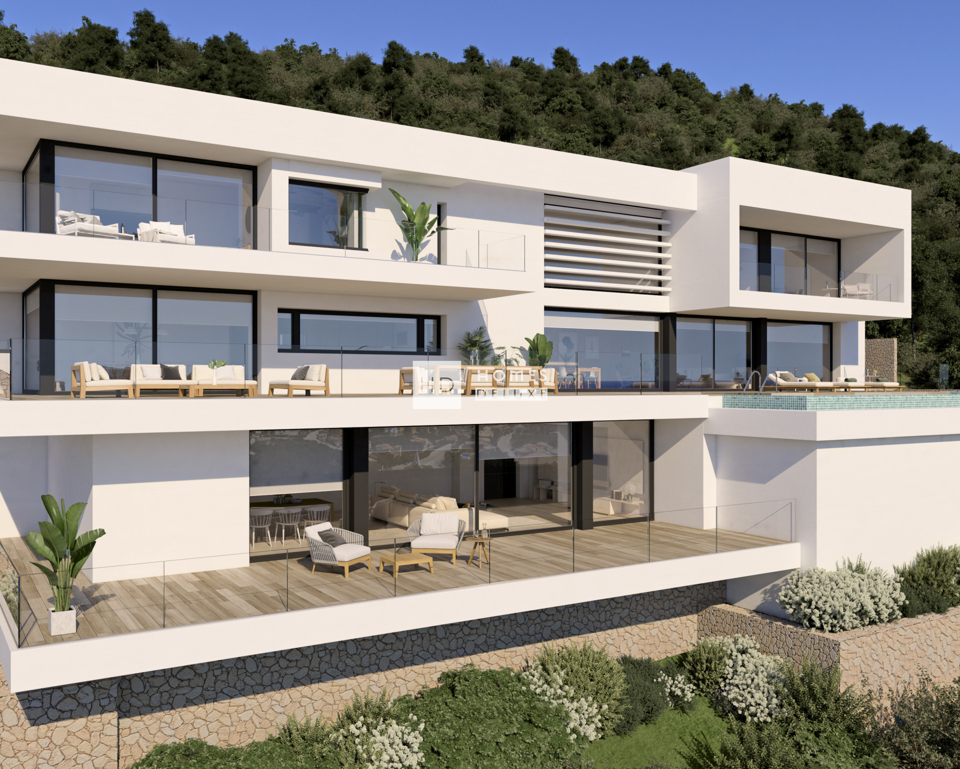 In privilegierter Lage der exklusiven Wohnanlage „Jazmines“ thront die Villa Marblau, eine Immobilie, die Luxus und Privatsphäre auf ein neues Level hebt. Ihre moderne Architektur, geprägt von klaren Linien und edlen Materialien, verschmilzt harmonisch mit der mediterranen Landschaft und schafft ein Wohnambiente von stilvoller Ruhe und zeitloser Eleganz. Der Zugang zur Villa erfolgt über das oberste Stockwerk, wo ein großzügiger, überdachter Außenstellplatz sowie eine geschlossene Garage mit Platz für mehrere Fahrzeuge zur Verfügung stehen. Von hier aus führt die Eingangshalle in die Ruhebereiche des Hauses, die über einen Aufzug und eine elegante Innentreppe mit den weiteren Ebenen verbunden sind. Dadurch werden höchster Komfort und eine durchdachte Raumnutzung sichergestellt. Die Villa erstreckt sich über drei Etagen und umfasst insgesamt fünf Schlafzimmer und neun Badezimmer. Das Herzstück bildet das offene Wohn-Esszimmer im Erdgeschoss, das nahtlos mit der Designerküche mit zentraler Kochinsel in Nussbaum und Anthrazit verschmilzt. Auf derselben Ebene befindet sich die exklusive Master-Suite mit Ankleidezimmer, privatem Bad und direktem Zugang zur Terrasse. In der oberen Etage bieten drei weitere Schlafzimmer mit Bad en suite und privaten Terrassen höchsten Komfort für Gäste. Das Untergeschoss ist ganz dem Wohlbefinden gewidmet: ein Heimkino mit Surround-System, ein Fitnessbereich, ein beheizter Innenpool, Sauna und Hamam laden zur Entspannung ein. Außerdem befindet sich hier ein voll ausgestattetes Gästestudio mit Küche, Wohnbereich und einem zusätzlichen Schlafzimmer mit eigenem Bad. Die Villa Marblau verfügt über modernste Premium-Technologie: Kanal-Klimaanlage mit Mitsubishi Electric®-Technologie, Fußbodenheizung mit Ecodan-Hybridsystem, Smart-Home-Steuerung, wärmegedämmte Außenverglasung mit Sonnenschutz, integrierte Geräten von Marken wie Miele und Siemens sowie exklusive Lichtgestaltung von FLOS und Arkoslight. Die Badezimmer zeichnen sich durch schlichte Raffinesse aus. Sie sind mit wandhängenden Sanitäranlagen, Aufsatzwaschbecken, integrierter Armaturentechnik und großformatigen Wandverkleidungen in warmen und edlen Farbtönen ausgestattet. Von der Terrasse aus eröffnet sich ein ständig wechselndes Panorama: das Meer, der markante Felsen Peñón de Ifach und die Küstenlinie formen ein lebendiges Kunstwerk. Der endlos lange Pool scheint mit dem Himmel zu verschmelzen und lädt zur Entschleunigung und zum stilvollen Leben am Mittelmeer ein.