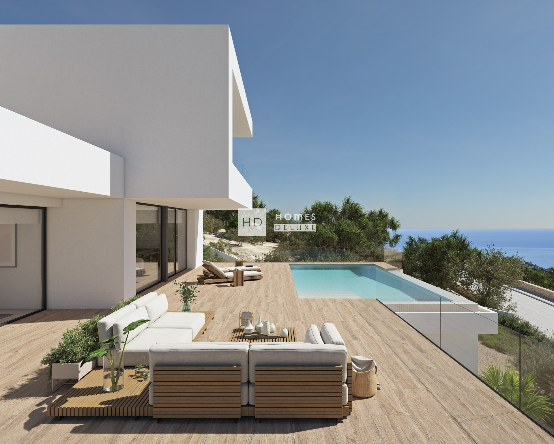 Die Villa Delfin ist eine luxuriöse Neubauvilla, die sich auf dem exklusiven Grundstück 137 der Wohnanlage Jazmines in der Urbanisation Cumbre del Sol befindet. Ihr zeitgenössisches Design, die klaren Linien und auskragenden Volumen unterstreichen die spektakuläre Hanglage mit Ausrichtung zum Meer und freiem Blick auf den Meeresfelsen Peñón de Ifach und den Horizont. Das Highlight der Villa Delfin ist die großzügige Hauptterrasse, die sich rund um einen minimalistischen endlos langen Pool erstreckt. Der optische Effekt des Übergangs ins Meer schafft ein Gefühl der Verschmelzung mit der Natur. Von hier aus genießt man tagsüber wie nachts eine einzigartige Atmosphäre mit einem Panoramablick auf die gesamte Mittelmeerküste, die Skyline von Calpe und die umliegenden Berge. Die Veranda und die vielfältigen Außenbereiche, darunter Chill-out-Zonen und ein Essplatz im Freien, sorgen für einen fließenden Übergang zwischen Innen- und Außenbereich. Die Villa erstreckt sich über drei Ebenen: Obergeschoss: Hier befinden sich der Haupteingang sowie drei Doppelschlafzimmer, alle mit eigenem Bad und Einbauschränken. Das Hauptschlafzimmer verfügt zusätzlich über ein großzügiges Ankleidezimmer und eine private Terrasse mit Meerblick. Hauptgeschoss: Hier befinden sich die Wohnbereiche – ein großzügiger, offen gestalteter Wohn-Essbereich und eine Küche mit zentraler Kochinsel. Ein direkter Zugang direkt zur Terrasse und zum Pool verstärken die Lichtdurchflutung und den Landschaftsbezug. Weiterhin sind ein Gäste-WC sowie eine Speisekammer vorhanden. Untergeschoss: Ein vielseitig nutzbarer Bereich mit zusätzlichem Wohnzimmer, komplettem Bad und einem großen offenen Raum, der sich ideal als Fitnessstudio, Heimkino, Büro oder für andere Zwecke je nach den individuellen Wünschen der Eigentümer eignet. Die Villa Delfin ist von der Rückseite des Grundstücks per Fahrzeug oder zu Fuß zugänglich, was Privatsphäre und Komfort garantiert. Eine großzügige Außenstellfläche sowie eine geschlossene Garage mit motorisiertem Tor bieten Platz für mehrere Fahrzeuge. Von dieser Ebene gelangt man bequem per Treppe oder privatem Aufzug auf die Hauptetage und zu den übrigen Wohnbereichen. Die Immobilie wurde mit höchsten Qualitätsstandards in Bezug auf Materialien und Ausführungen konzipiert: Großformatige Feinsteinzeug-Böden und -Wandverkleidungen Küche mit integrierten Elektrogeräten von Premium-Marken Aluminiumfenster mit thermischer Trennung und Sicherheitsverglasung Eingelassene LED-Beleuchtung und Vorinstallation für ein Smart-Home-System Klimatisierung über Fußbodenheizung und Kanalklimaanlage mit Aerothermie Fertig angelegter mediterraner Garten mit automatischer Bewässerung