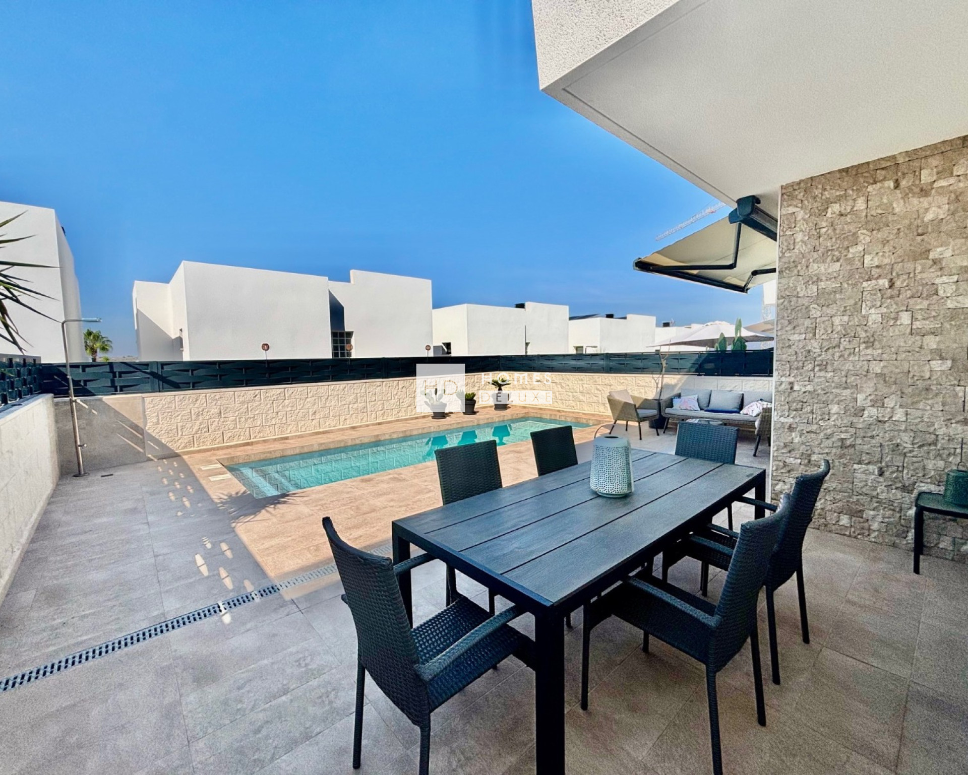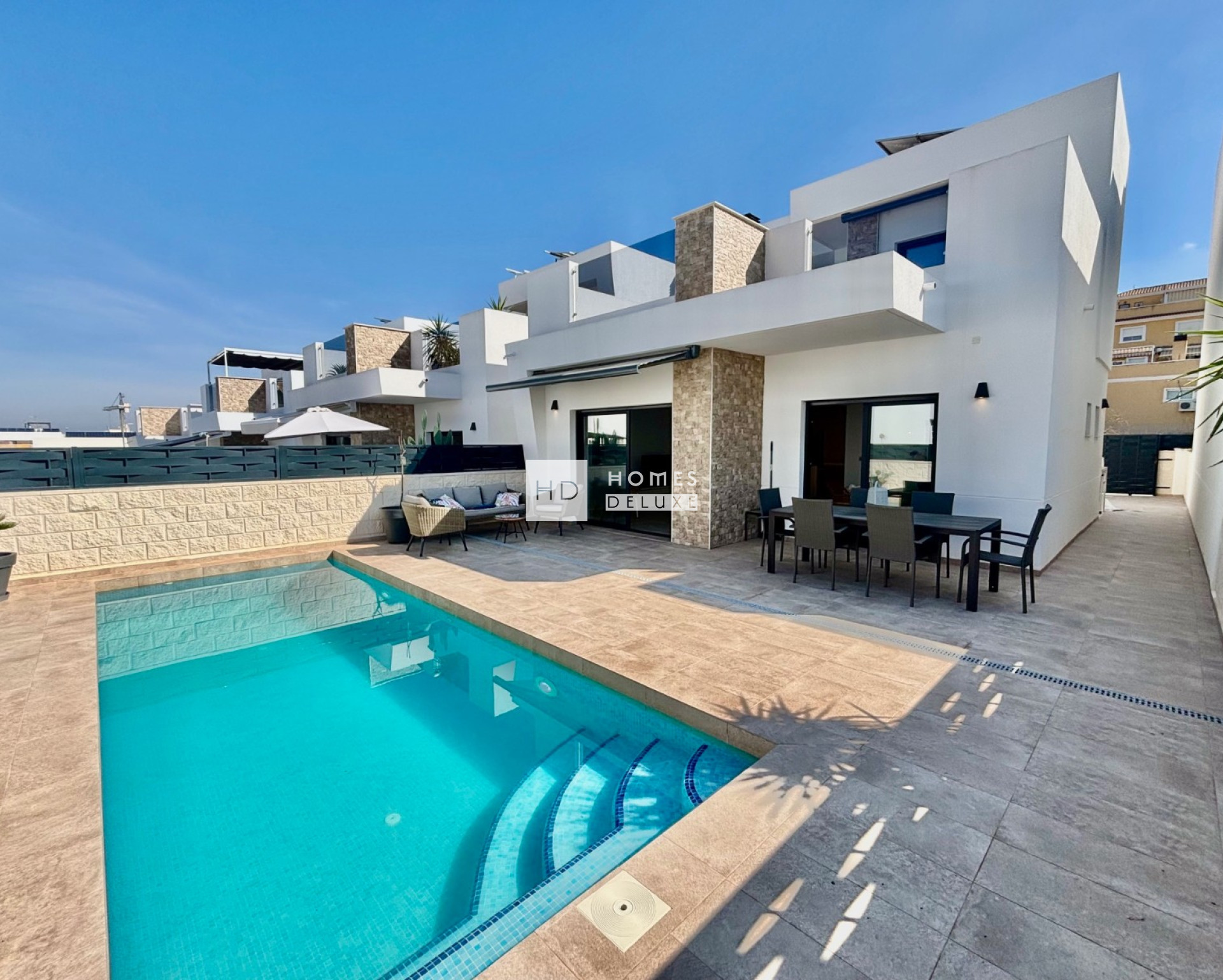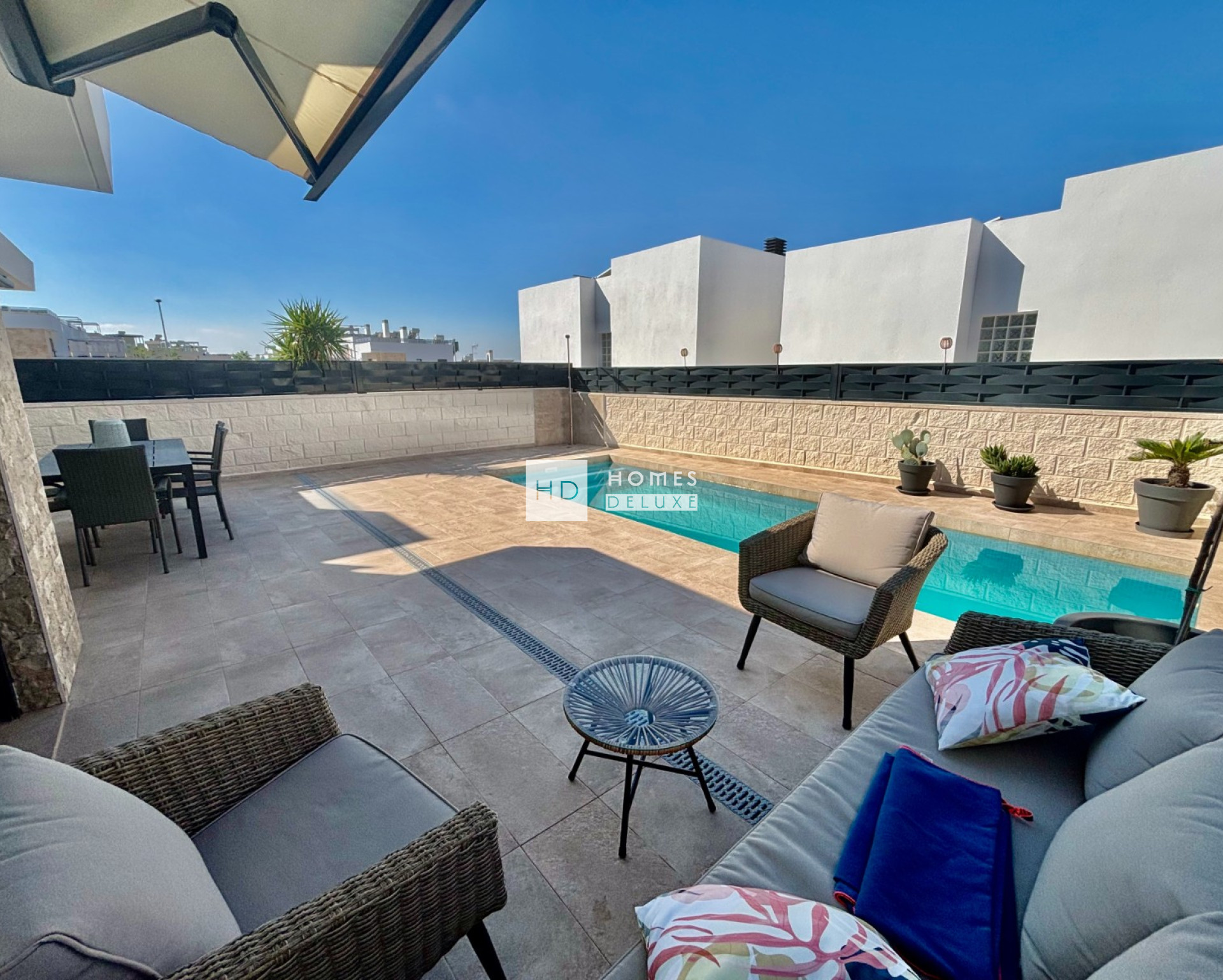 Eine wunderschöne, moderne freistehende Villa mit 2/3 Schlafzimmern, 2,5 Badezimmern und privatem Swimmingpool in der beliebten Stadt Benijofar (Alicante), nur eine kurze Autofahrt oder einen kurzen Spaziergang vom lebhaften Stadtzentrum von Benijofar entfernt. Diese Villa bietet bequemen Zugang zu lokalen Annehmlichkeiten wie Geschäften, Restaurants, Cafés und kulturellen Sehenswürdigkeiten. Die Lage bietet auch eine hervorragende Anbindung an andere beliebte Ziele entlang der Costa Blanca und ist somit ein idealer Ausgangspunkt, um die Region zu erkunden.