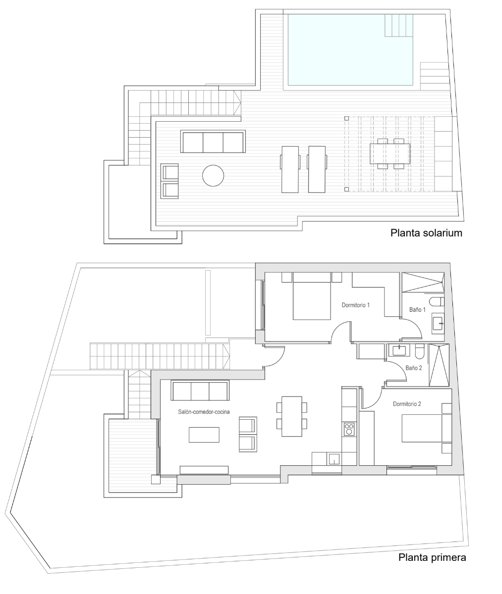 Dieses einzigartige Gebäude besteht aus zwei Apartments im Bungalowstil mit 2 Schlafzimmern und 2 Badezimmern, die nach Süden ausgerichtet sind. Die Immobilien bieten das Beste, was das Leben im Freien in Spanien zu bieten hat: Die Option im Erdgeschoss verfügt über einen großen privaten Garten und die Option im Obergeschoss über eine Dachterrasse mit Meerblick. Beide Immobilien verfügen über einen privaten Swimmingpool und einen privaten, abgeschlossenen Parkplatz.