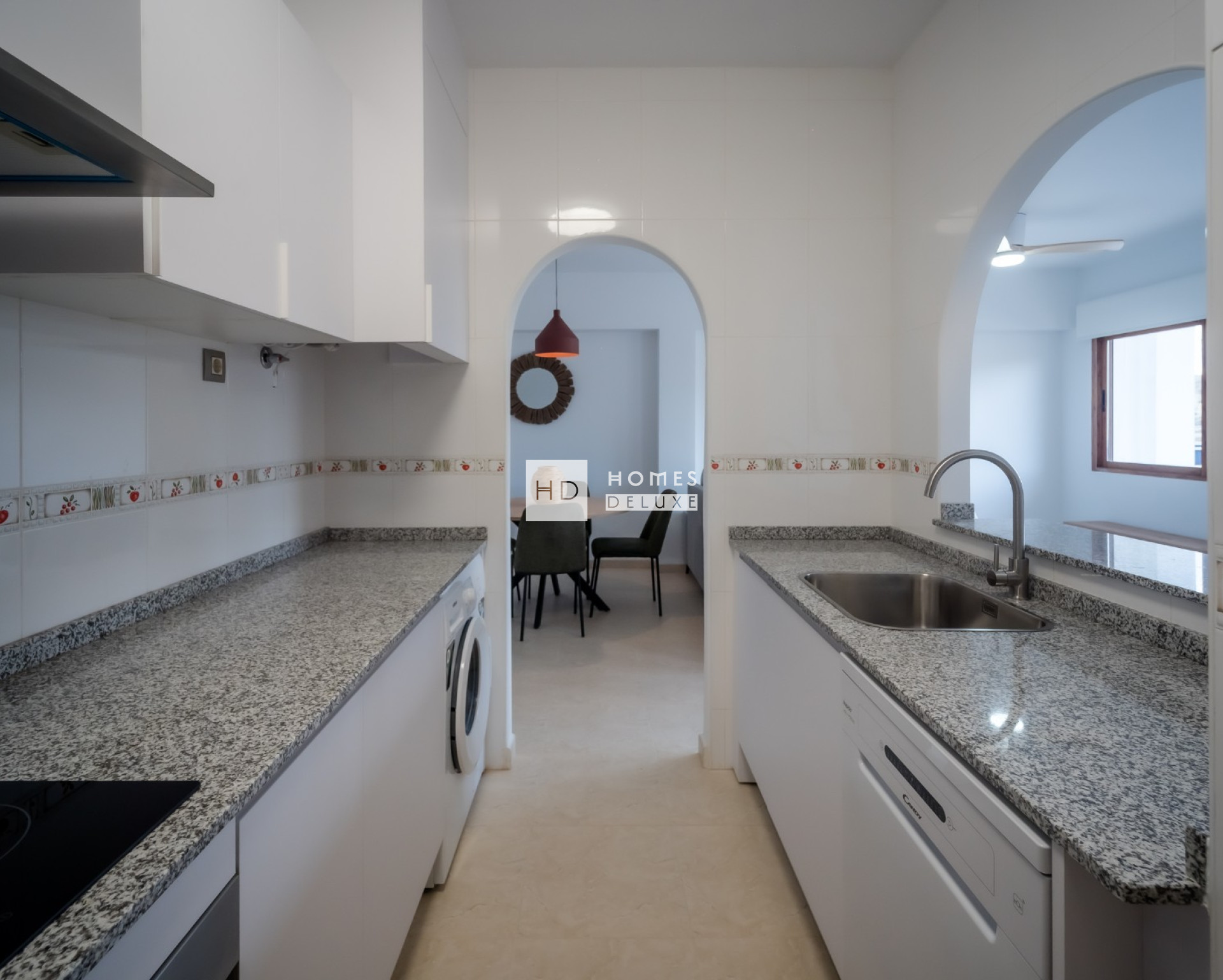 Die Innenräume sind elegant und funktional gestaltet und umfassen einen geräumigen offenen Wohn- und Essbereich mit einer voll ausgestatteten separaten Küche mit weißen Ober- und Unterschränken und einer Granitarbeitsplatte. Das große Hauptschlafzimmer verfügt über ein eigenes Bad und einen Ankleidebereich. Es gibt ein weiteres geräumiges Doppelzimmer und ein separates Gästebad. Alle Wohnungen haben über das Gemeinschaftstreppenhaus Zugang zu ihren privaten Sonnenterrassen.