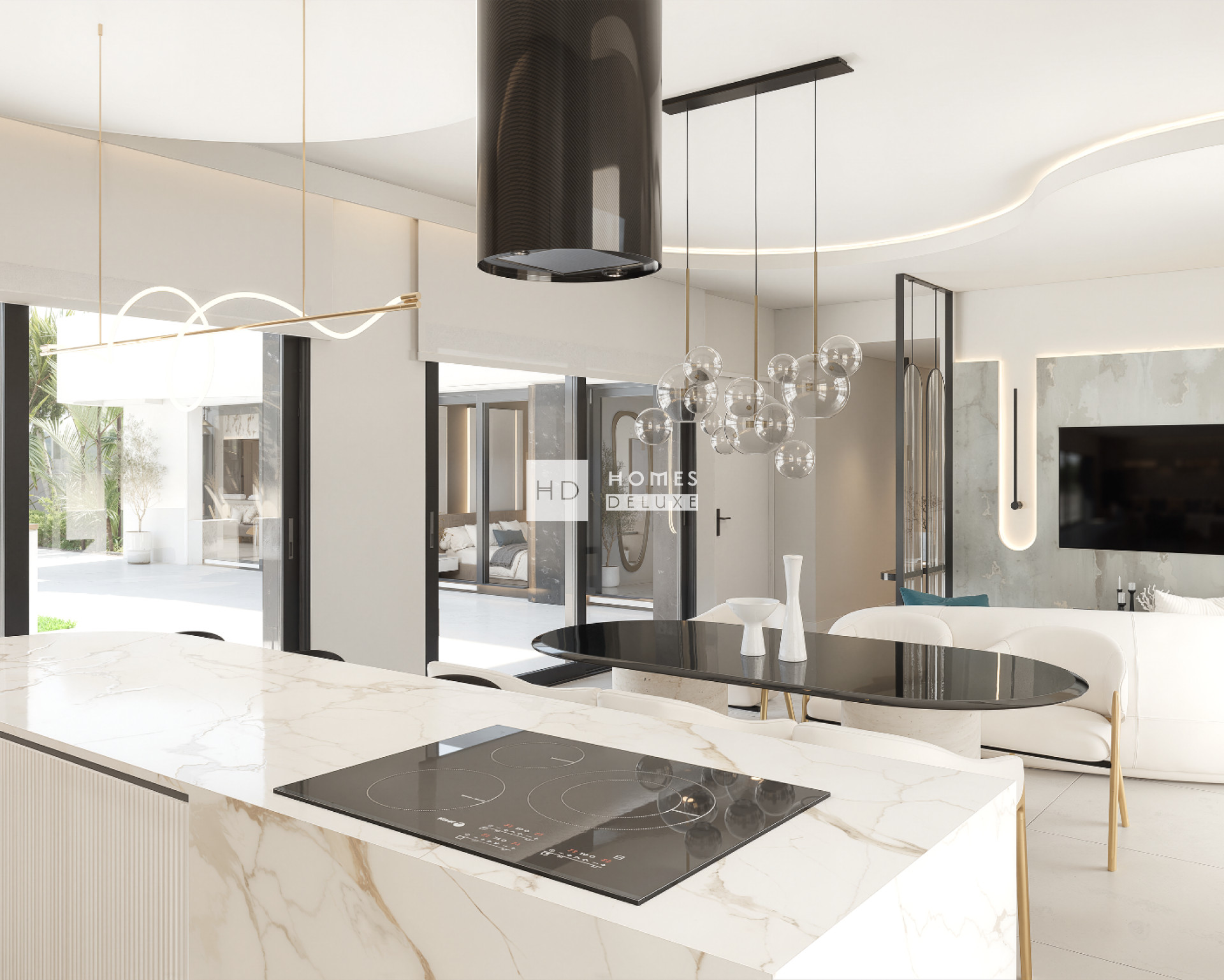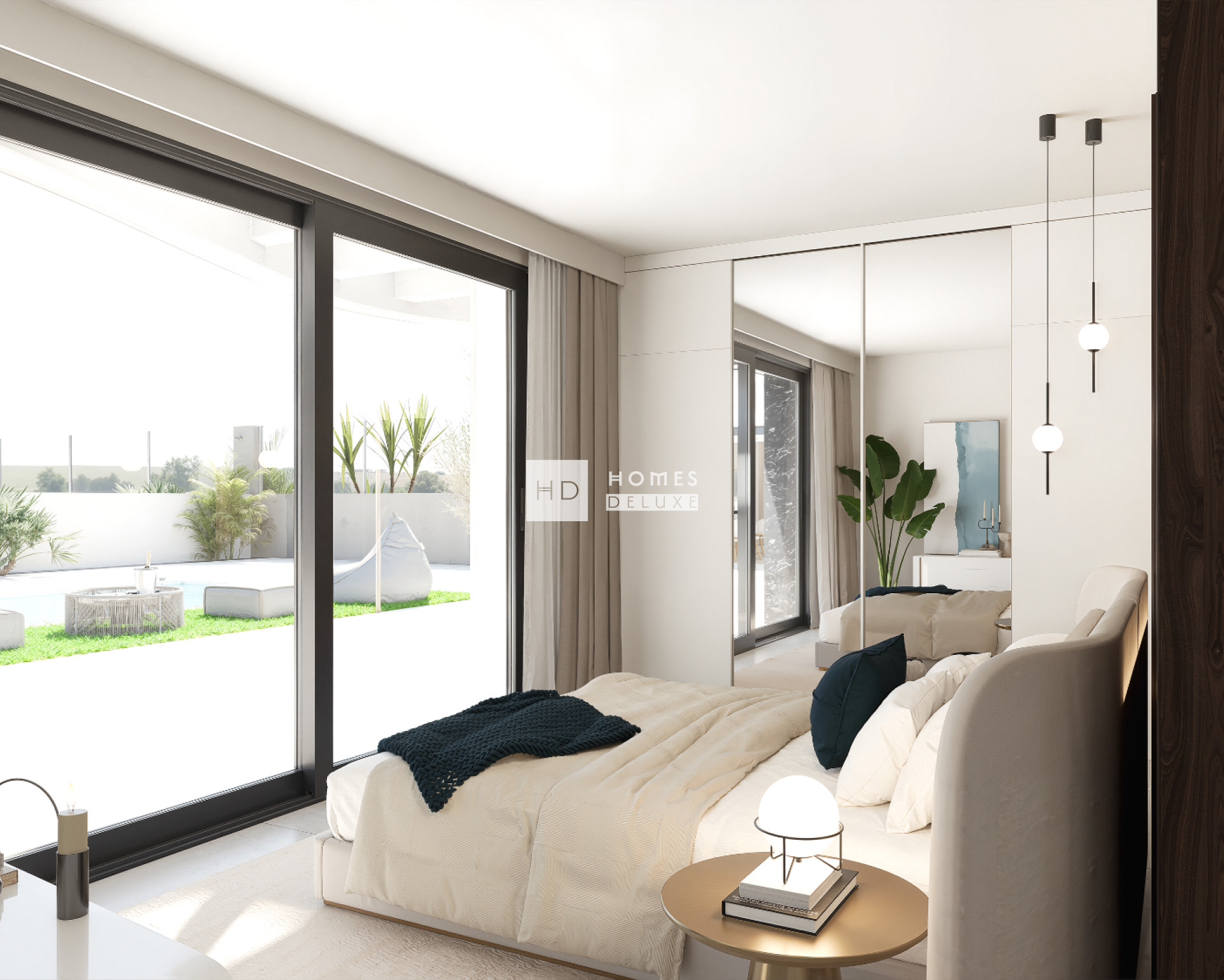 Diese besondere Villa ist die größte Option innerhalb der Wohnanlage und verfügt über einen L-förmigen Grundriss, sodass praktisch das gesamte Haus einen Ausblick und Zugang zum großzügigen und luxuriösen Garten mit einem 7 x 3 m großen privaten Swimmingpool bietet. Ein weiteres Plus dieser Villa ist, dass das Untergeschoss im Preis inbegriffen ist. Die Villa ist ebenerdig und verfügt über einen hellen und geräumigen offenen Wohn- und Essbereich mit großen Fenstern, die viel Tageslicht hereinlassen und Zugang zur Terrasse bieten. Im Hauptwohnbereich befindet sich eine voll ausgestattete moderne Küche im amerikanischen Stil mit niedrigen und hohen Schränken und einer zentralen Kochinsel. Außerdem gibt es einen praktischen separaten Waschraum und eine Gästetoilette. Die beeindruckende Master-Suite verfügt über ein extra großes Schlafzimmer mit eigenem Bad und begehbarem Kleiderschrank/Ankleidebereich. Es gibt zwei weitere geräumige Doppelschlafzimmer, alle Schlafzimmer haben Zugang zur Hauptterrasse und es gibt ein separates Gästebad. Eine Außentreppe an der Seite des Grundstücks führt Sie hinauf zum großzügigen Dachsolarium, das sich perfekt eignet, um den ganzen Tag die Sonne zu genießen. Die Immobilien verfügen über eine Vorinstallation für eine Klimaanlage, Einbauschränke mit Schubladen in allen Schlafzimmern, LED-Beleuchtung im Innen- und Außenbereich, ein optionales Domotiksystem, einen Garten mit gepflasterten Flächen, Kunstrasen mit Platz für Landschaftsgestaltung und einen privaten Parkplatz auf dem Grundstück.