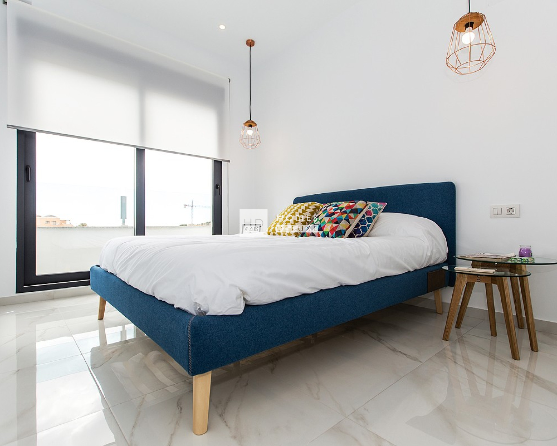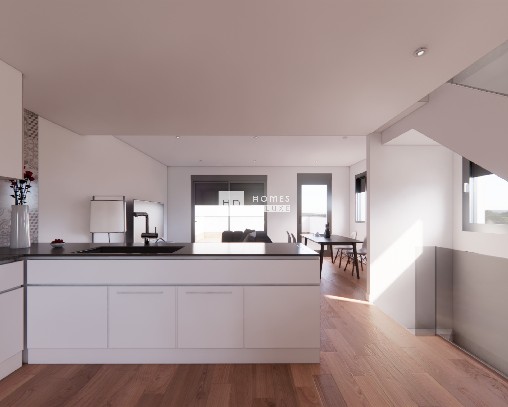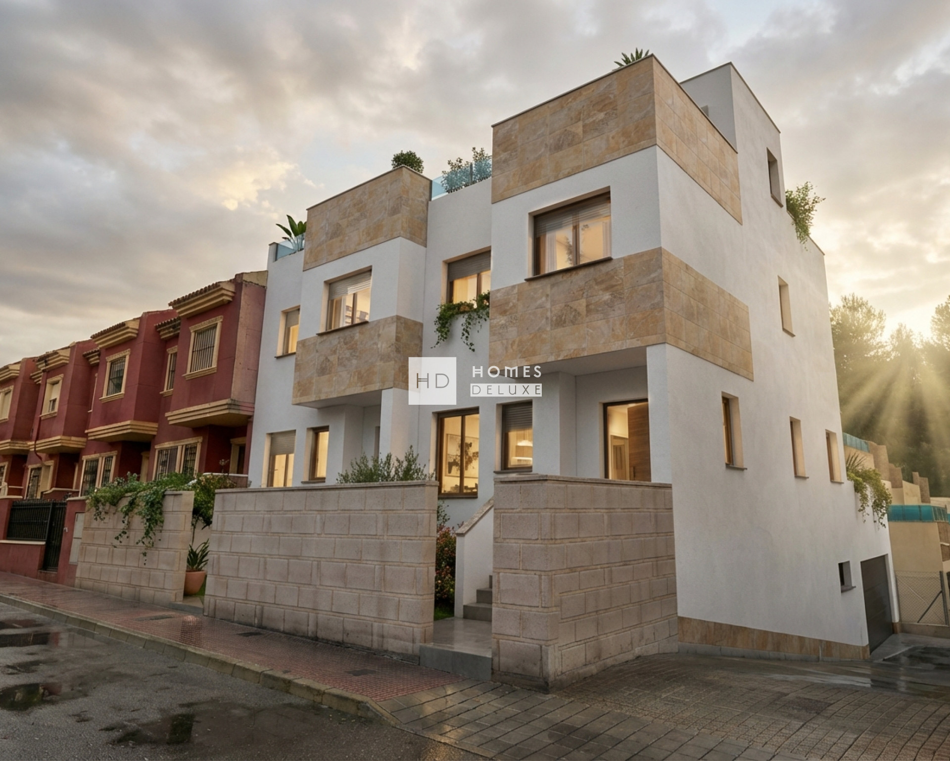 Die Innenausstattung umfasst einen Eingangsbereich, der zu einem geräumigen offenen Wohn- und Essbereich mit Terrassenfenstern führt, die sich zur Terrasse hin öffnen lassen. Im Hauptwohnbereich befindet sich eine große Küche im amerikanischen Stil mit glänzender Oberfläche, niedrigen und hohen Schränken und einem separaten Hauswirtschaftsraum. Im Erdgeschoss befindet sich außerdem eine praktische Gästetoilette in der Nähe des Haupteingangs. Die Innentreppe führt Sie in den ersten Stock, wo sich das Hauptschlafzimmer mit eigenem Bad, Ankleidebereich und Terrassentür zu einer privaten Terrasse befindet. Es gibt zwei weitere geräumige Doppelschlafzimmer und ein Familienbadezimmer. Die Innentreppe des Hauses führt auch zum großzügigen Dachsolarium und zum Untergeschoss mit Parkplatz für ein Fahrzeug und einer ferngesteuerten Zugangstür. Die Standardausstattung und -verarbeitung sind ausgezeichnet: Alle Immobilien verfügen über eine Vorinstallation für eine Klimaanlage, elektrische Jalousien im Wohn- und Schlafzimmer, Einbauschränke in allen Schlafzimmern, eine Gegensprechanlage und eine private Garage.