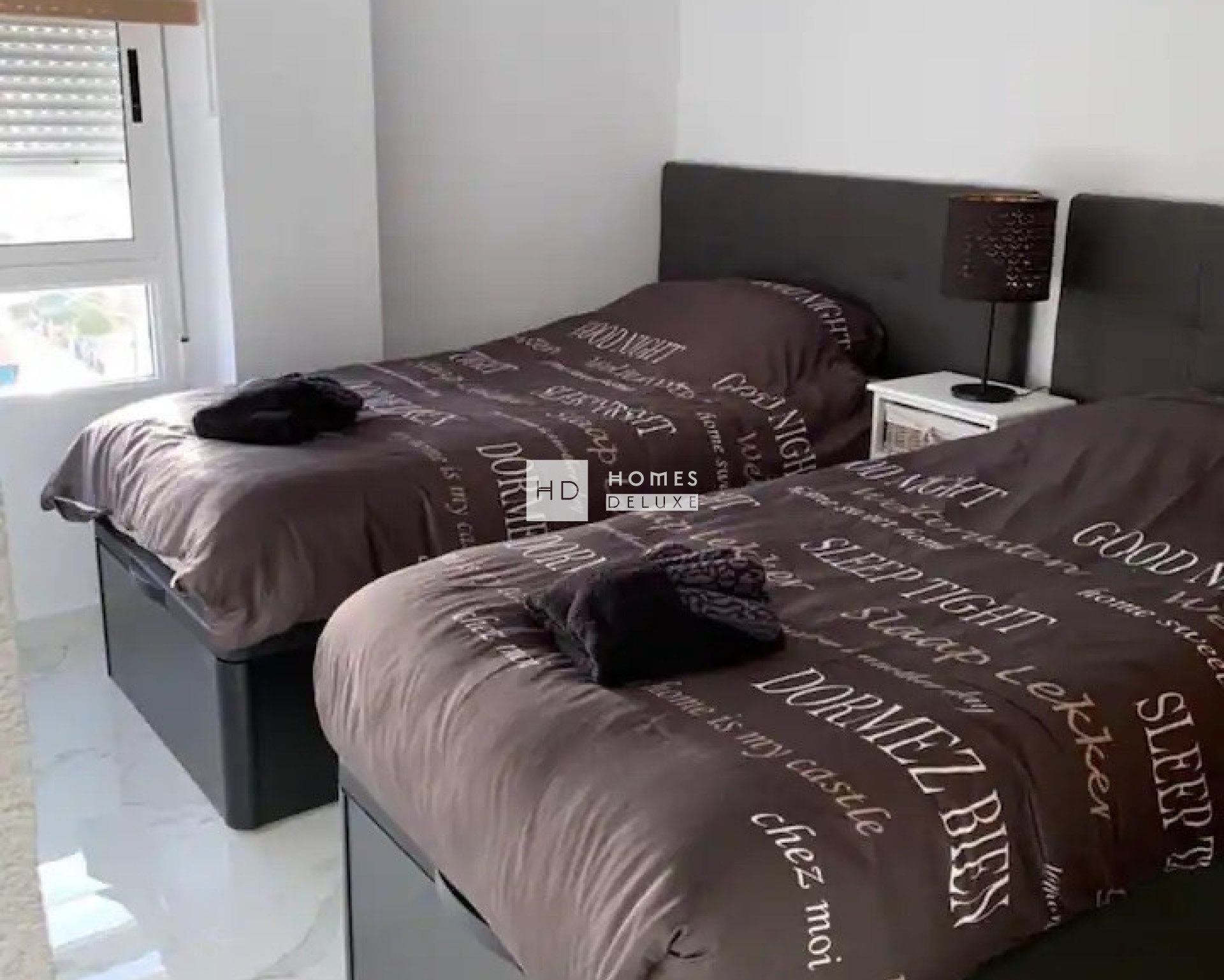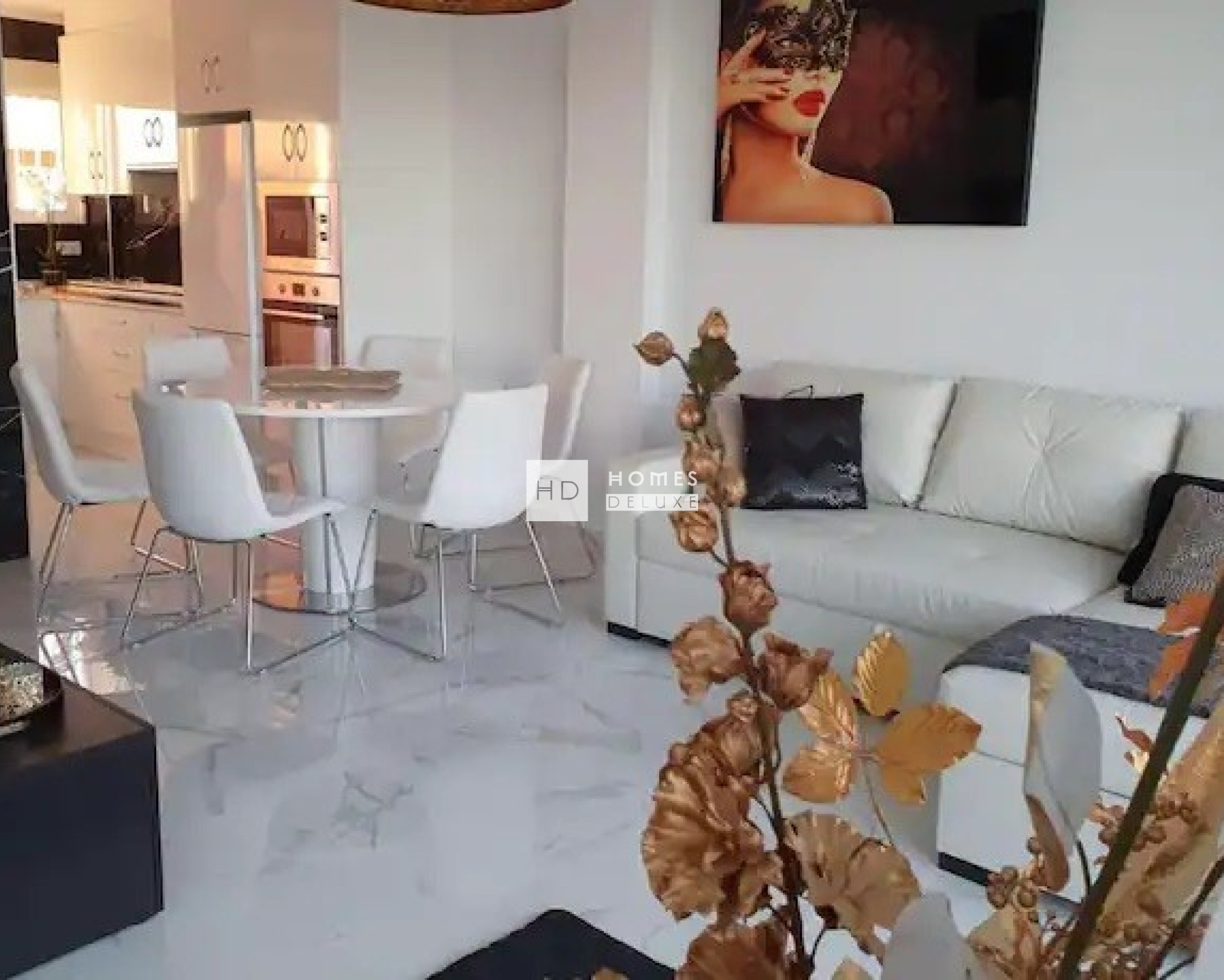 Die Innenausstattung ist offen gestaltet und verfügt über einen geräumigen Wohn- und Essbereich, der eine gemütliche und komfortable Atmosphäre ausstrahlt. Im Hauptwohnbereich befindet sich eine moderne Küche im amerikanischen Stil, die wunderschön in eleganten Schwarz- und Weißtönen gehalten ist. Es gibt zwei geräumige Doppelzimmer, wobei das beeindruckende Hauptschlafzimmer über große Doppelfenster verfügt, die einen atemberaubenden Blick nach draußen bieten. Beide stilvollen Badezimmer sind ebenfalls in den zeitgemäßen Schwarz- und Weißtönen gehalten und verfügen über Fenster, die für ein Maximum an natürlichem Licht sorgen. Die Immobilie verfügt über eine großzügige Terrasse mit Meerblick und einen privaten Dachsolarium, der den Außenbereich noch weiter vergrößert. Das Apartment verfügt außerdem über einen Parkplatz in einem umzäunten Bereich, was den Eigentümern zusätzlichen Komfort bietet.