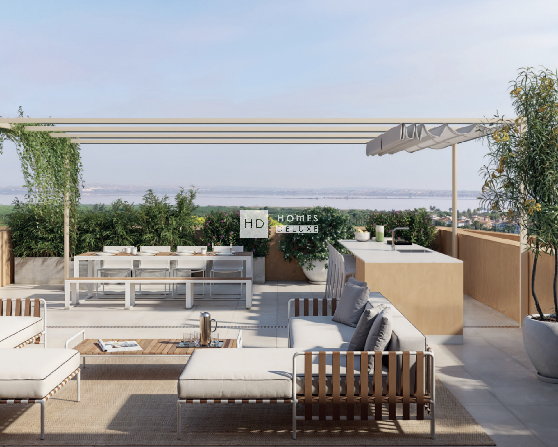 Es gibt die Wahl zwischen Wohnungen im Erdgeschoss mit einem privaten Garten und einer Terrasse an der Vorder- und Rückseite des Grundstücks und Wohnungen im obersten Stockwerk mit einer großen privaten Dachterrasse mit Panoramablick auf die Salzseen von Torrevieja. Beide Modelle nutzen den Außenbereich optimal aus. Einige der Wohnungen verfügen über ein Untergeschoss, das den Wohnraum zusätzlich vergrößert. Die Innenausstattung umfasst einen hellen und geräumigen offenen Wohn- und Essbereich mit großen Fenstern, die auf die Terrasse führen. Im Hauptwohnbereich befindet sich eine moderne Küche im amerikanischen Stil mit niedrigen und hohen Schränken sowie ein separater Bereich für die Waschmaschine und den Warmwasserbereiter. Das geräumige Hauptschlafzimmer verfügt über ein eigenes Bad und einen Ankleidebereich. Es gibt zwei weitere geräumige Doppelschlafzimmer und ein separates Gästebad. Die Apartments in der obersten Etage verfügen über eine Außentreppe auf der vorderen Terrasse, die Sie auf die 82 m² große Dachterrasse führt. Die Immobilien sind mit einer Vorinstallation für eine Klimaanlage, Einbauschränken in allen Schlafzimmern, LED-Außenbeleuchtung, elektrischen Jalousien sowie einer privaten Tiefgarage und einem Abstellraum ausgestattet.