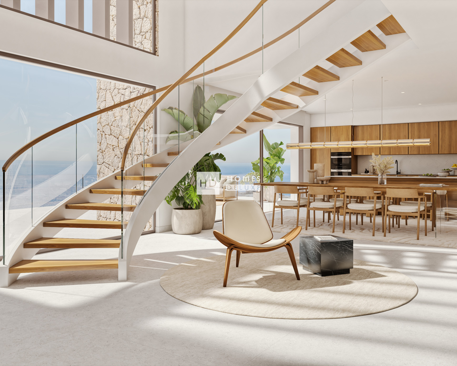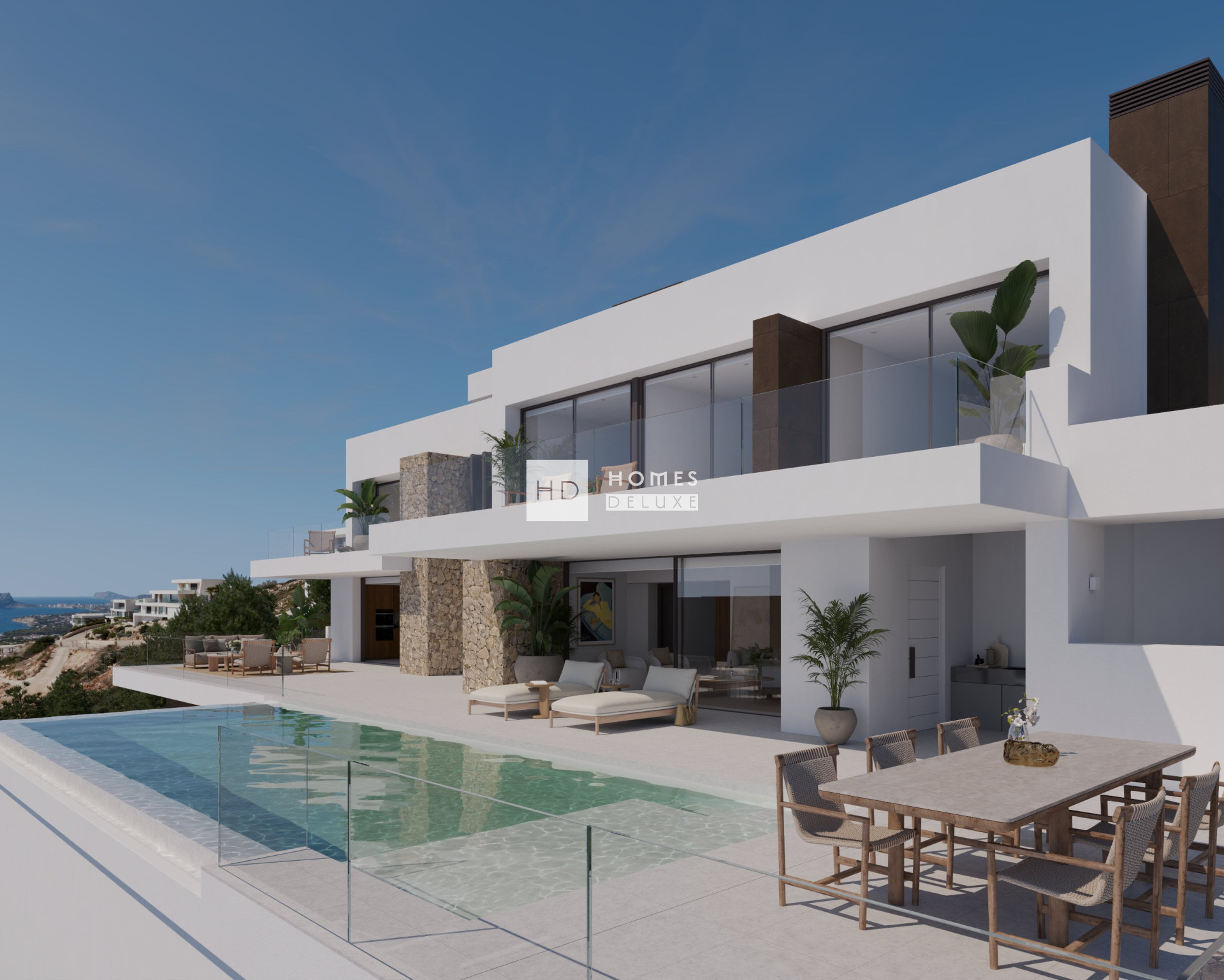 Gelegen auf einem exklusiven Grundstück in Residencial Jazmines, Cumbre del Sol, ist Villa Ocaso ein modernes architektonisches Zuhause, das darauf ausgelegt ist, seine Ausrichtung und den offenen Blick auf das Mittelmeer optimal zu nutzen. Die moderne Struktur mit klaren Volumen und großen bodentiefen Fenstern ermöglicht eine natürliche Integration zwischen Innen- und Außenbereich. Das Hauptgeschoss konzentriert sich auf die Tageszone, mit einem Wohn-Essbereich, der sich direkt zur Terrasse und zum Infinity-Pool öffnet. Die offene Küche, ausgestattet mit hochwertigen Materialien wie Walnussholz, bietet Funktionalität und Panoramablicke und wird so zum zentralen Bereich sowohl für den Alltag als auch für gesellschaftliche Anlässe. Im Obergeschoss befinden sich die Schlafzimmer, alle mit Zugang zu privaten Terrassen und Meerblick. Die Master-Suite besticht durch ihre Großzügigkeit, eine private Terrasse und ein en-suite Badezimmer mit modernen Details. Die Villa verfügt außerdem über ein Untergeschoss, das als zusätzliches Wohnzimmer, Schlafzimmer oder multifunktionaler Raum genutzt werden kann, mit direktem Zugang zu einer Außenterrasse. Die Innenräume bewahren eine minimalistische und warme Ästhetik, mit Holzelementen, die Komfort und visuelle Kontinuität bieten. Große Fenster gewährleisten den ganzen Tag über Licht und ermöglichen den Genuss der Umgebung aus den meisten Räumen. Villa Ocaso ist mit hocheffizienter Ausstattung und moderner Technologie ausgestattet, darunter Photovoltaikanlagen, Vorinstallation für eine Ladestation für Elektrofahrzeuge, Klimaanlage und Warmwasserbereitung über eine Mitsubishi Electric®-Wärmepumpe, mechanische Lüftung mit Wärmerückgewinnung, Fußbodenheizung und Smart-Home-Steuerung für die Fernverwaltung der Anlagen. Mit einer durchdachten Raumaufteilung, die Privatsphäre, Ausblicke und Komfort garantiert, ist Villa Ocaso die ideale Wahl für alle, die ein modernes, effizientes Zuhause in einer der exklusivsten Gegenden von Cumbre del Sol suchen.