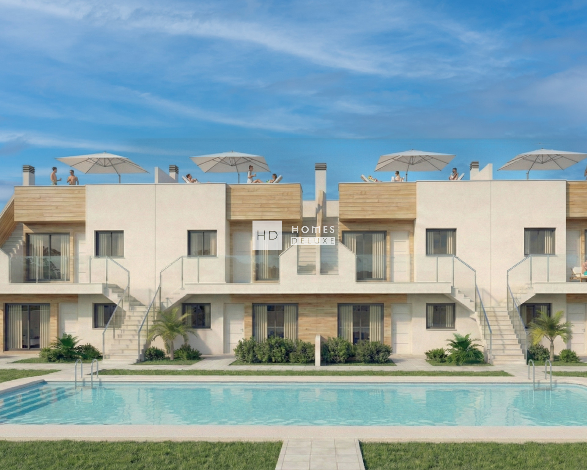 Die Innenausstattung mit 3 Schlafzimmern umfasst einen geräumigen offenen Wohn- und Essbereich mit Terrassentüren, die auf die Terrasse führen. Im Hauptwohnbereich befindet sich eine voll ausgestattete moderne Küche im amerikanischen Stil in weißer Ausführung mit einer Calacatta-Arbeitsplatte, die in verschiedenen Farben zur Auswahl steht. Das große Hauptschlafzimmer befindet sich auf der Rückseite des Anwesens und verfügt über eine Terrassentür mit Zugang zur Terrasse sowie ein eigenes Badezimmer. Es gibt zwei weitere geräumige Doppelschlafzimmer und ein separates Gästebad. Die Wohnungen im obersten Stockwerk verfügen über eine Außentreppe auf der Terrasse, die Sie zum 70 m² großen Dachsolarium führt, das eine Sommerküche für Mahlzeiten im Freien umfasst. Die Wohnungen im Erdgeschoss verfügen ebenfalls über eine Sommerküche, die sich auf der hinteren Terrasse befindet.