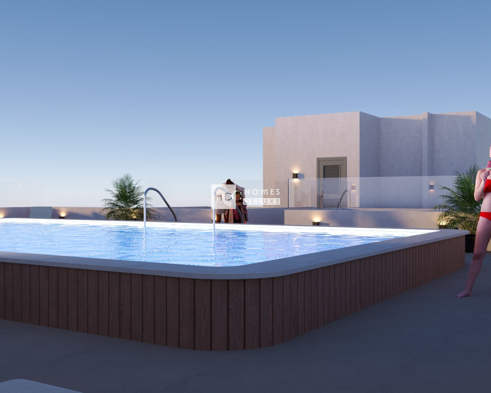 Der Gemeinschaftsbereich im Erdgeschoss bildet das soziale Herzstück der Anlage – ein angenehmer Treffpunkt für die Bewohner, umgeben von grünen Gärten, Sitzbereichen, Fahrradabstellplätzen und einem Kinderspielplatz. Auf dem Dach können die Bewohner einen exklusiven 350 m² großen Freizeitbereich mit einem 70 m² großen Swimmingpool mit Kinderplanschbecken, Pergolen, Sonnenschirmen und Liegestühlen genießen – alles, was man braucht, um sich unter der spanischen Sonne zu entspannen und dabei den Panoramablick zu genießen. Dieser Bereich ist über einen der drei Aufzüge leicht erreichbar und mit den notwendigen Sanitäranlagen ausgestattet.