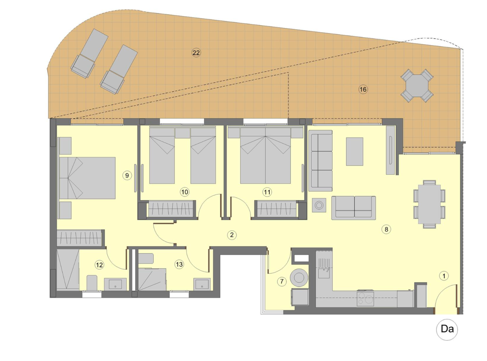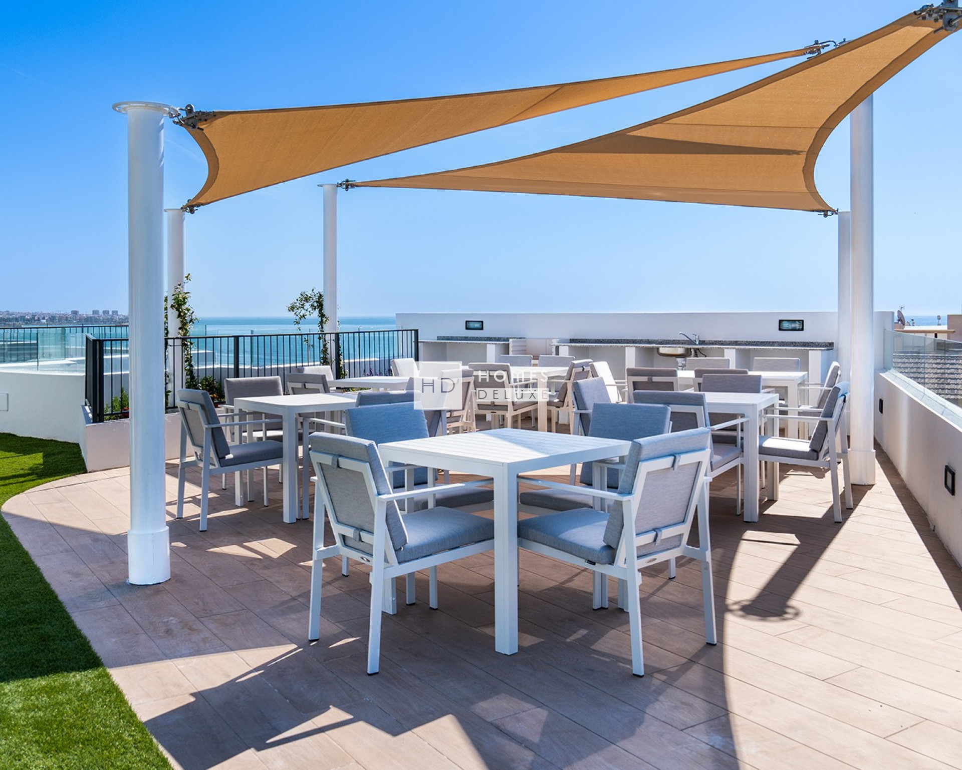 Die Wohnanlage besteht aus 36 Wohnungen mit 2 und 3 Schlafzimmern und 2 Badezimmern, mit Parkplatz und Abstellraum. Die Gemeinschaftsbereiche befinden sich auf der Dachterrasse und bieten einen 360º-Blick auf das Meer und die Umgebung. Hier können Sie im Infinity-Pool schwimmen oder im Chill-out-Bereich entspannen, grillen oder auf den Sonnenliegen sonnenbaden und dabei den Blick auf das Meer genießen. Darüber hinaus wird die Wohnanlage über Parkplätze und Abstellräume im Untergeschoss sowie einen Abstellbereich für Fahrräder verfügen.