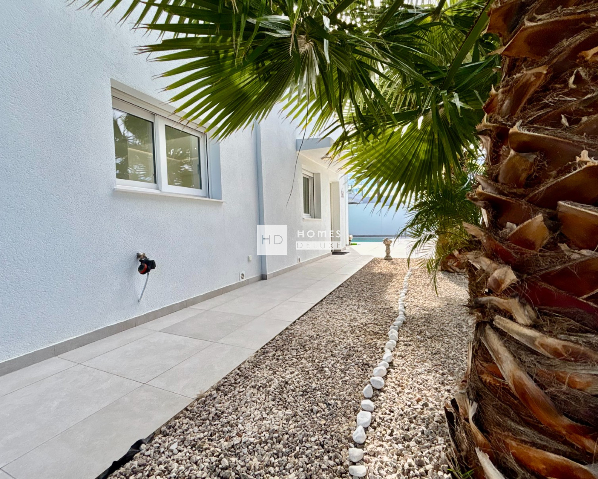 Diese fast neue, einstöckige freistehende Villa auf einem Eckgrundstück bietet eine seltene Kombination aus modernem Design, großzügigem Außenbereich und außergewöhnlichem Komfort. Auf einem weitläufigen Eckgrundstück von mehr als 400 Quadratmetern gelegen, bietet die Immobilie sowohl Privatsphäre als auch Offenheit und ist somit ein ideales Zuhause für das ganze Jahr, ein stilvoller Rückzugsort für den Urlaub oder eine hochwertige Investition in einer der begehrtesten Wohngegenden der Costa Blanca. Vom ersten Moment an prägt die zeitgenössische Architektur der Villa das Bild. Klare Linien, große Fenster und eine harmonische Materialkombination schaffen eine helle, elegante Ästhetik, die sich im gesamten Innenbereich fortsetzt.