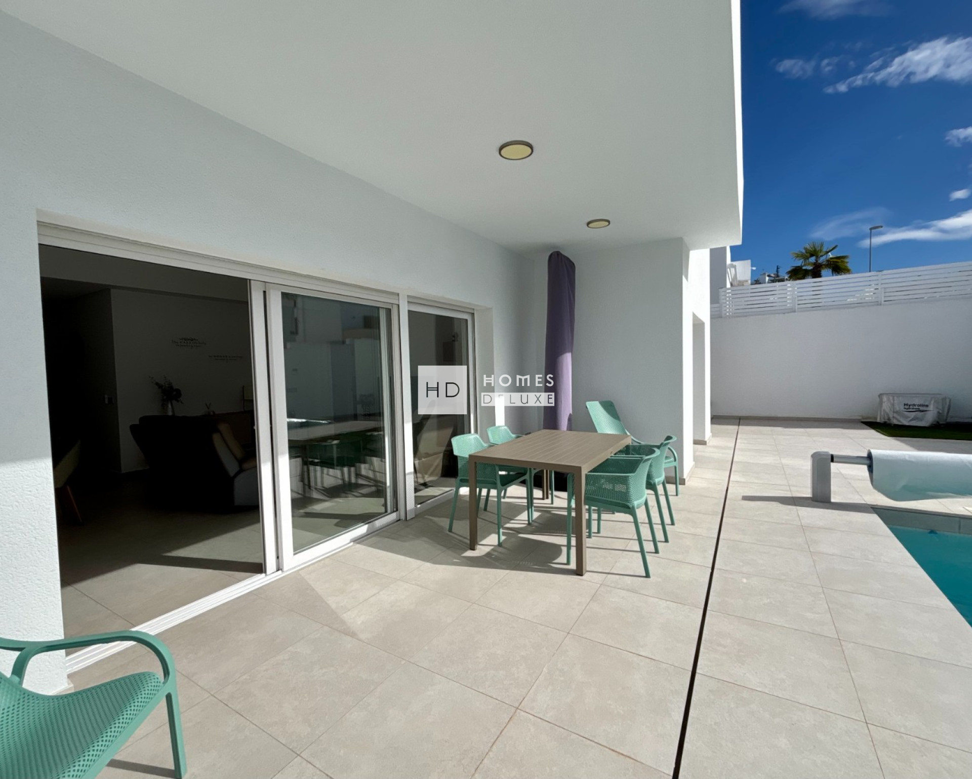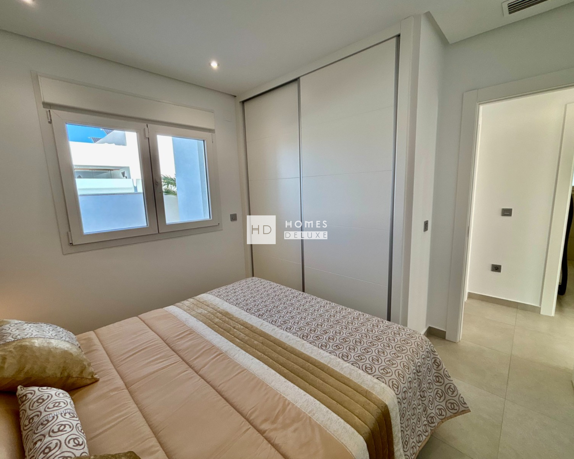 Das Haus ist durchdacht auf einer Ebene gestaltet, was einen einfachen Zugang und einen nahtlosen Übergang zwischen Innen- und Außenwohnbereichen gewährleistet. Diese Aufteilung ist besonders attraktiv für diejenigen, die Komfort, Bequemlichkeit und einen modernen mediterranen Lebensstil suchen. Die Villa verfügt über drei gut proportionierte Schlafzimmer, die jeweils viel Tageslicht und eingebaute Stauräume bieten. Die Hauptsuite zeichnet sich durch ihren direkten Zugang zum Garten und zum Poolbereich aus und schafft einen ruhigen Rückzugsort, an dem Sie mit dem sanften spanischen Sonnenlicht aufwachen können. Die beiden stilvollen Badezimmer sind mit hochwertigen Materialien und modernen Armaturen ausgestattet und bieten ein elegantes, Spa-ähnliches Ambiente, das den luxuriösen Gesamteindruck des Hauses unterstreicht. Das Herzstück der Immobilie ist der offene Wohnbereich, der so gestaltet ist, dass er Raum und Licht maximiert. Die moderne Küche, die mit hochwertigen Oberflächen und großzügigen Arbeitsflächen ausgestattet ist, geht nahtlos in den Ess- und Wohnbereich über. Große Schiebetüren öffnen sich direkt zur Terrasse und lassen den Innenraum wunderschön mit der Außenumgebung verschmelzen. Ob Sie Gäste bewirten, einen ruhigen Abend genießen oder einfach nur mit der Familie entspannen möchten, dieser Raum passt sich perfekt an jeden Anlass an.