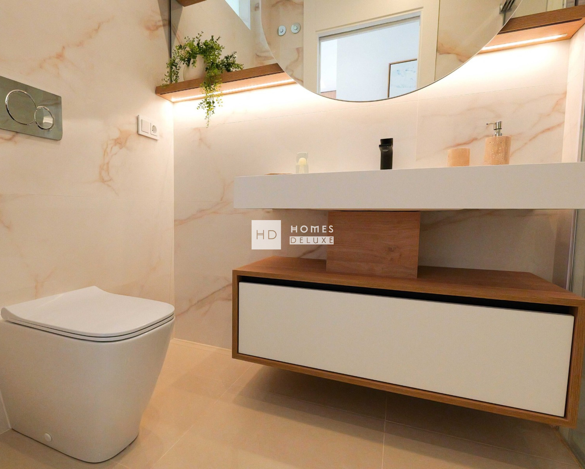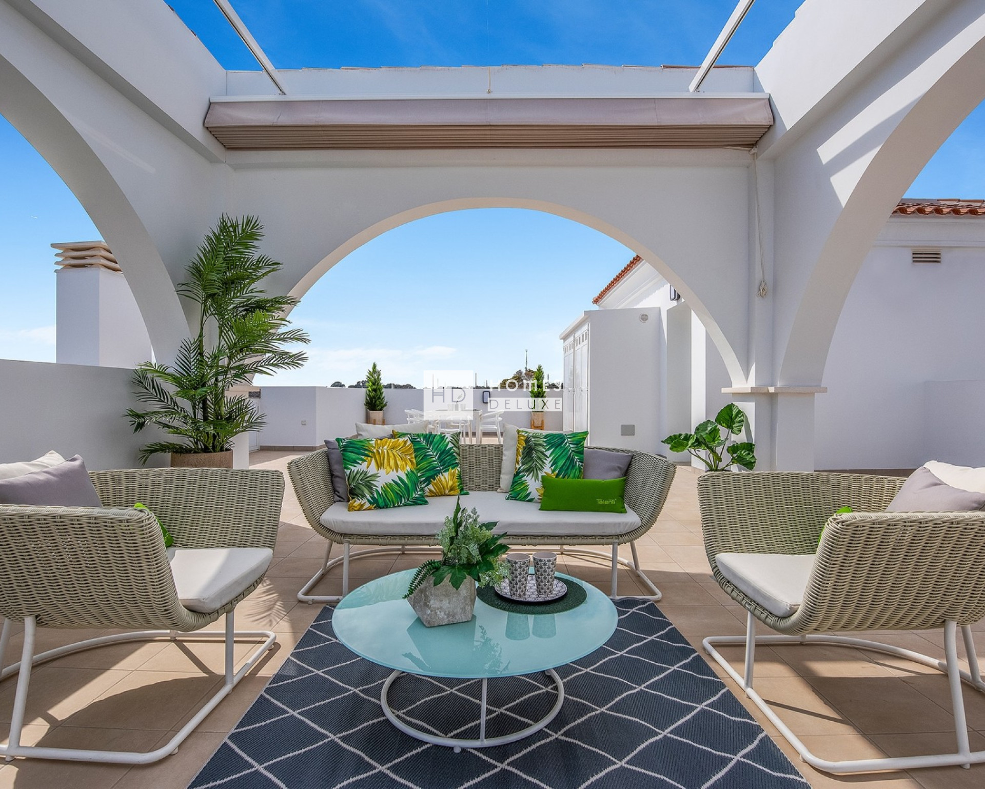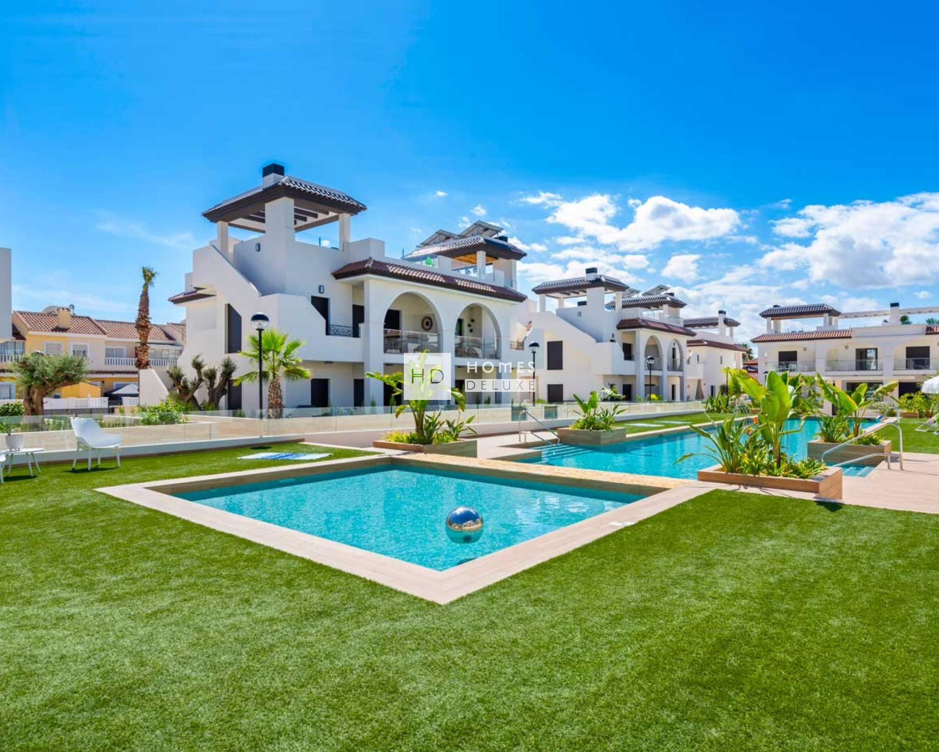 Der Komplex bietet Ihnen die Wahl zwischen Apartments im Erdgeschoss mit großzügigem Privatgarten und Terrasse oder Apartments im obersten Stockwerk mit großem Dachsolarium. Die Innenausstattung umfasst einen Eingangsflur, der zu einem hellen und geräumigen offenen Wohn- und Essbereich mit Fenstern zur Terrasse führt. Im Hauptwohnbereich befindet sich eine Küche im amerikanischen Stil mit niedrigen und hohen Schränken sowie einer Frühstückstheke. Das große Hauptschlafzimmer verfügt über ein eigenes Bad. Es gibt zwei weitere geräumige Doppelschlafzimmer und ein separates Gästebad. Die Wohnungen im obersten Stockwerk verfügen über eine Außentreppe auf der Terrasse, die zum 95 m² großen Dachsolarium führt, auf dem Sie den ganzen Tag die Sonne genießen können. Die Immobilien sind mit einer Vorinstallation für eine Klimaanlage, Einbauschränken in allen Schlafzimmern, elektrischen Jalousien, einer Gegensprechanlage und einem privaten Parkplatz ausgestattet.