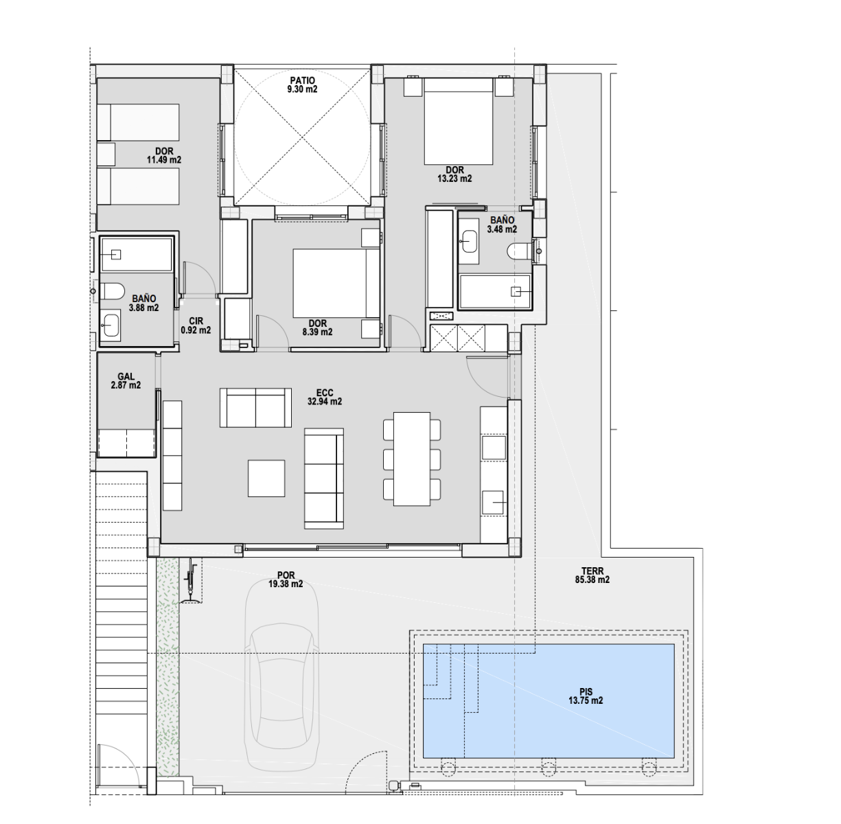 Die Apartments verfügen über eine elegante und funktionale Innenausstattung und bestehen aus einem hellen und geräumigen offenen Wohn- und Essbereich mit großen Fenstern, die auf die Terrasse führen. Im Hauptwohnbereich befindet sich eine voll ausgestattete moderne Küche im amerikanischen Stil mit einer Arbeitsplatte aus Silestone, einige Wohnungen verfügen über einen separaten Hauswirtschaftsraum. Das große Hauptschlafzimmer verfügt über ein eigenes Bad, es gibt zwei weitere geräumige Doppelschlafzimmer und ein separates Gästebad. Die Wohnungen im obersten Stockwerk verfügen über eine Außentreppe auf der Terrasse, die zum großzügigen Dachsolarium führt, auf dem Sie den ganzen Tag die Sonne genießen können.