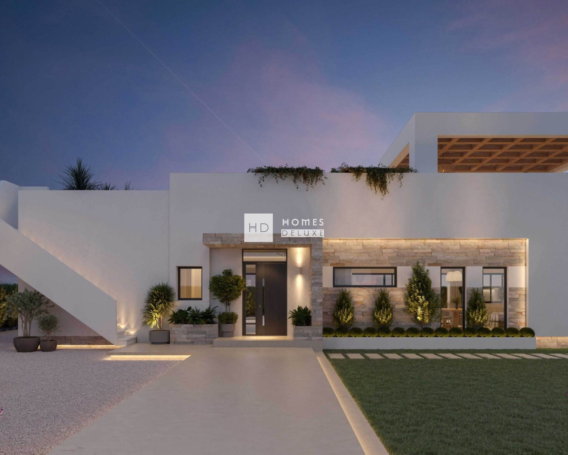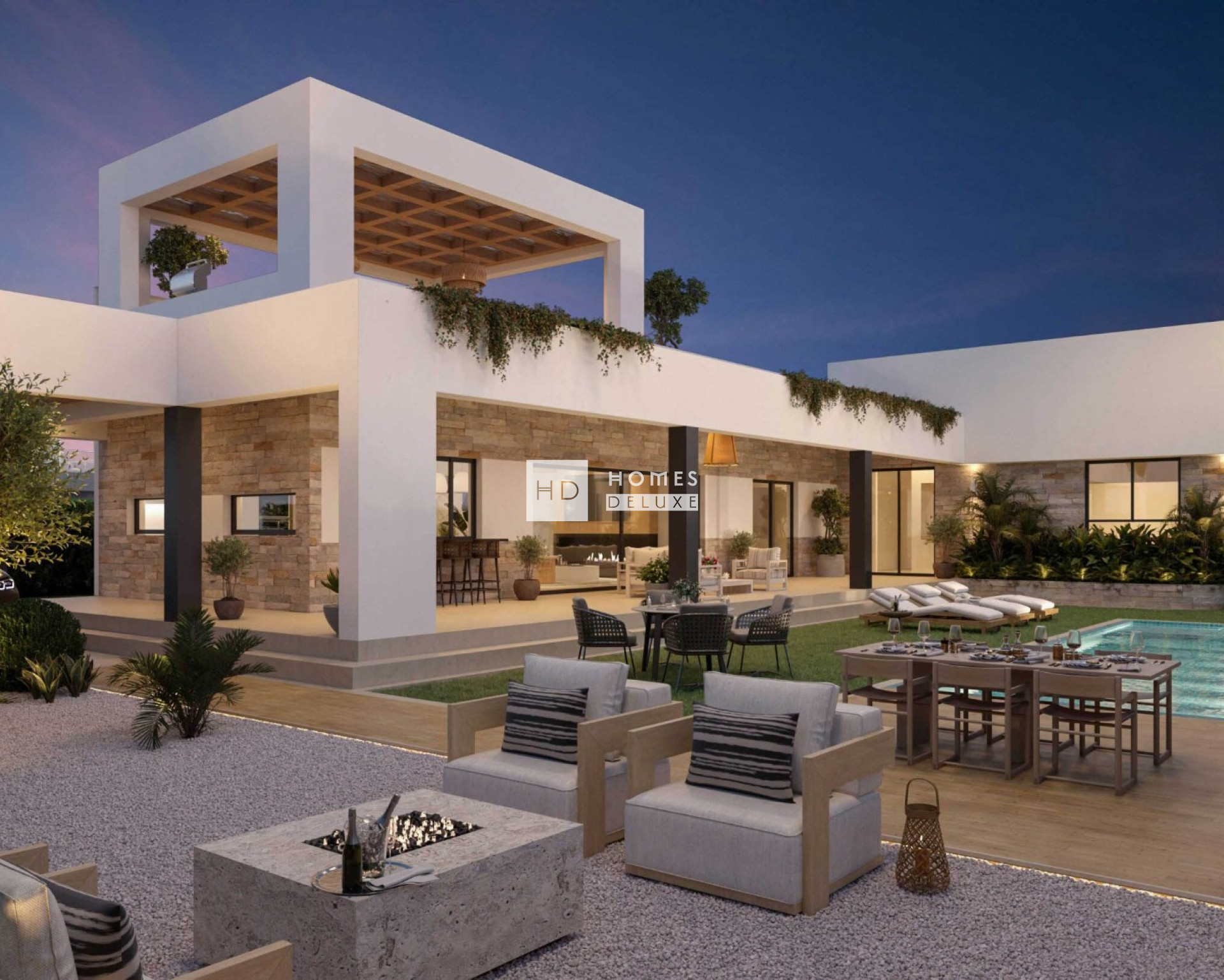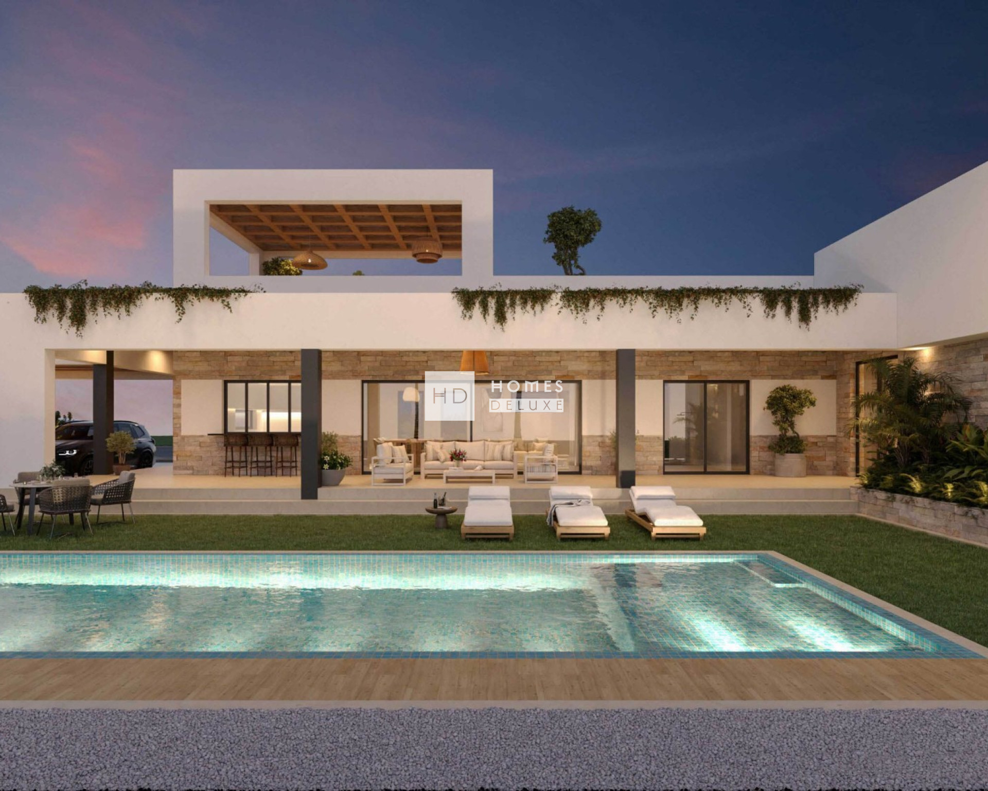 Ein Zuhause, in dem mediterranes Design nahtlos mit moderner Architektur, natürlichen Materialien und offenen Räumen verschmilzt, die geschaffen wurden, um das ganze Jahr über das Leben im Freien zu genießen. Die Immobilie ist auf einer Ebene angelegt und bietet drei geräumige Schlafzimmer und drei elegante Badezimmer, die sorgfältig angeordnet sind, um Komfort und Privatsphäre zu gewährleisten. Natürliches Licht durchflutet jeden Winkel und unterstreicht die warmen Farbtöne von Stein, Holz und neutralen Oberflächen.