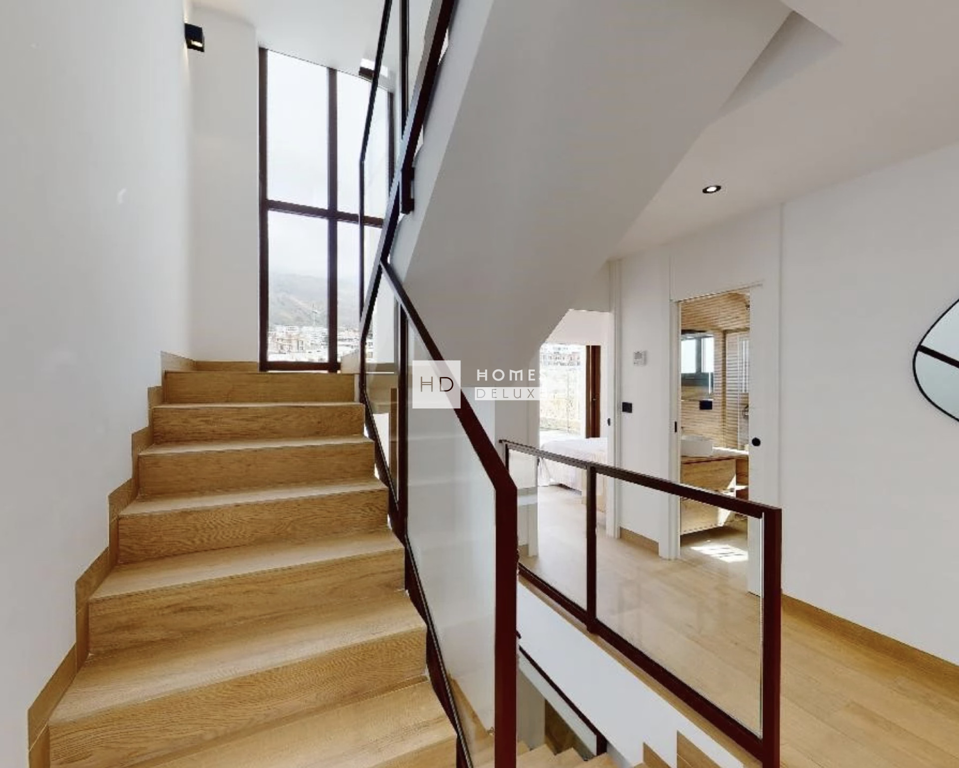 Die Innenaufteilung besteht aus einem Eingangsbereich, der zu einem geräumigen offenen Wohn- und Essbereich mit hohen Decken und großen Fenstern führt, die sich zur Terrasse und zum Garten hin öffnen. Im Hauptwohnbereich befindet sich eine voll ausgestattete moderne amerikanische Küche und ein separater Hauswirtschaftsraum. Im Erdgeschoss befindet sich auch die beeindruckende Primärsuite mit einem großen Schlafzimmer, einem eigenen Bad und einem begehbaren Kleiderschrank / Ankleidebereich. Über die Innentreppe gelangt man in den ersten Stock mit zwei weiteren großen Doppelschlafzimmern und einem separaten Gästebad. Das Anwesen verfügt auch über ein fertiges Kellergeschoss mit einem großen Mehrzweckraum, den man in ein zweites Wohnzimmer, einen Fitnessraum, ein Spielzimmer usw. umwandeln kann. Außerdem gibt es einen Bodega-Bereich, ein weiteres Schlafzimmer mit Doppelbett und ein zweites Gästebad, ideal für Gäste oder größere Familien. Das Untergeschoss genießt dank des englischen Patios und der großen Fenster viel natürliches Licht.