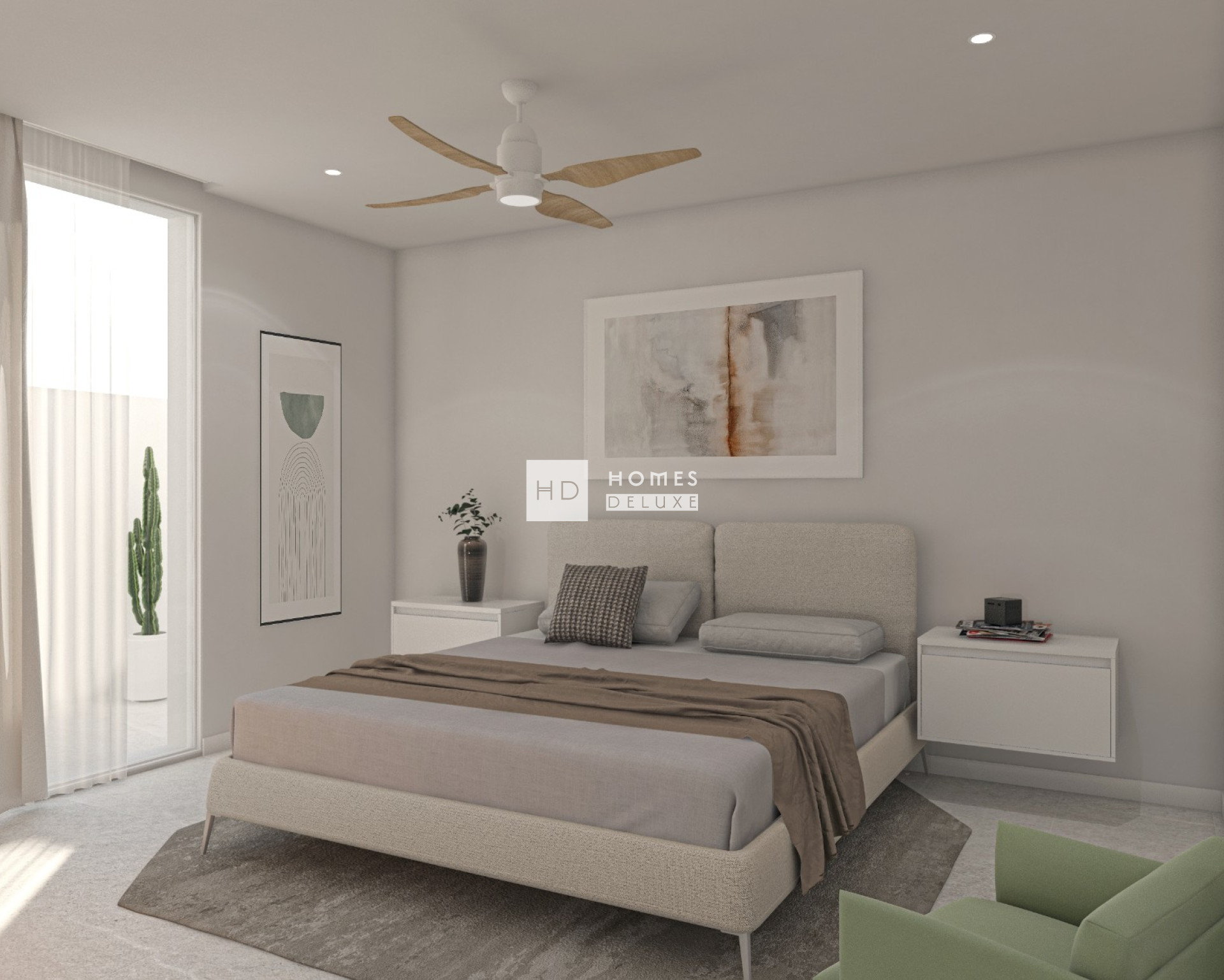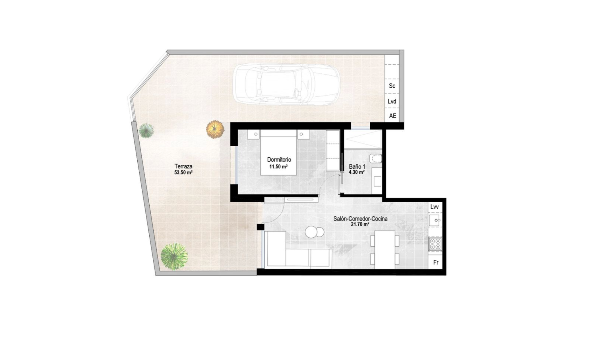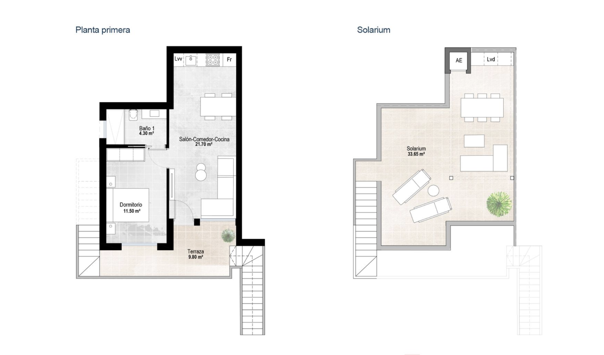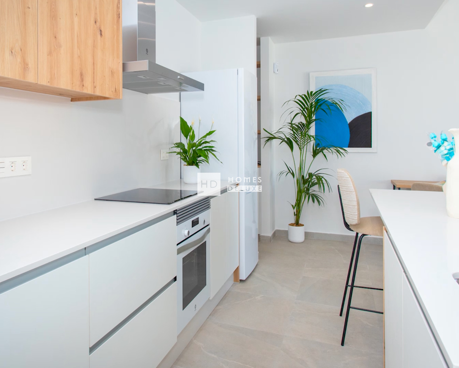 Die Raumaufteilung umfasst einen großzügigen, offenen Wohn- und Essbereich mit großen Fenstern, die auf die private Terrasse führen. Im Hauptwohnbereich befindet sich eine voll ausgestattete Küche im amerikanischen Stil mit Frühstückstheke (je nach Wohnungsmodell verfügen einige über einen separaten Hauswirtschaftsraum). Das große Schlafzimmer verfügt über eine Terrassentür zur Terrasse und ein eigenes Bad. Die Wohnungen im obersten Stockwerk haben eine Außentreppe auf der Terrasse, die zum weitläufigen Dachterrasse-Solarium führt, auf dem man den ganzen Tag lang die Sonne genießen kann.