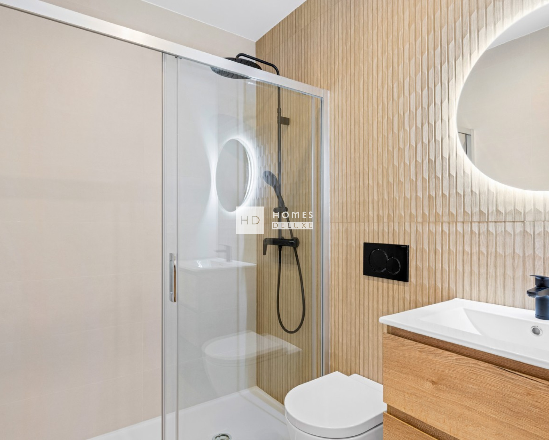 Die Innenausstattung besteht aus einem Eingangsbereich, der zu einem geräumigen, offenen Wohn- und Essbereich mit Terrassentüren führt, die auf die private Terrasse mit Blick auf den Gemeinschaftspool führen. Im Hauptwohnbereich befindet sich eine voll ausgestattete, moderne Küche im amerikanischen Stil. Das große Hauptschlafzimmer verfügt über ein eigenes Bad, ein weiteres großes Doppelschlafzimmer und ein separates Gästebad. Die Penthouse-Varianten verfügen über eine Innentreppe, die auf die große Dachterrasse führt, wo man den ganzen Tag die Sonne genießen kann. Die Wohnungen sind mit vorinstallierter Klimaanlage, elektrischen Küchengeräten und einer Video-Gegensprechanlage ausgestattet.