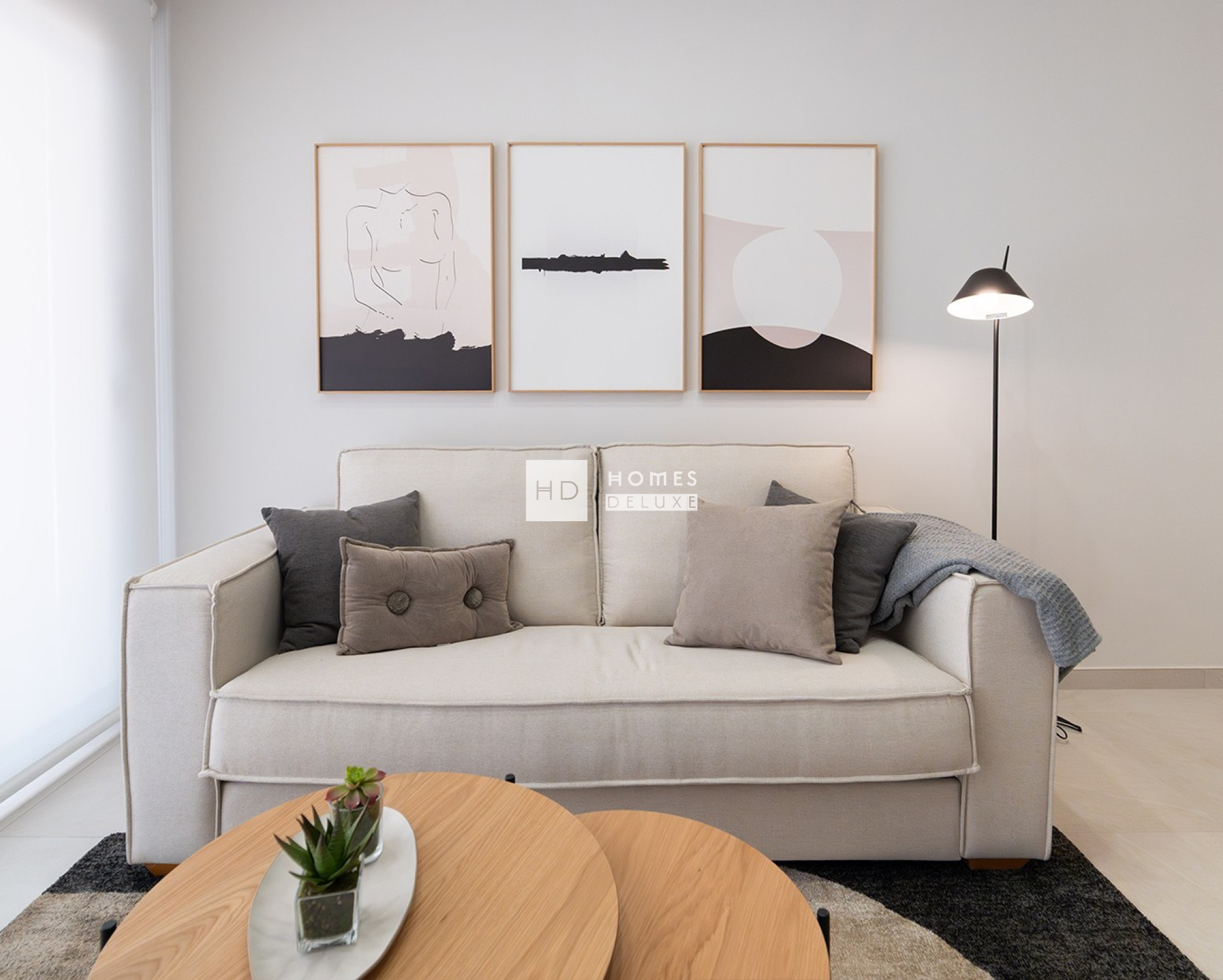 Die Innenaufteilung besteht aus einem geräumigen offenen Wohn- und Essbereich mit Terrassentüren, die Zugang zur Terrasse bieten, einer modernen Küche im amerikanischen Stil mit einem separaten Hauswirtschaftsraum, einem Hauptschlafzimmer, einem weiteren Doppelschlafzimmer und einem separaten Gästebad, das durch eine Doppeltür vom Hauptschlafzimmer und vom Flur aus zugänglich ist. In den Apartmentoptionen mit zwei Badezimmern ist das zusätzliche Badezimmer ein en-suite Badezimmer zum Hauptschlafzimmer. Die Wohnungen verfügen über eine vorinstallierte Klimaanlage, eine Fußbodenheizung in den Bädern der Premium-Wohnungen, Einbauschränke in allen Schlafzimmern, eine TV-Empfangsanlage und einen privaten Tiefgaragenstellplatz. Es gibt verschiedene optionale Extras, wie z.B. die Wahl zwischen verschiedenen Möbelpaketen, um die Wohnungen auf einem sehr hohen Standard einzurichten.