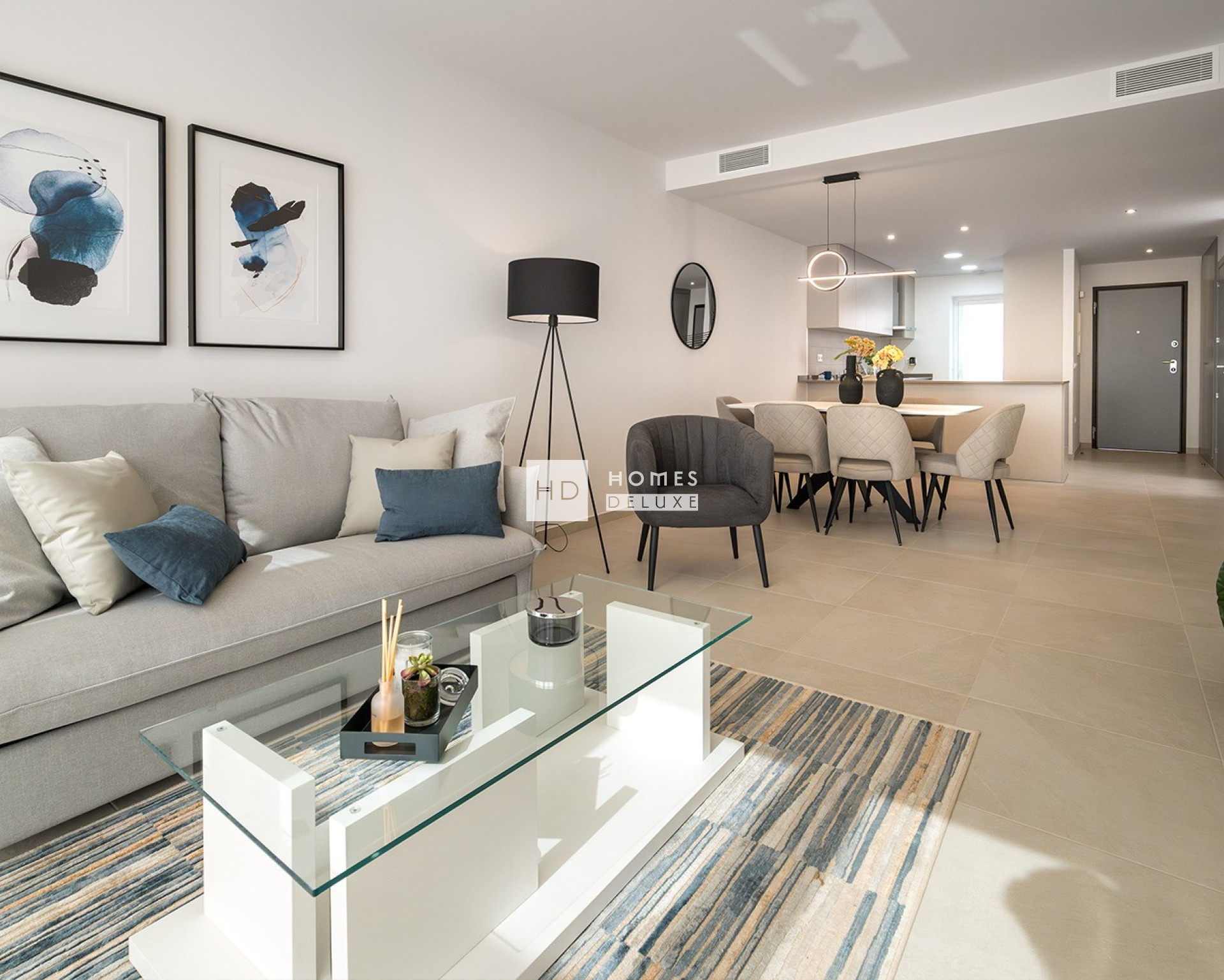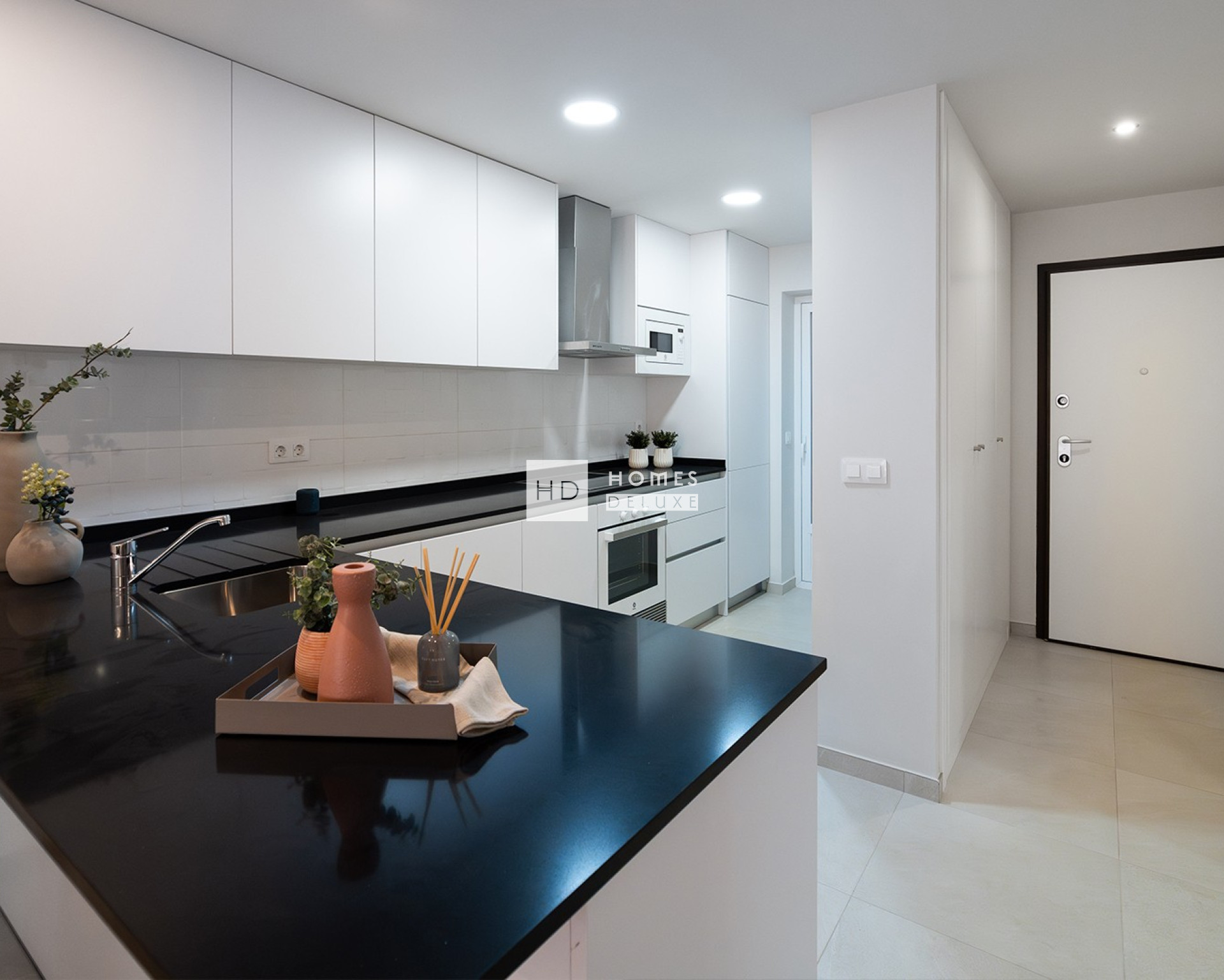 Die Innenaufteilung umfasst einen geräumigen offenen Wohn- und Essbereich mit Terrassentüren, die Zugang zur Terrasse bieten, eine moderne amerikanische Küche mit separatem Hauswirtschaftsraum, ein großes Schlafzimmer und ein separates Badezimmer. Die Wohnungen verfügen über eine vorinstallierte Klimaanlage, Fußbodenheizung in den Bädern der Premium-Wohnungen, Einbauschränke in allen Schlafzimmern, eine TV-Empfangsanlage und einen privaten Tiefgaragenstellplatz. Es gibt verschiedene optionale Extras, wie z.B. die Möglichkeit, verschiedene Möbelpakete auszuwählen, um die Wohnungen auf einem sehr hohen Standard einzurichten.