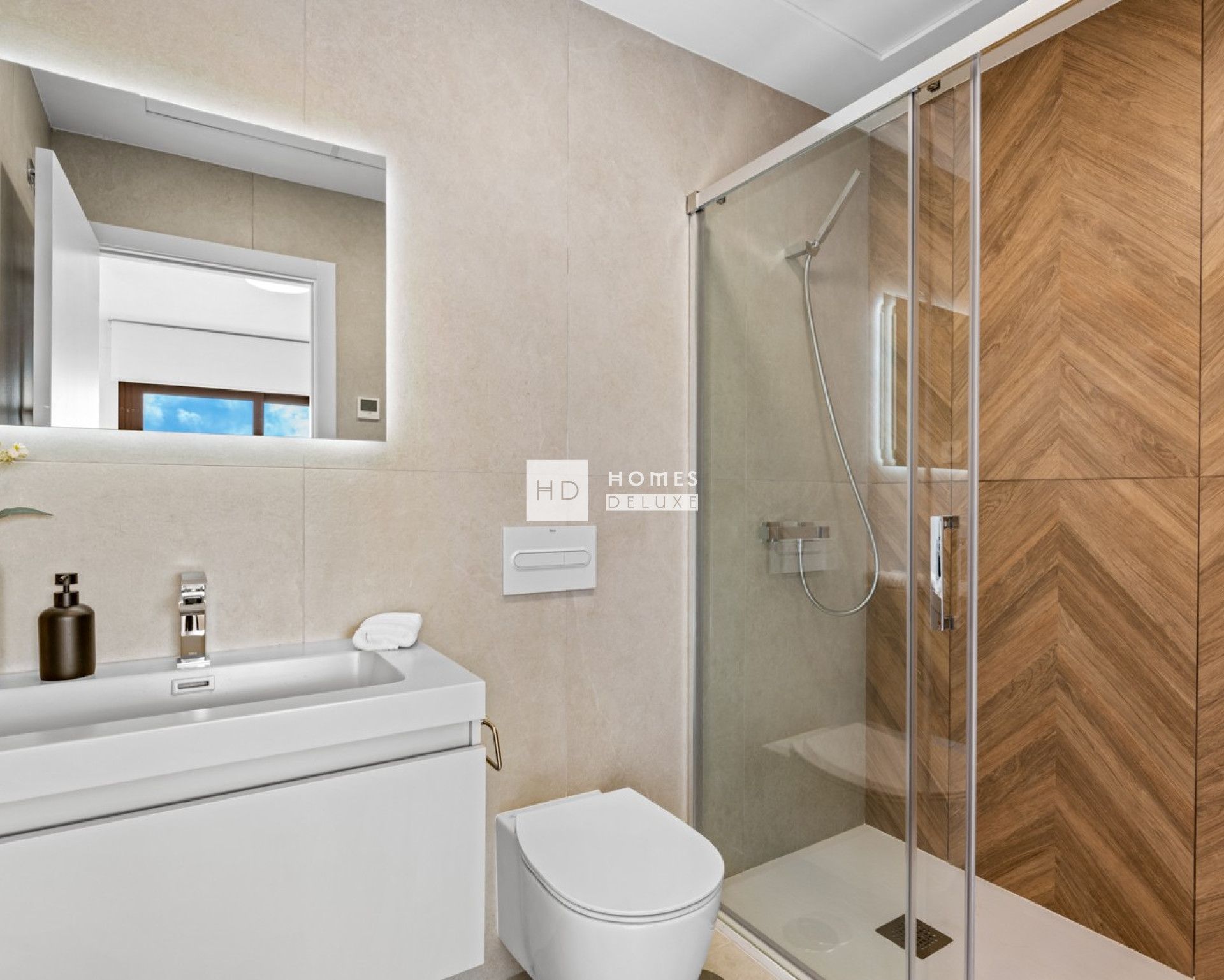 Die Villa erstreckt sich über zwei Ebenen und die Innenaufteilung besteht aus einer Eingangshalle, die zu einem geräumigen, offenen Wohn- und Essbereich mit großen Terrassentüren führt, die Zugang zur Terrasse und zum Garten bieten, einer voll ausgestatteten, modernen Küche im amerikanischen Stil mit einem separaten Wasch- und Abstellraum. Die interne Treppe führt Sie in den ersten Stock mit zwei weiteren Doppelschlafzimmern, beide mit en-suite Badezimmern. Eines der Schlafzimmer und der Flur haben Zugang zur privaten Sonnenterrasse von 15m2. Die interne Treppe führt Sie auch auf die umfangreiche Dachterrasse von 27m2, um die Sonne den ganzen Tag lang zu genießen. Der Garten und die Terrasse bieten viel Platz zum Entspannen rund um den privaten Swimmingpool und zum Essen im Freien, um Familie und Freunde zu unterhalten.