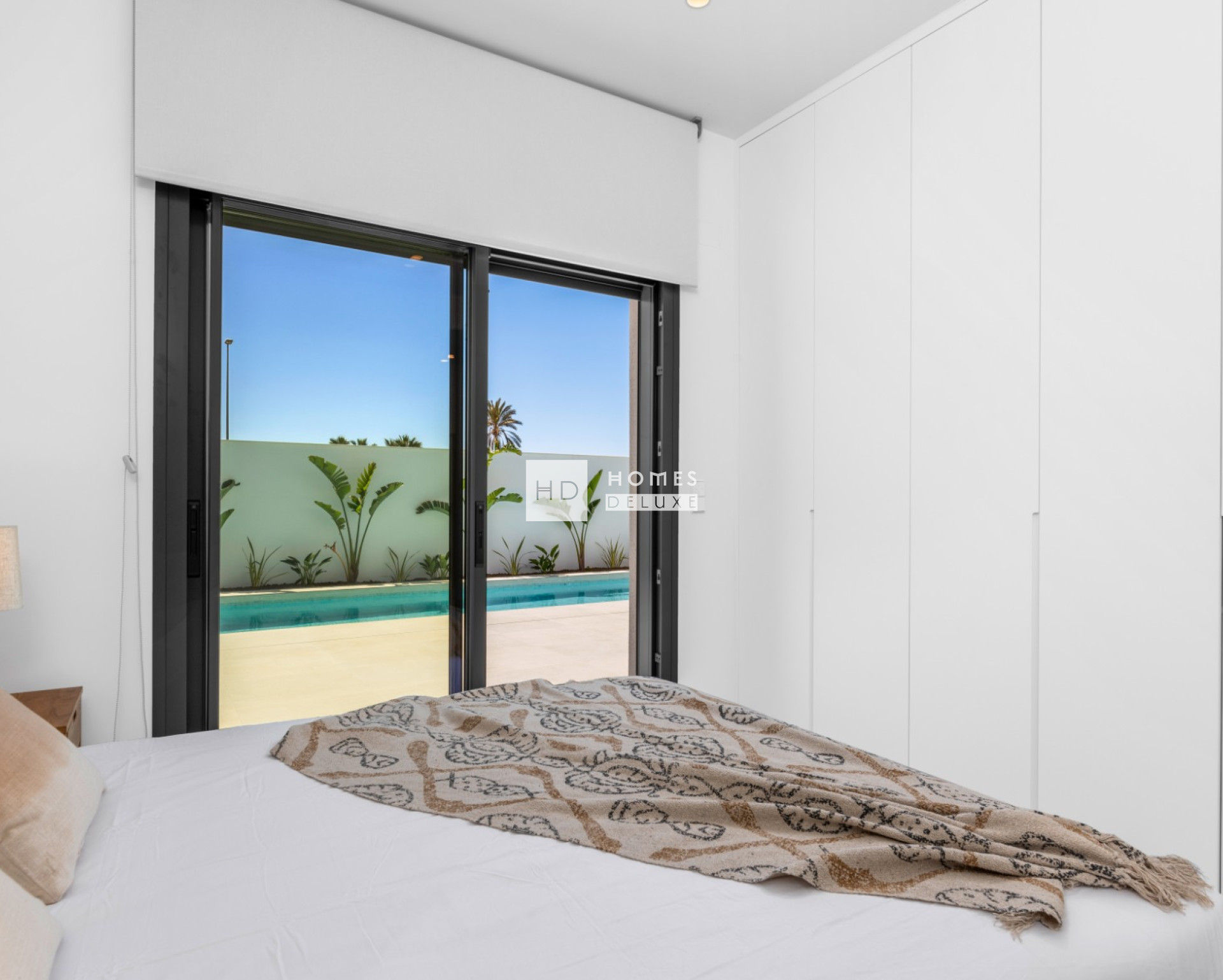 Der Grundriss der Villa ist L-förmig angelegt und besteht aus einem Eingangsbereich, der zum hellen, offenen Wohn- und Essbereich führt, mit extra großen Terrassentüren auf beiden Seiten des Hauses, die Zugang zur Terrasse und zum Garten bieten, einer voll ausgestatteten, modernen Küche im amerikanischen Stil mit separatem Hauswirtschaftsraum / Abstellraum und einem Gäste-WC. Die Villa wurde so konzipiert, dass das Hauptschlafzimmer mit eigenem Bad und begehbarem Kleiderschrank / Ankleidebereich auf einer Seite der Villa liegt und zwei weitere Doppelschlafzimmer und ein separates Gästebad auf der anderen Seite der Villa, so dass Sie Ihre eigene Privatsphäre haben, wenn Gäste zu Besuch kommen. Alle Schlafzimmer haben Terrassentüren zur Terrasse und zum Poolbereich.