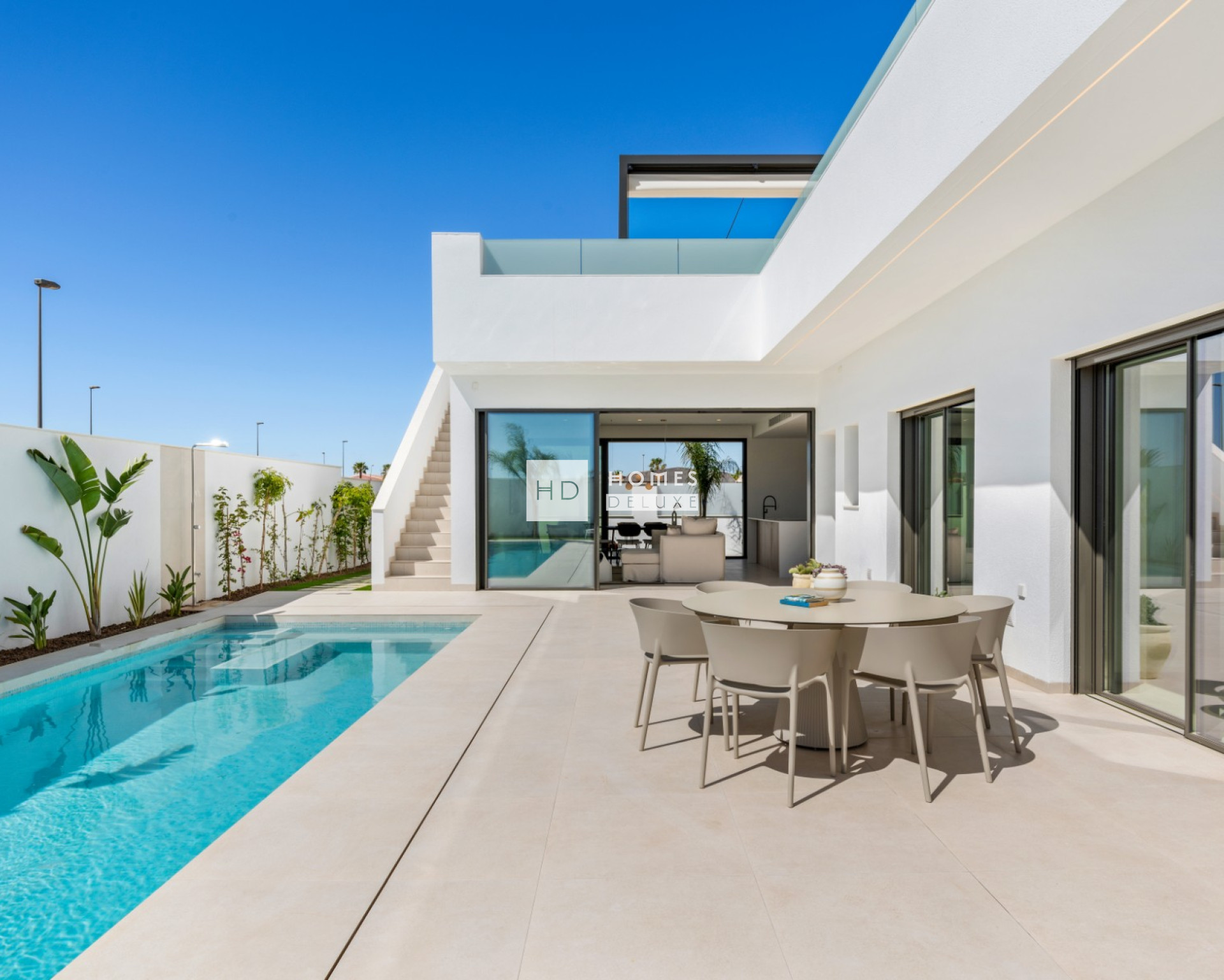 Die Villen sind in einem modernen Stil und mit hochwertigen Oberflächen gebaut und gestaltet. Die Innenräume sind mit großen Fenstern ausgestattet, die viel natürliches Licht in das Haus lassen, und die großzügigen Terrassenbereiche mit einem privaten Swimmingpool machen das Leben im Freien in Spanien zu einem Erlebnis.