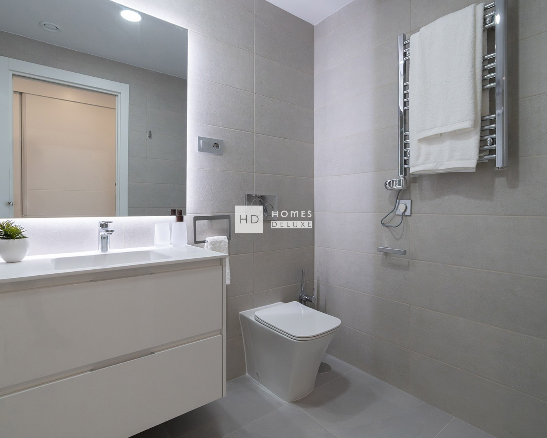 Las distribuciones interiores constan de un amplio salón y comedor con puertas que dan a la terraza acristalada que permite disfrutar de la luminosidad y de las impresionantes vistas, una cocina de diseño contemporáneo totalmente equipada con lavadero independiente, dormitorio principal con baño en-suite y puerta de acceso a la terraza, otro dormitorio doble y un baño de invitados. Las propiedades incluyen aire acondicionado por conductos, calefacción por suelo radiante en los baños, toallero eléctrico en el baño uno, descalcificador de agua comunitario que mejora la calidad del agua del grifo, horno, vitrocerámica y campana extractora en la cocina (otros electrodomésticos son opcionales), armarios empotrados en todos los dormitorios, iluminación LED, sistema de video portero, instalación de equipo de recepción de televisión, todos los apartamentos tienen una plaza de aparcamiento, ya sea en el sótano del edificio o en el aparcamiento al aire libre, todos con pre instalación para un punto de carga para un vehículo eléctrico.