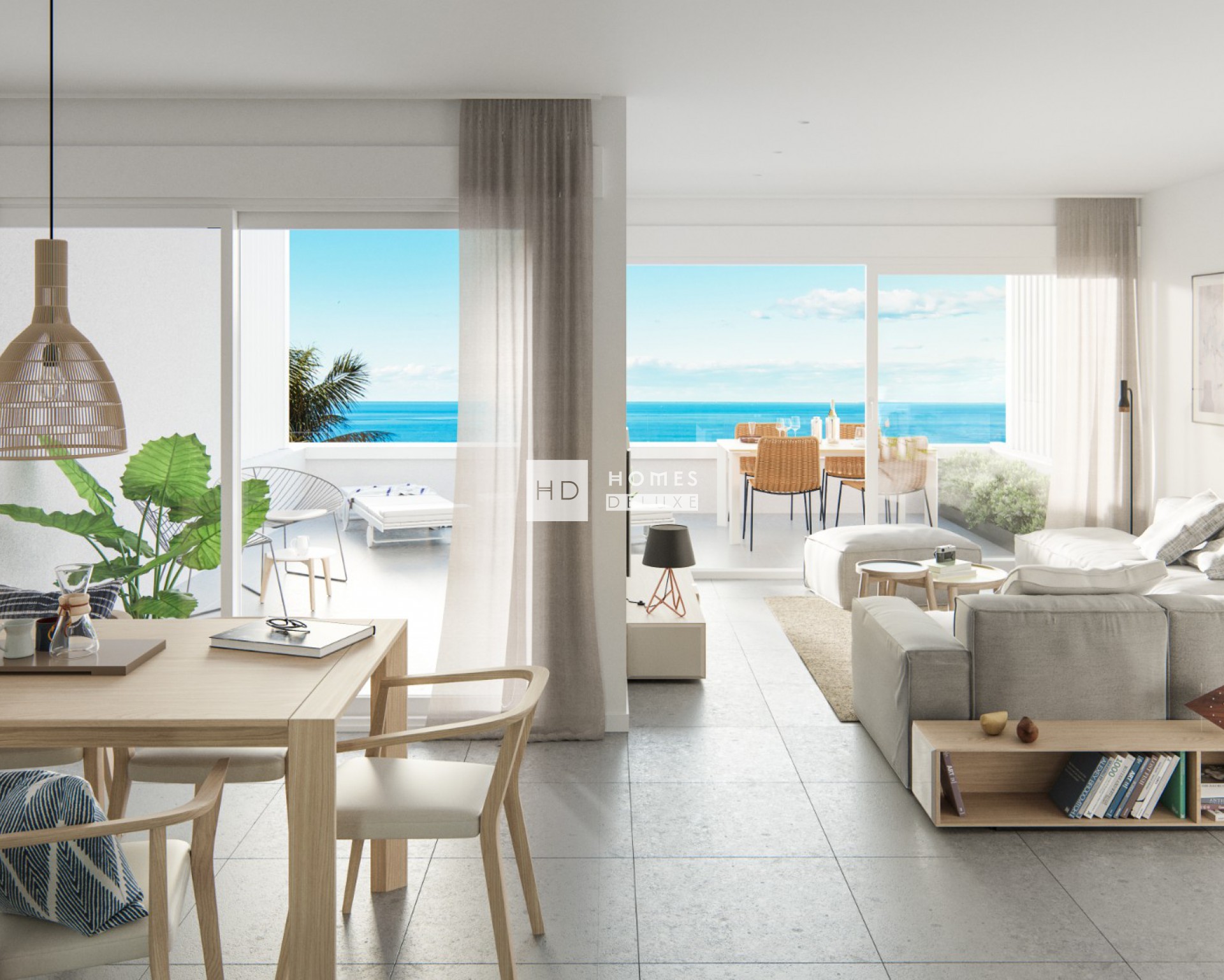 Uno de los objetivos iniciales del proyecto era dotar a las viviendas de una zona exterior amplia y privada. Por ello, se ha diseñado una gran terraza con vistas al mar. Todas las estancias interiores principales de la vivienda están directamente comunicadas con la terraza, con mucha luz natural gracias a los grandes ventanales acristalados y mezclando el exterior con los espacios interiores. Hay una pérgola exterior que se ha diseñado para filtrar y proteger la vivienda de la luz solar durante el día, lo que permite una mayor flexibilidad a la hora de utilizar la zona exterior durante todo el año. Un sistema de protección sostenible, que garantiza la sombra durante los días más calurosos del verano, y permite que la luz del sol entre en la vivienda durante el invierno. Esto proporciona una forma natural de controlar la temperatura, con claros beneficios energéticos para la propiedad.