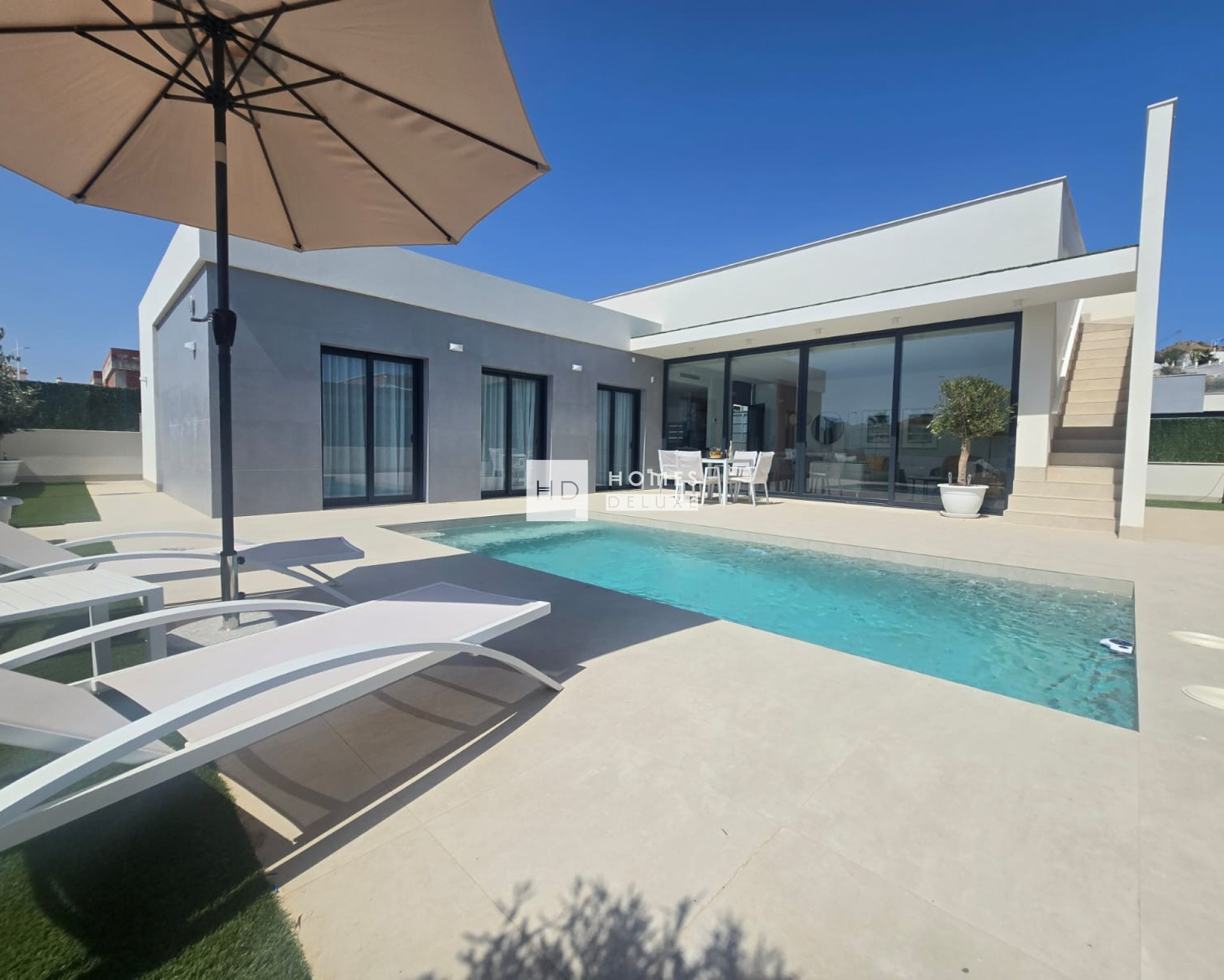 Este modelo de villa en particular cuenta con 3 dormitorios y 2 baños, la distribución interior consta de un amplio y luminoso salón de planta abierta y comedor con grandes ventanales en todo el espacio de vida creando un montón de luz natural y con vistas a la zona de jardín y piscina, una cocina moderna totalmente equipada de estilo americano (algunas villas incluyen un lavadero independiente), dormitorio principal con baño en-suite, otros dos dormitorios dobles, todas las habitaciones con puerta de acceso a la terraza, y un baño de invitados. Una escalera exterior conduce al amplio solarium de la azotea, de entre 47m2 y 58m2, para disfrutar del sol durante todo el día y que incluye una cocina de verano, perfecta para comer al aire libre. La planta baja disfruta de una gran terraza y zona ajardinada, incluyendo una piscina privada de 6x3 metros, y aparcamiento privado independiente en la parcela para dos vehículos.