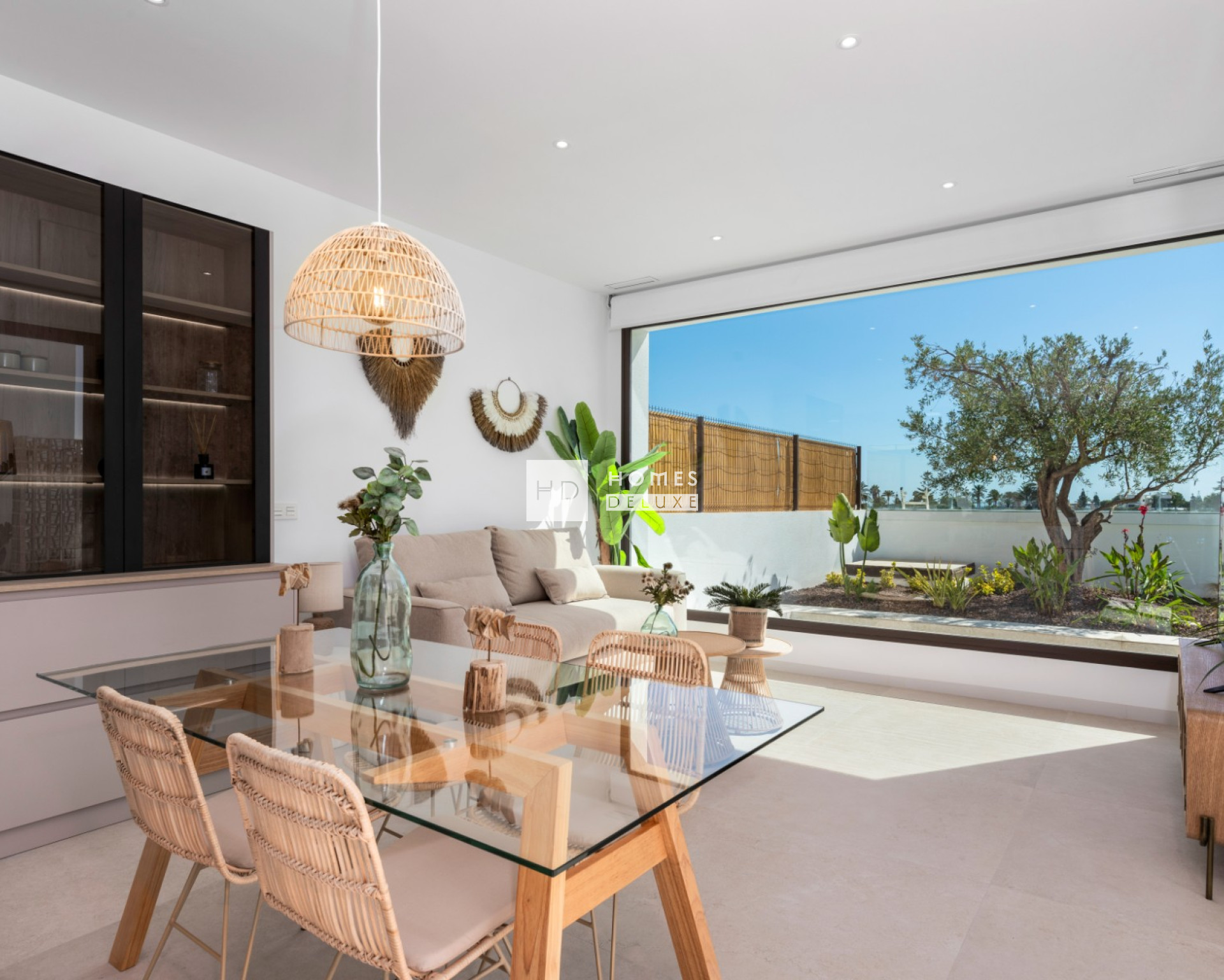 La distribución interior consta de un vestíbulo de entrada que conduce al luminoso y espacioso salón de planta abierta y comedor con grandes ventanales que dan a la terraza, una moderna cocina americana totalmente equipada, dormitorio principal con baño en-suite, vestidor y puerta de acceso a la terraza y la piscina, otros dos dormitorios dobles y un baño de invitados. Se puede acceder al solarium opcional de la azotea a través de una escalera exterior en la terraza. Las viviendas incluyen preinstalación de aire acondicionado por conductos, armarios empotrados en todos los dormitorios, iluminación LED interior y exterior, persianas eléctricas en todos los dormitorios, sistema de video portero, piscina privada con pre instalación de bomba de calor y plaza de aparcamiento privada en la parcela.