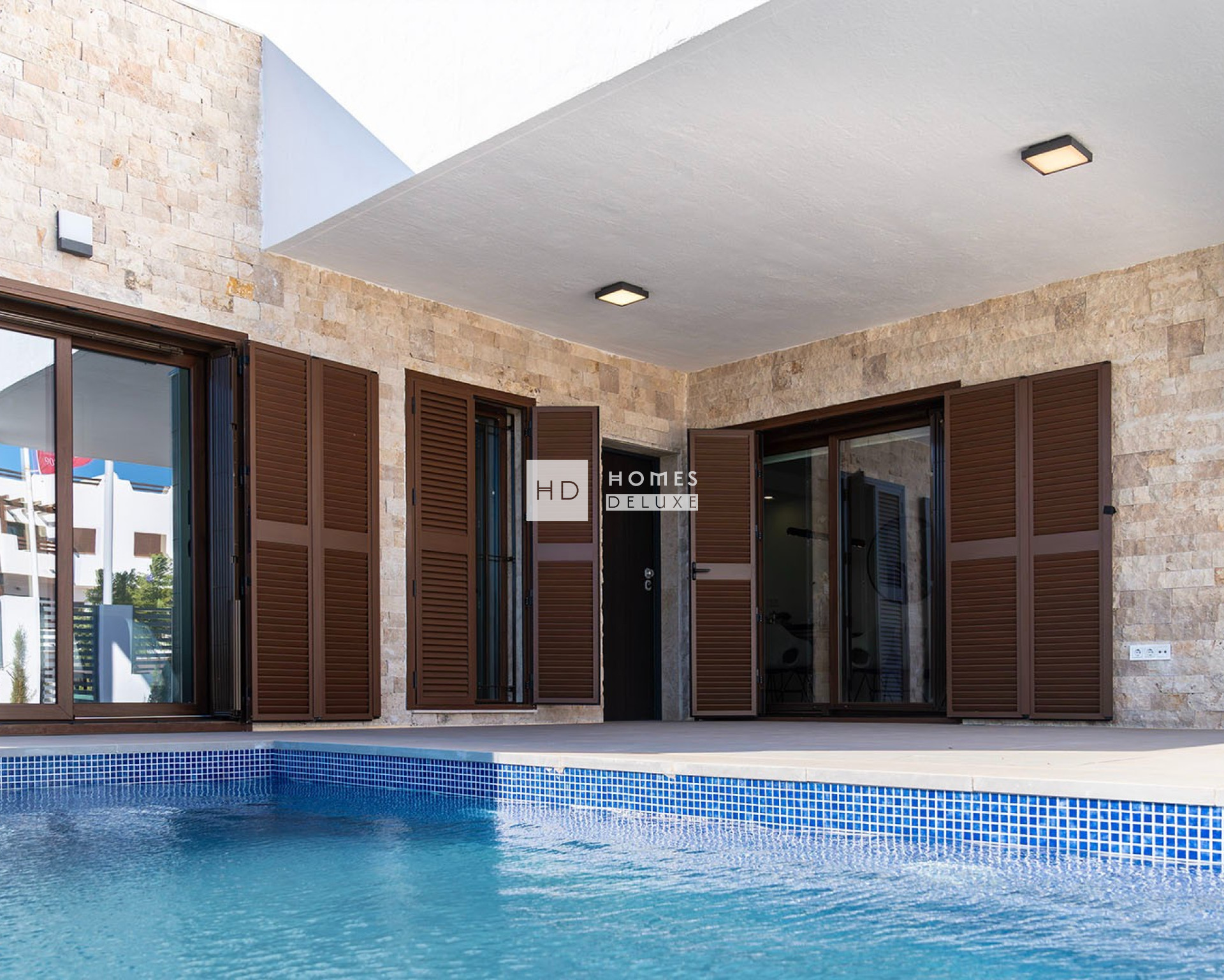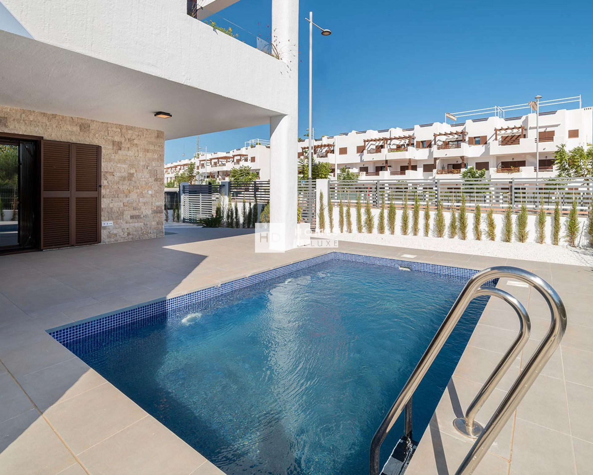 La distribución interior consta de un vestíbulo de entrada que conduce al luminoso salón de planta abierta y comedor con varias puertas que dan acceso a la terraza, una moderna cocina americana totalmente equipada con un lavadero independiente, la planta baja también incluye un dormitorio doble con puerta de acceso a la terraza, y un baño de invitados. La escalera interior conduce a la primera planta con otros dos dormitorios dobles, ambos con acceso a una terraza privada, y un segundo cuarto de baño de invitados. La escalera interior también da acceso a la amplia azotea solarium de 42m2 y el amplio nivel del sótano incluyendo patio Inglés que crea un montón de luz natural en todo el espacio. El nivel del sótano le permite la oportunidad de ampliar el espacio de vida a sus necesidades y requerimientos. Hay varios extras opcionales para elegir, incluyendo la elección de diferentes paquetes de muebles para amueblar las villas a un nivel muy alto.