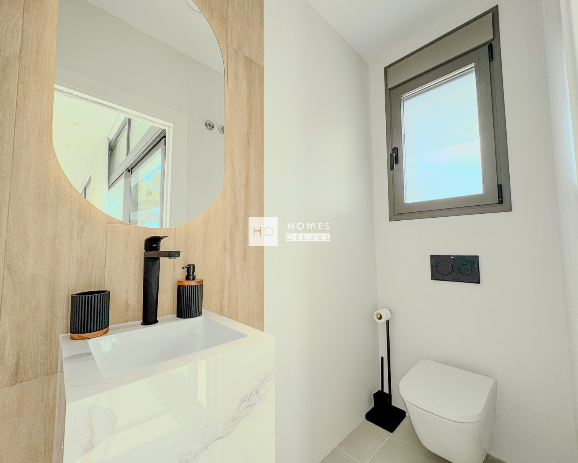 Las villas también han sido diseñadas para aprovechar al máximo los espacios interiores, la distribución consta de un vestíbulo de entrada que conduce al luminoso y espacioso salón de planta abierta y comedor con grandes ventanales que permiten el máximo flujo de luz natural en toda la propiedad, así como la apertura a la terraza exterior y la zona de la piscina. Dentro de la sala de estar principal es una cocina americana totalmente equipada con isla central y muebles de línea moderna. La propiedad también cuenta con un lavadero y aseo de invitados. El impresionante dormitorio principal incluye un amplio dormitorio con baño en-suite y vestidor con estantes, cajones y espacio para colgar en acabado cristalino opaco o semi translúcido. Hay otros dos dormitorios dobles de buen tamaño, todas las habitaciones tienen acceso a la terraza principal, y también hay un baño de invitados. En el lado de la propiedad es una escalera que conduce a un área de almacenamiento útil de 41m2.