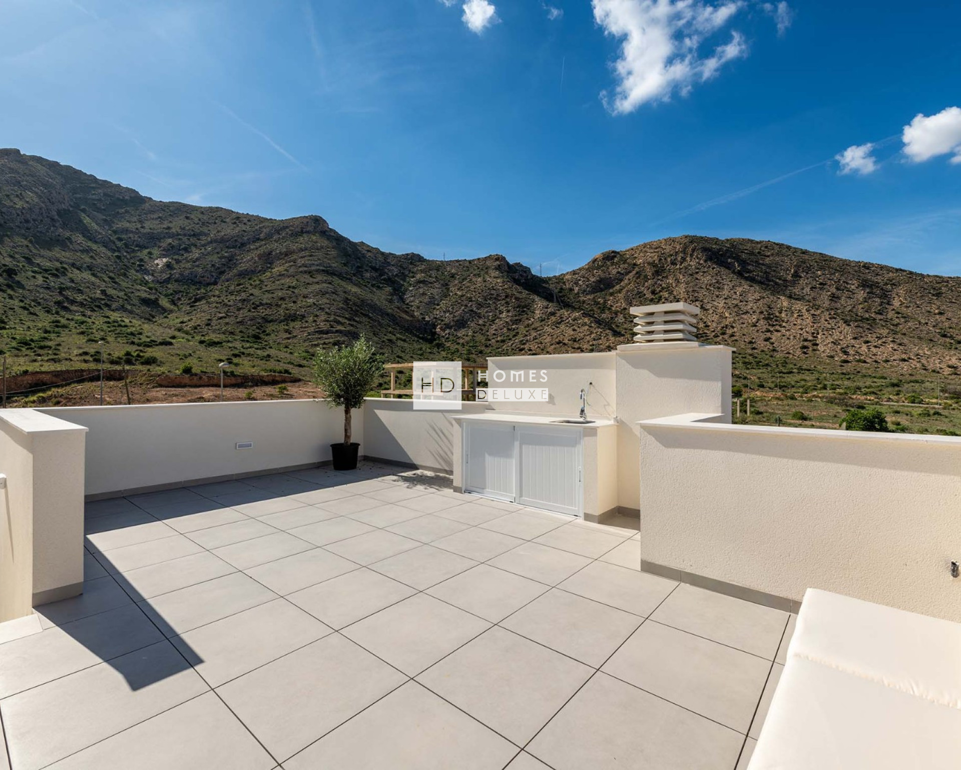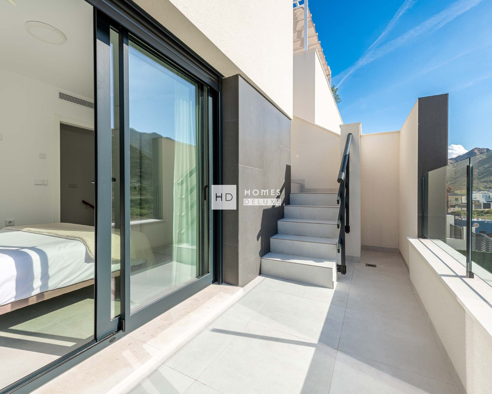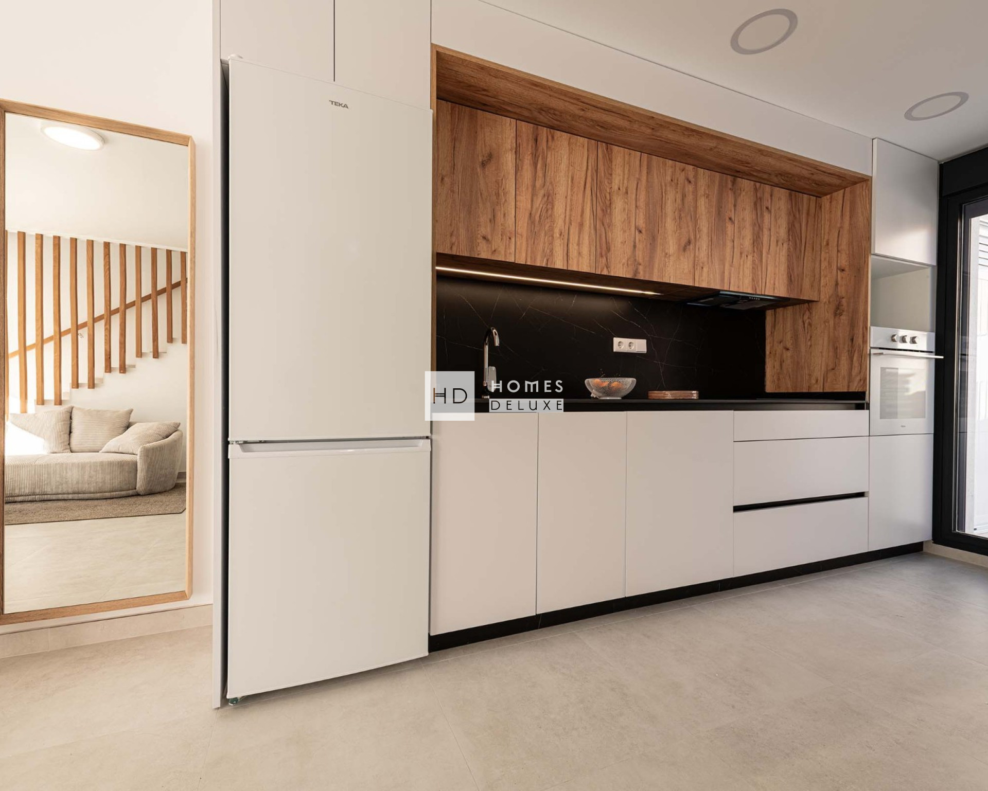 La vivienda se distribuye en dos niveles con un solarium en la azotea. La distribución interior consta de un amplio salón de planta abierta y comedor con grandes ventanales que dan a la terraza delantera. Dentro de la sala de estar principal es una cocina americana totalmente equipada con encimera de Silestone, la cocina tiene una puerta de acceso al patio trasero de 19m2. La planta baja también incluye un dormitorio doble y un baño de invitados. La escalera interior conduce a la primera planta con el gran dormitorio principal que tiene acceso a la terraza del primer piso. Hay otro dormitorio doble de buen tamaño y un segundo cuarto de baño de invitados. La terraza del primer piso tiene una escalera exterior que conduce a la amplia azotea solarium de 32m2 incluyendo una cocina de verano, ideal para disfrutar de cenas al aire libre en el sol todo el día.