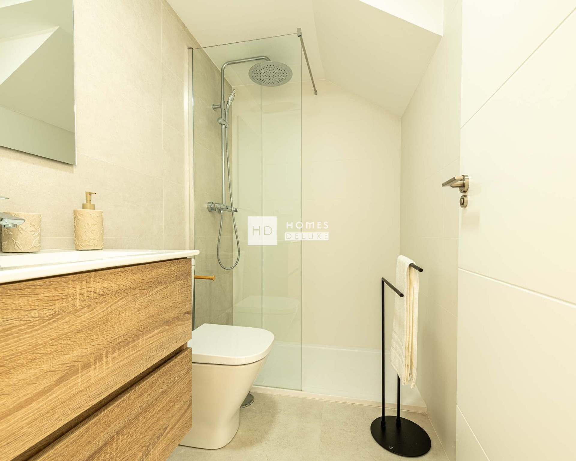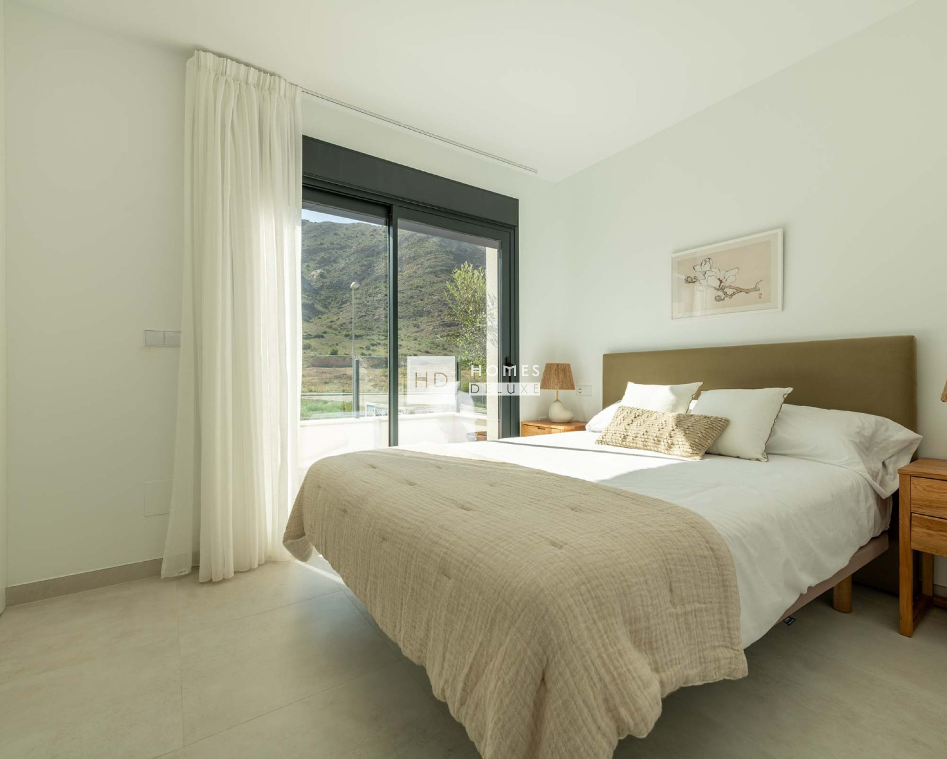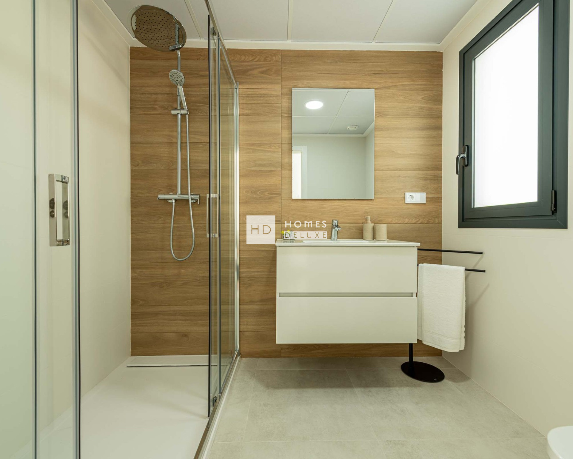 La vivienda se distribuye en dos niveles con un solarium en la azotea. La distribución interior consta de un amplio salón de planta abierta y comedor con grandes ventanales que dan a la terraza delantera. Dentro de la sala de estar principal es una cocina americana totalmente equipada con encimera de Silestone, la cocina tiene una puerta de acceso al patio trasero de 19m2. La planta baja también incluye un dormitorio doble y un baño de invitados. La escalera interior conduce a la primera planta con el gran dormitorio principal que tiene acceso a la terraza del primer piso. Hay otro dormitorio doble de buen tamaño y un segundo cuarto de baño de invitados. La terraza del primer piso tiene una escalera exterior que conduce a la amplia azotea solarium de 32m2 incluyendo una cocina de verano, ideal para disfrutar de cenas al aire libre en el sol todo el día.