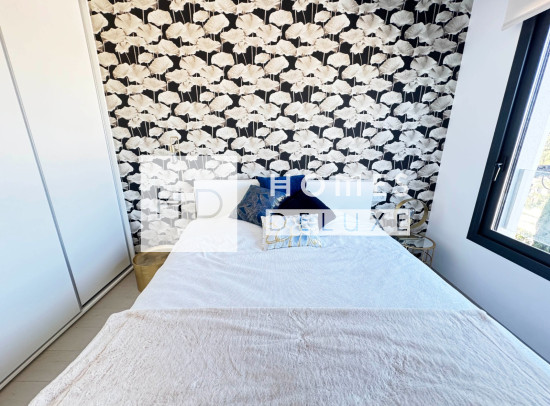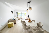 El interior ha sido diseñado con un acabado de lujo con equipamiento de primera calidad. La distribución consta de un vestíbulo de entrada que conduce al luminoso y espacioso salón de planta abierta y comedor con grandes ventanales con vistas a la terraza y al jardín. Dentro de la sala de estar principal es una cocina americana totalmente equipada acabado en blanco con un diseño elegante característica donde el área de preparación de alimentos puede ser totalmente cerrado cuando no esté en uso. El gran dormitorio principal incluye un cuarto de baño con ducha de lluvia, armarios empotrados, y también tiene acceso a la terraza principal. Hay otros dos dormitorios dobles de buen tamaño con vistas al paisaje verde en la parte trasera de la propiedad, ambos dormitorios incluyen armarios empotrados, y hay un baño de invitados con ducha de lluvia. La propiedad ha sido diseñada y decorada con buen gusto con tonos neutros, incluyendo azulejos de color madera clara en todo el apartamento que se extienden a la terraza que une los espacios interiores y exteriores en uno. La propiedad se vende completamente amueblada, e incluye instalación completa de aire acondicionado, calefacción por suelo radiante en ambos baños, sistema de domótica con Domótica, persianas interiores eléctricas, y aparcamiento subterráneo privado con trastero.